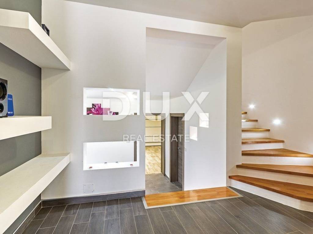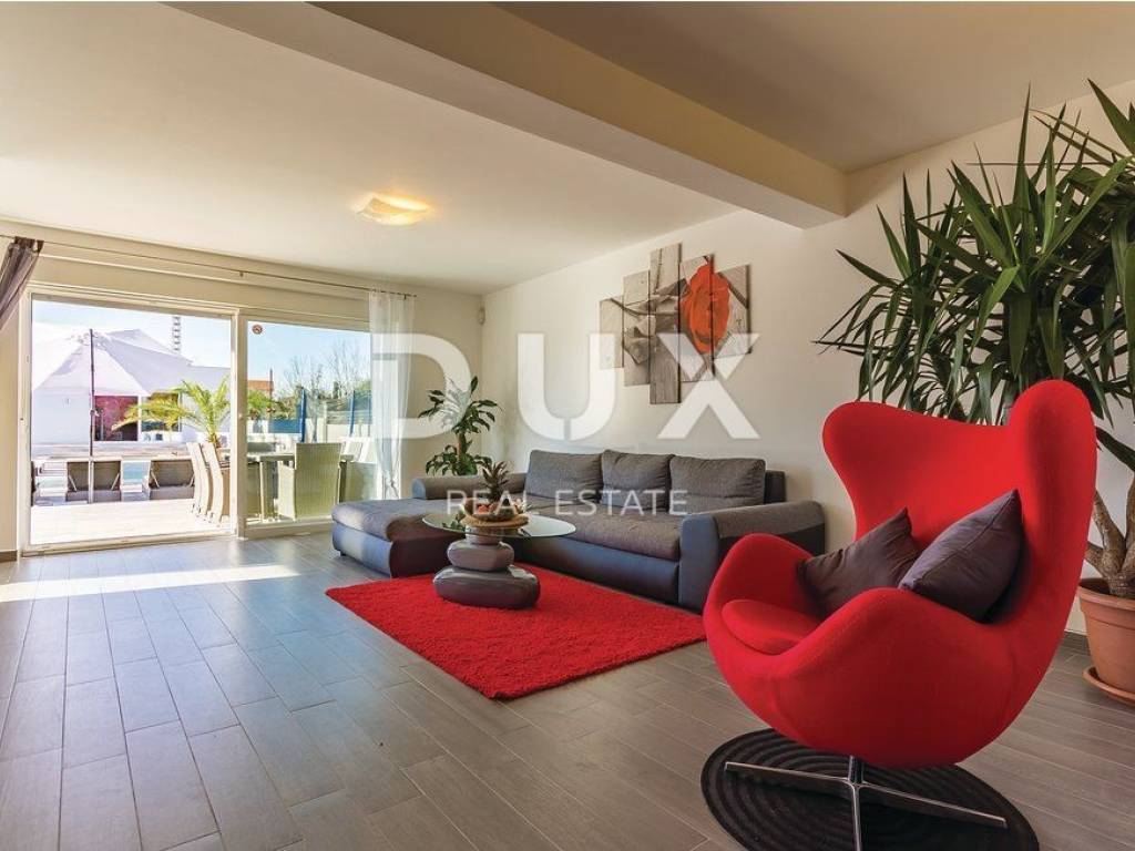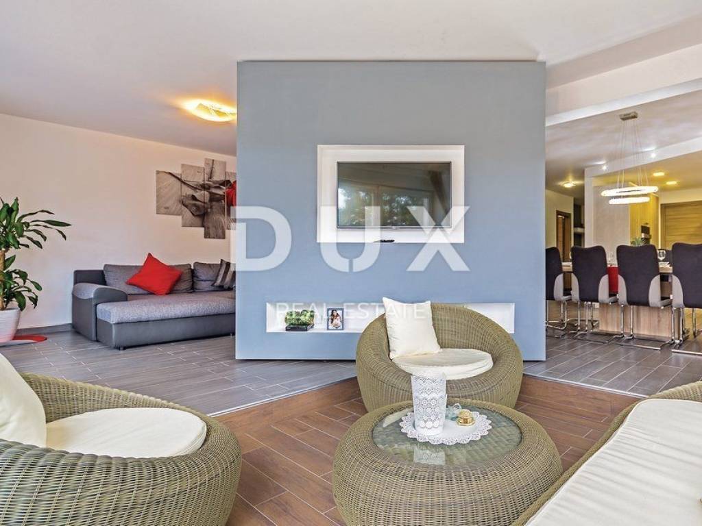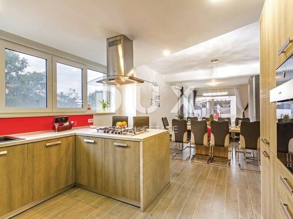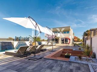 In the landscaped garden there is an auxiliary building equipped with an outdoor bar and fireplace, while inside the building there is a playroom equipped with a billiard table, table football, training equipment and television. In addition to the auxiliary building there is a swimming pool of 40 m2 with a separate jacuzzi, sun deck, children's park, table tennis table and a green area enriched with olives and fruit trees. On the roof of the main building there is a large space that can be converted into a roof terrace, while in the basement there is a large open space of 100 m2. The owner owns both projects, for arranging the roof terrace and the basement space into a relaxation zone equipped with a small cinema hall and a wellness zone. The property is modernly designed and built and is fully equipped with premium materials and modern details and one that stands out is the movable wall with the TV in the living room that can be rotated 360 degrees.