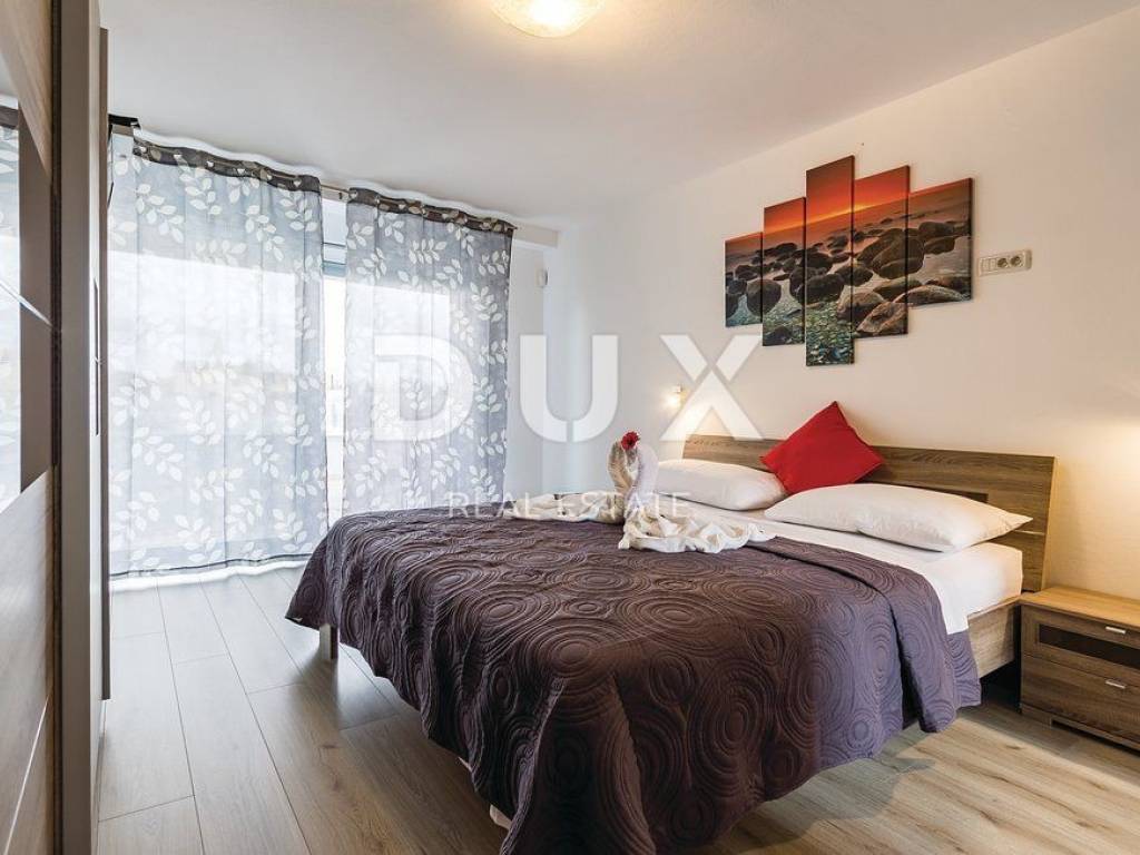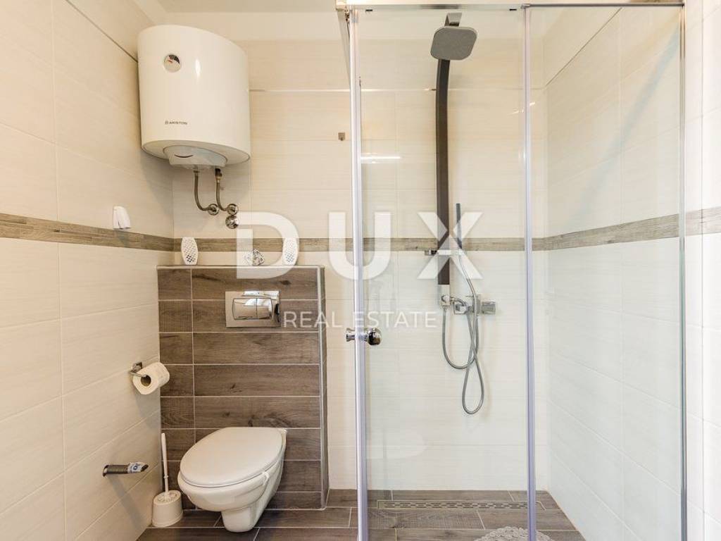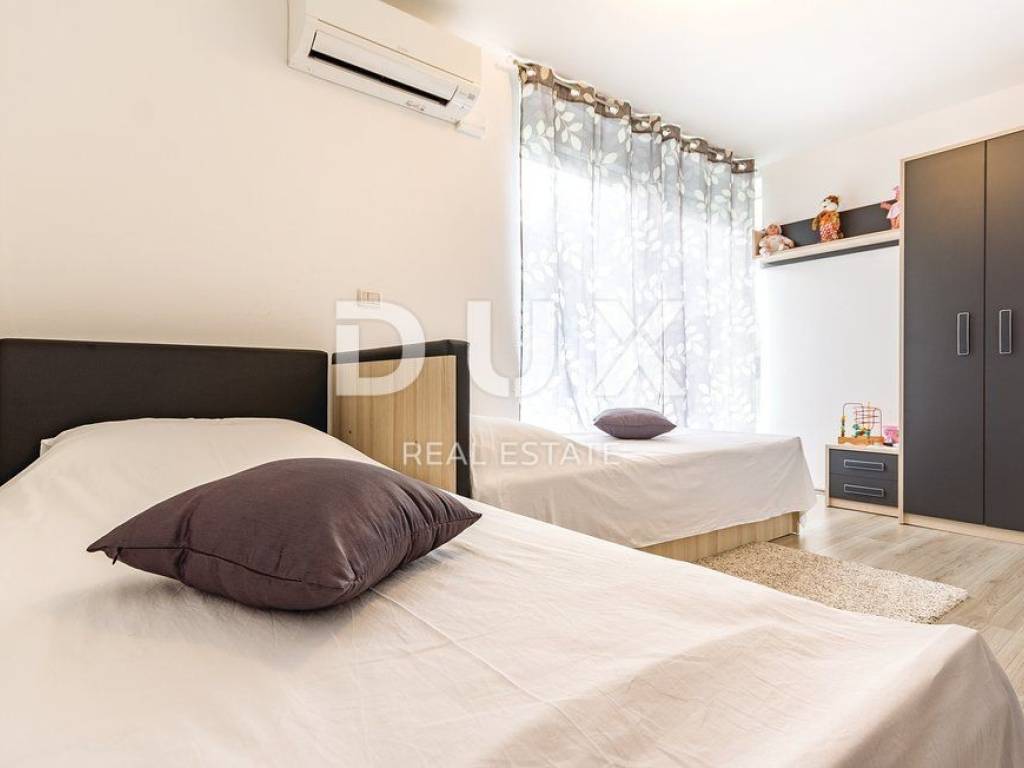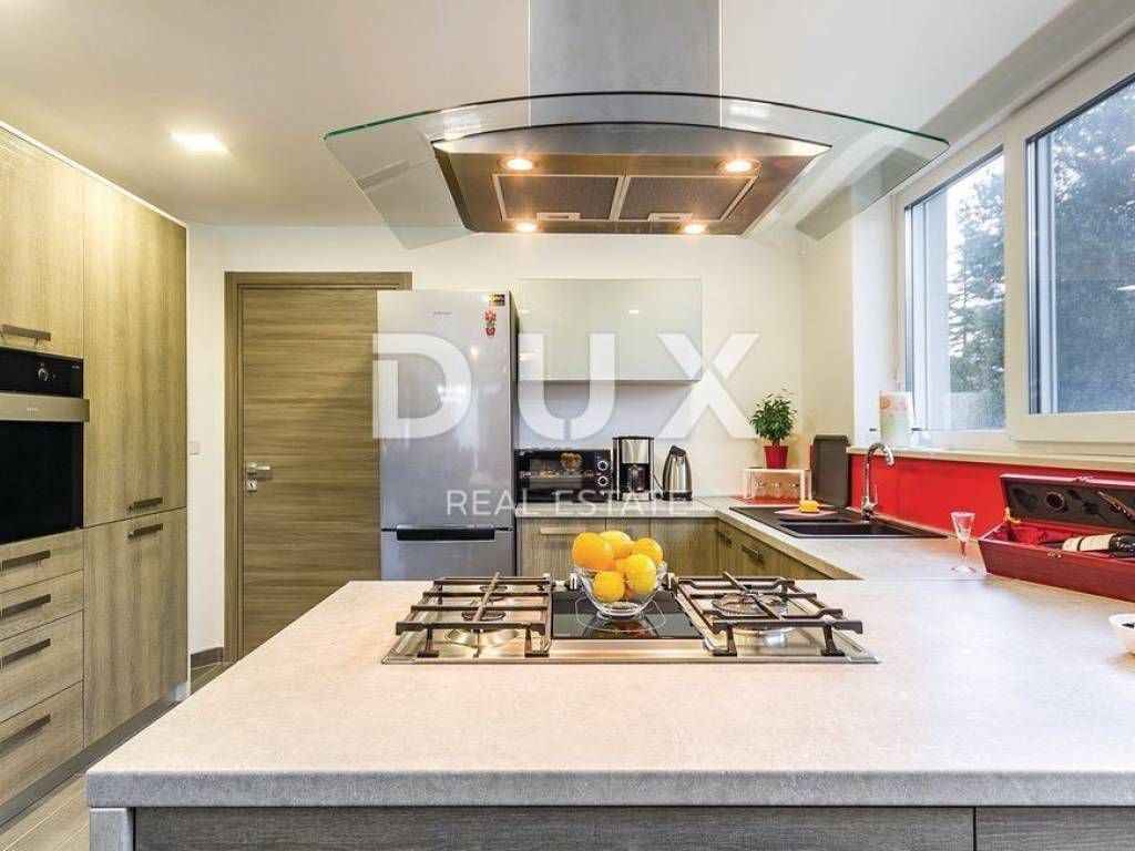 In the landscaped garden there is an auxiliary building equipped with an outdoor bar and fireplace, while inside the building there is a playroom equipped with a billiard table, table football, training equipment and television. In addition to the auxiliary building there is a swimming pool of 40 m2 with a separate jacuzzi, sun deck, children's park, table tennis table and a green area enriched with olives and fruit trees. On the roof of the main building there is a large space that can be converted into a roof terrace, while in the basement there is a large open space of 100 m2. The owner owns both projects, for arranging the roof terrace and the basement space into a relaxation zone equipped with a small cinema hall and a wellness zone. The property is modernly designed and built and is fully equipped with premium materials and modern details and one that stands out is the movable wall with the TV in the living room that can be rotated 360 degrees.