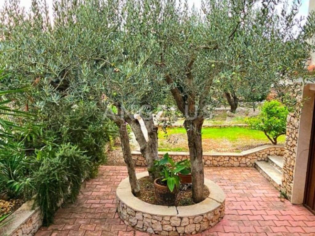 The entire garden is landscaped, many Mediterranean plants, olives, and various trees are planted, and the entire garden is bordered by stone walls.