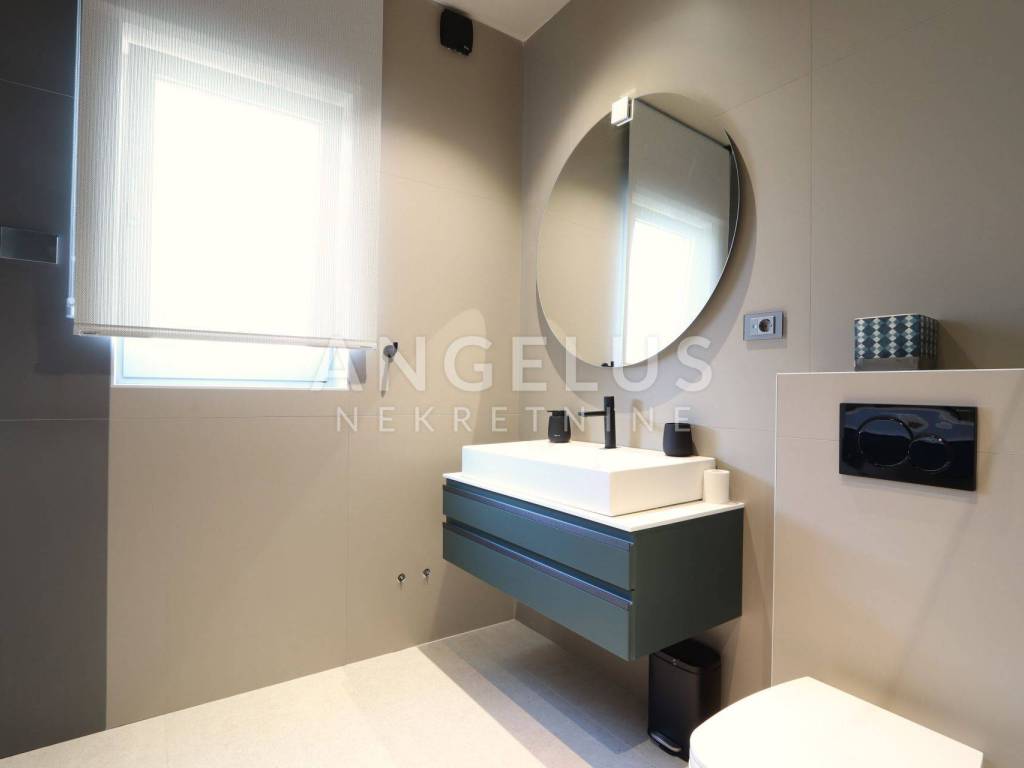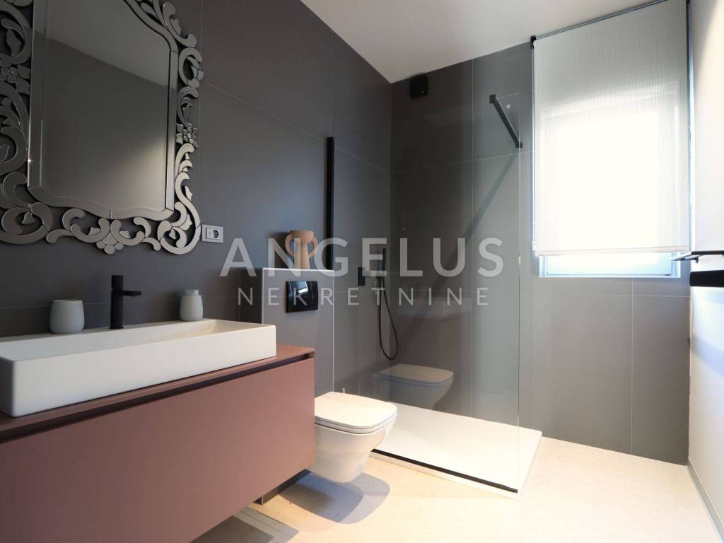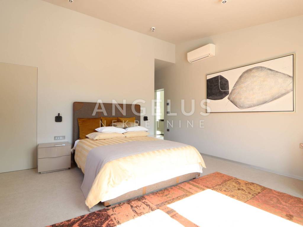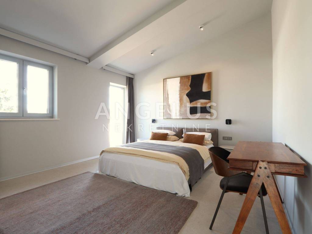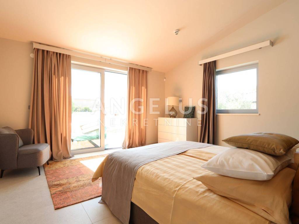 On the ground floor there is a large living room, kitchen and dining room in an open space concept with large glass walls that are oriented towards the outdoor heated pool, also the southern side of the building. This orientation guarantees sunshine throughout the day and heats the space in the winter months. The house is equipped with a highly efficient air conditioning system in each room and underfloor heating in all rooms of the building. The kitchen is fully equipped, while the rest of the house is furnished with quality designer furniture from renowned brands. The house is being sold fully furnished, identical to what can be seen in the pictures. The house was just built and no one has lived in it for a long time, the furniture is new and unused. It should be noted that materials from renowned manufacturers were used during construction, which guarantee quality and durability.