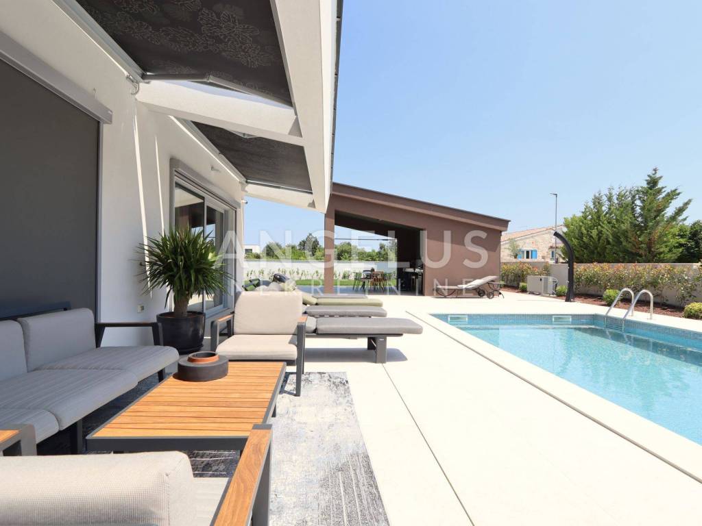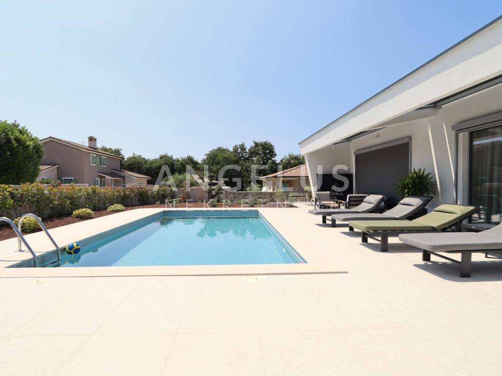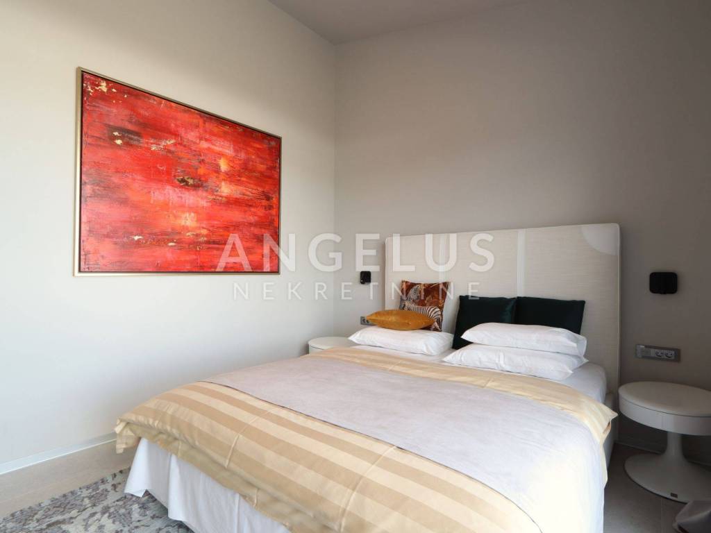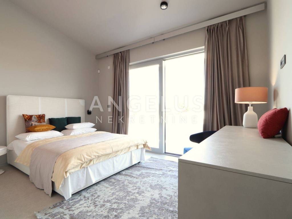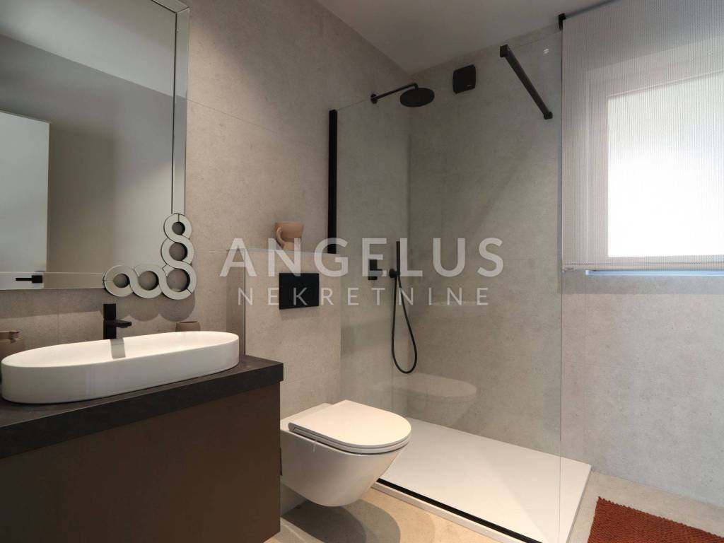 On the ground floor there is a large living room, kitchen and dining room in an open space concept with large glass walls that are oriented towards the outdoor heated pool, also the southern side of the building. This orientation guarantees sunshine throughout the day and heats the space in the winter months. The house is equipped with a highly efficient air conditioning system in each room and underfloor heating in all rooms of the building. The kitchen is fully equipped, while the rest of the house is furnished with quality designer furniture from renowned brands. The house is being sold fully furnished, identical to what can be seen in the pictures. The house was just built and no one has lived in it for a long time, the furniture is new and unused. It should be noted that materials from renowned manufacturers were used during construction, which guarantee quality and durability.