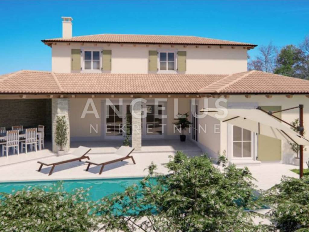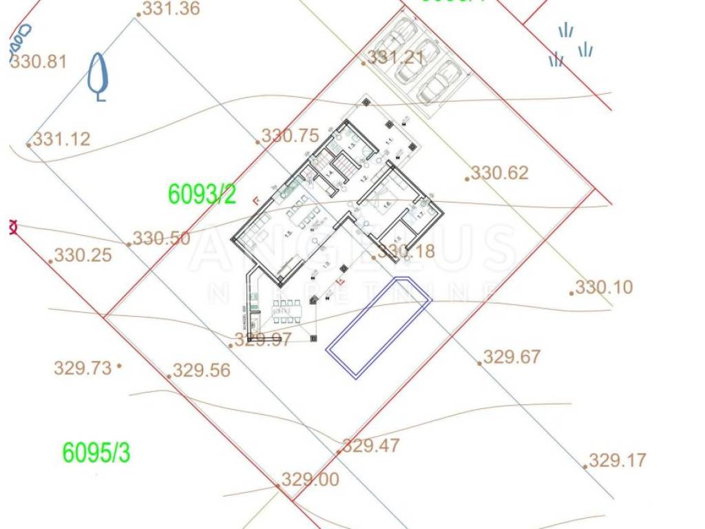 The property is located on a plot of 766 m2, in the central part next to the terrace is dominated by a swimming pool measuring 8x4 m with a beach lined with traditional Istrian stone, designed in a concept that provides intimacy in relation to the surrounding facilities. The covered car park will be paved with concrete slabs. The facade of the building will be constructed in the form of a thermal facade 10 cm thick in combination with Istrian stone, and the roof will be made of wooden beams with stone wool insulation with tiles as a cover. The property is designed to face south to ensure maximum sunlight throughout the day.
