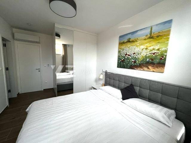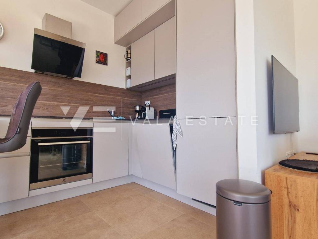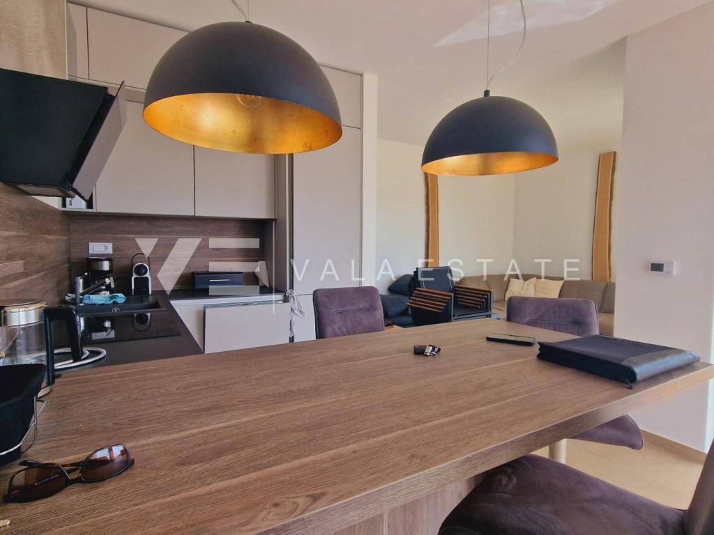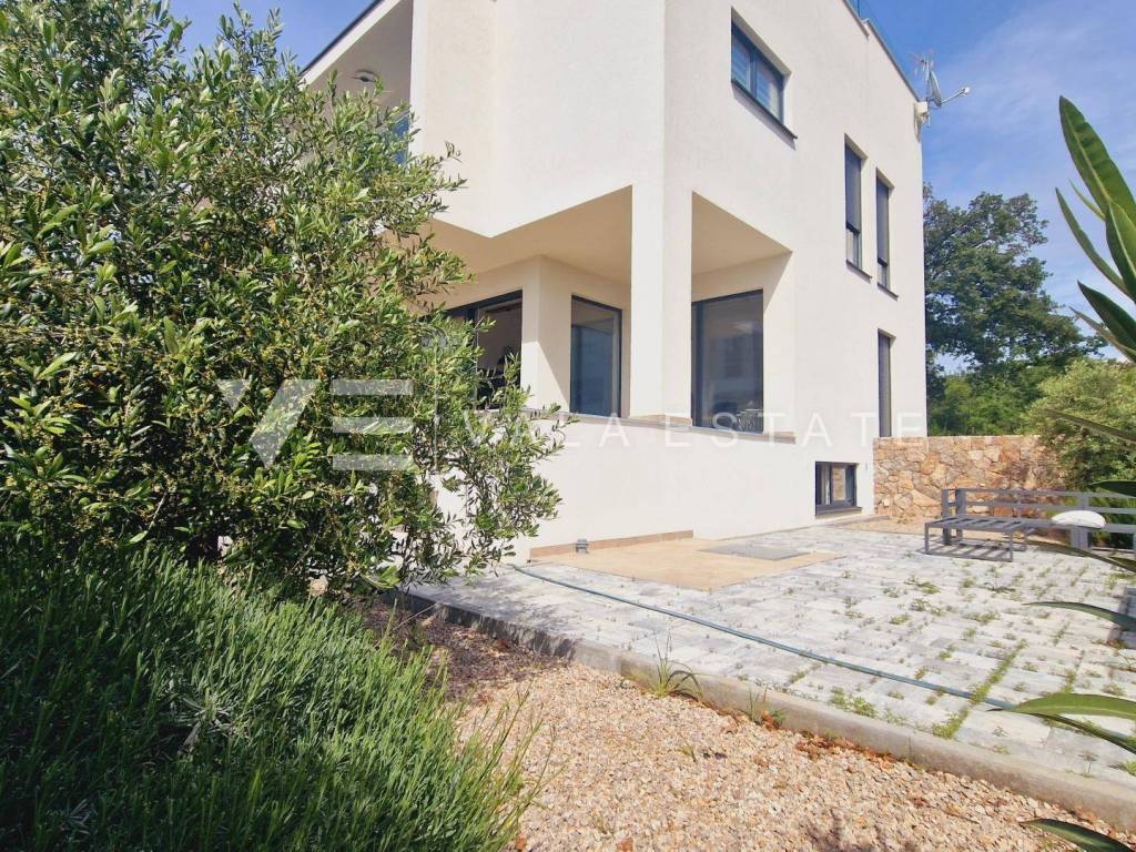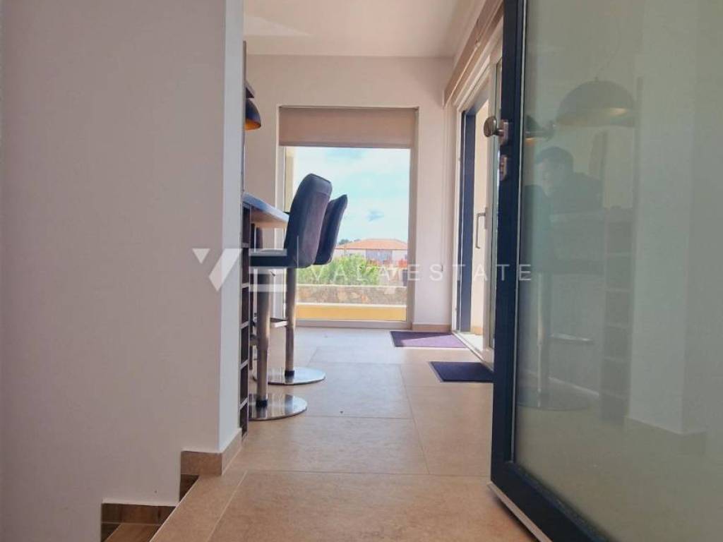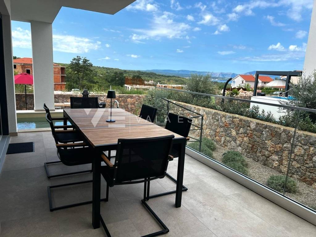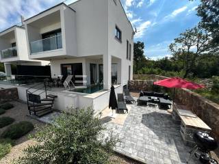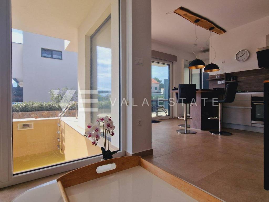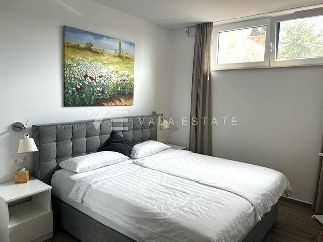 Real estate island Krk, Njivice - in a beautiful and quiet location, a modern two-story apartment with a total living area of 77 m2 with its own garden and swimming pool is for sale. The apartment is located on the ground floor, where there is a living room with a kitchen and dining room and an exit to a terrace of 15 m2 and a garden with a swimming pool, and in the basement there are two bedrooms, two bathrooms and two storage rooms. The apartment is fully furnished and well-equipped, air-conditioned, has underfloor heating, PVC joinery and security doors. It has two parking spaces on the common garden. Beautiful and quiet location 600 m from beautiful beaches and not far from the town center.