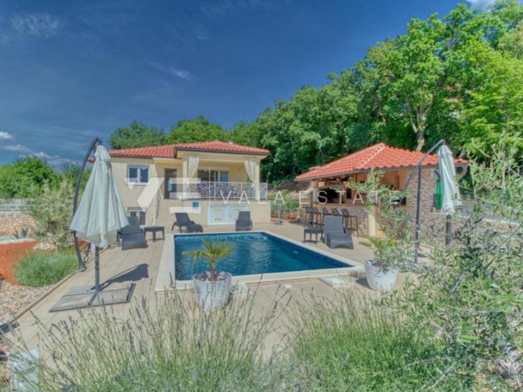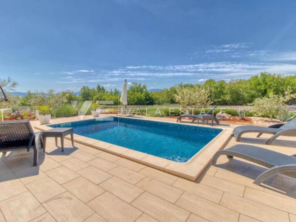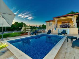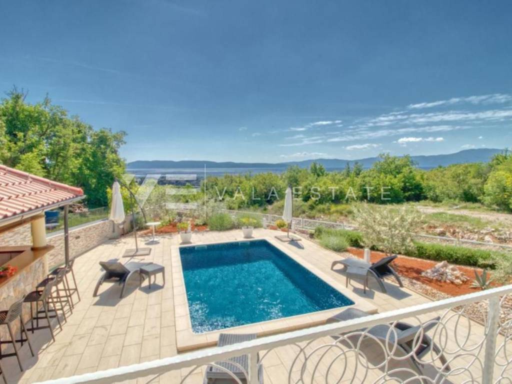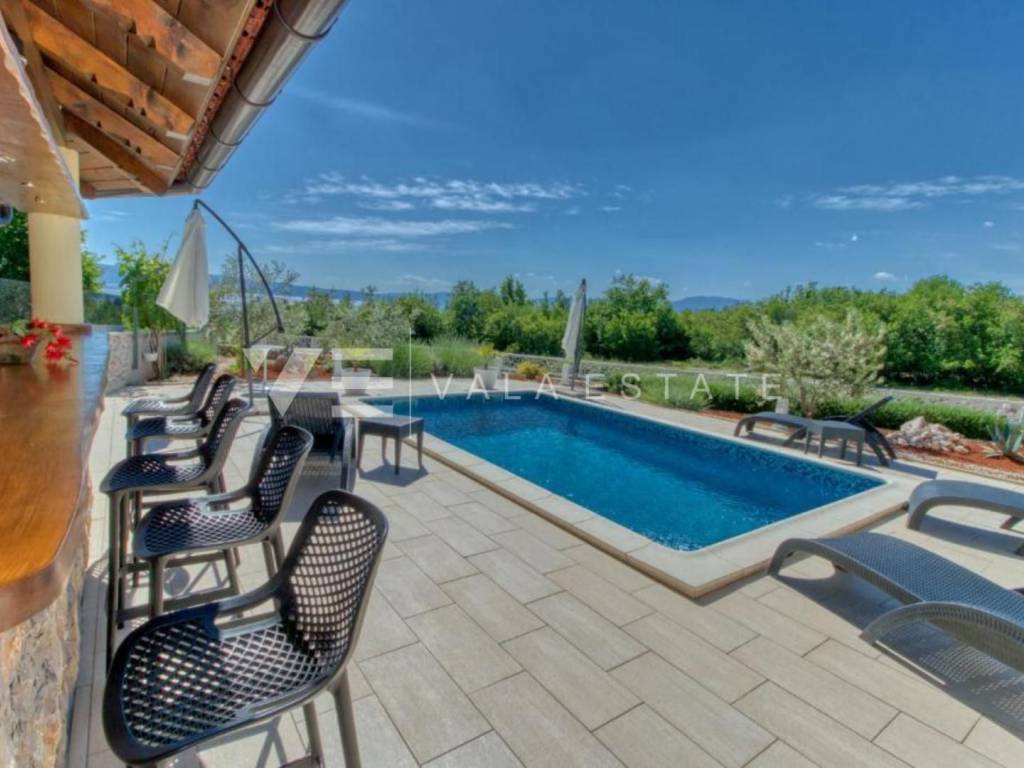 Real estate island of Krk, Malinska, Omišalj - for sale is a detached house with an area of 260 m2 divided into two separate apartments, one of which is on the ground floor and the other on the first floor. Both apartments are equally distributed and consist of an entrance hall, bathroom, two bedrooms, kitchen with dining room and living room with access to a covered terrace. The house is built of quality materials, the floor is covered with ceramics, it is air-conditioned, has PVC joinery and is fully furnished and equipped. There is a swimming pool, sundeck, summer kitchen, covered terrace, garage for one car, storage room and several parking spaces on the beautifully landscaped garden. An excellent opportunity for investment for the purposes of tourist rental, but also for own housing.