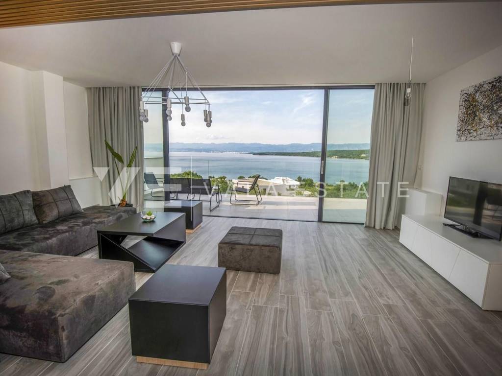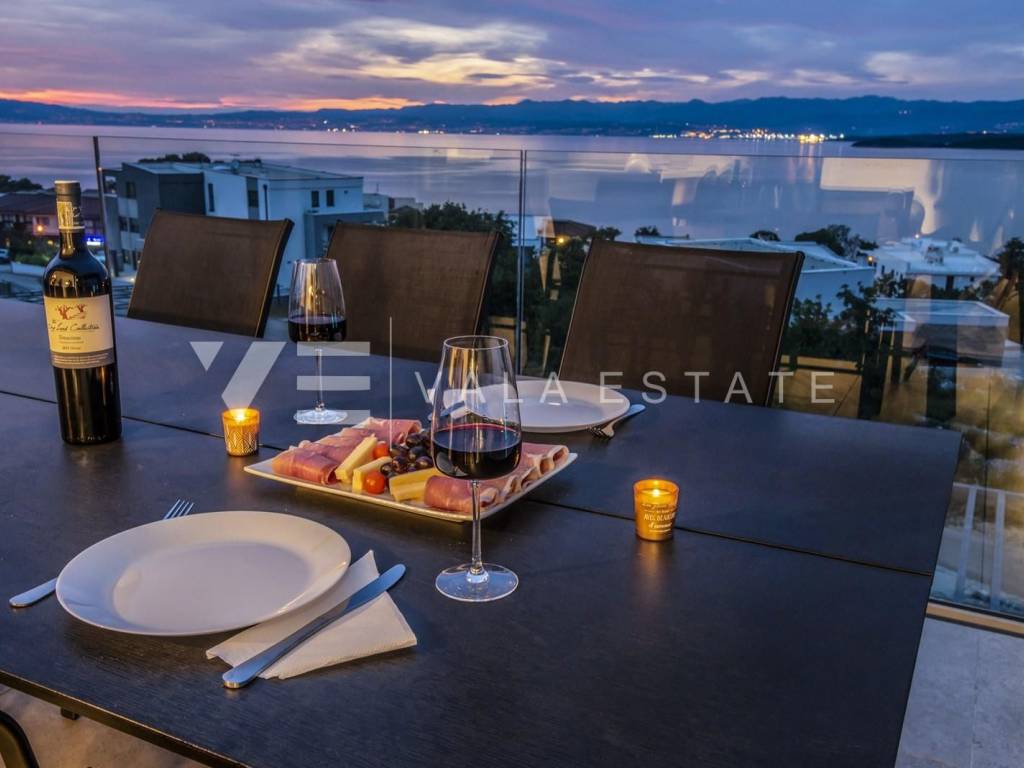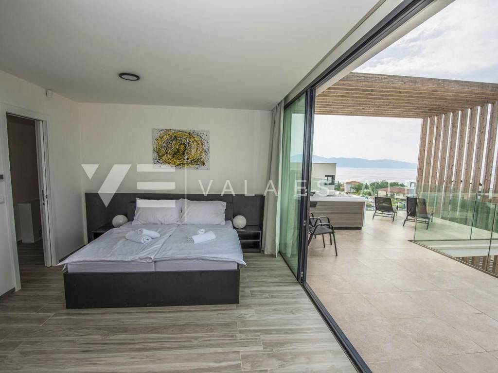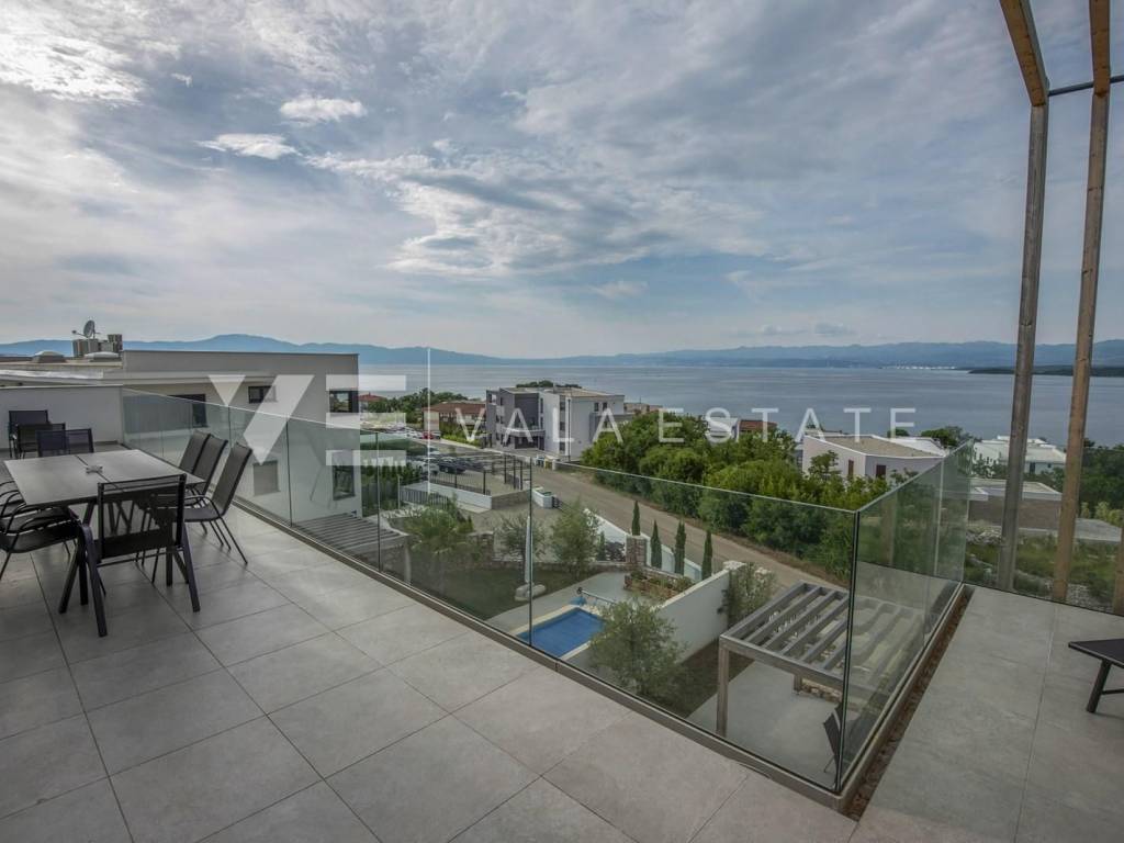 Real Estate Malinska - luxurious penthouse with 215,10 m2 living area on the second floor of a low-energy efficient apartment villa, located only 250 m from the sea. Penthouse consists of a spacious living room with a kitchen and dining area, 4 bedrooms from which 3 of them have covered balcony and en-suite bathrooms, a sauna with a shower, staircase and an elevator. From the living room, you have access to a covered terrace of 53 m2 where you have a jacuzzi and a lounge area with a magnificent sea view. The apartment has two parking spaces of 25 m2 and a storage room of 13,20 m2. Top quality construction and equipment such as a system of sliding facade panel sun breaker that provides protection from the sun without closing the view of the sea, heating and cooling system, security system and video surveillance. This property is located in the elite part of Malinska, close to beautiful beaches.
