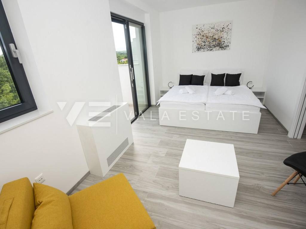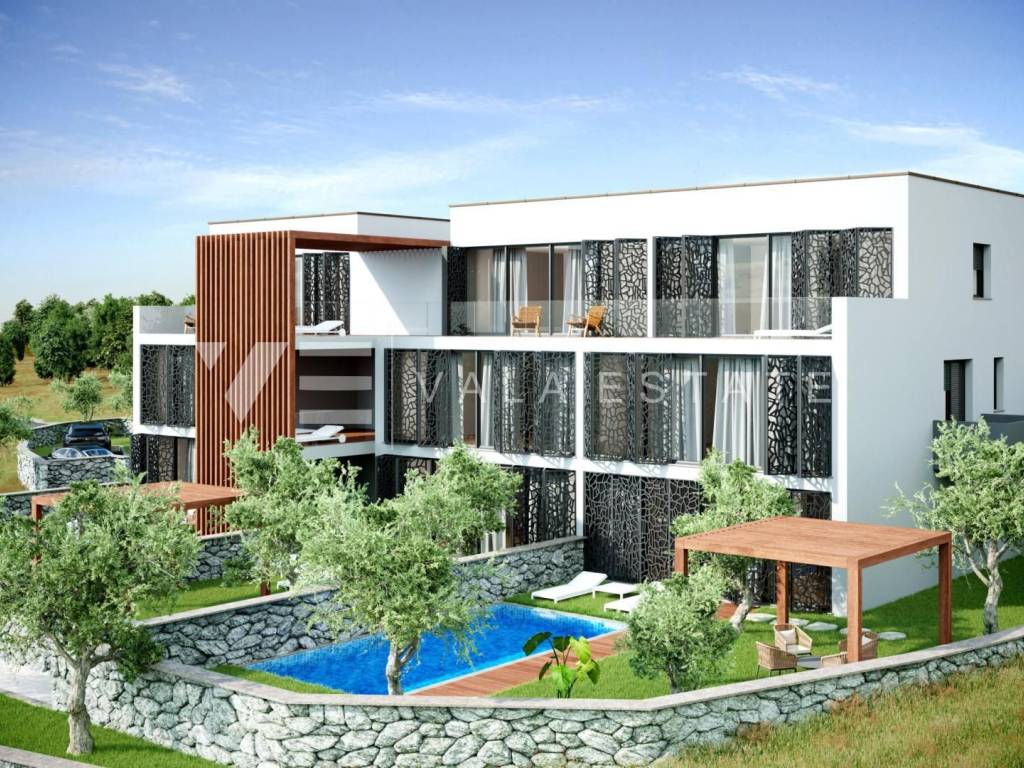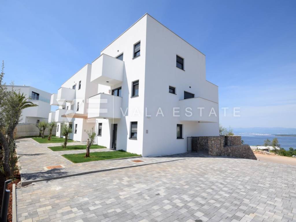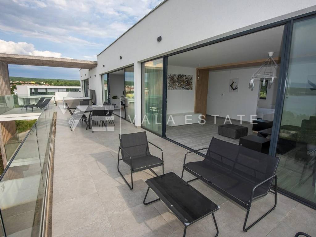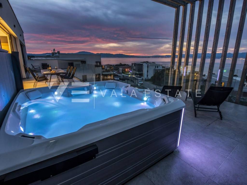 Real Estate Malinska - luxurious penthouse with 215,10 m2 living area on the second floor of a low-energy efficient apartment villa, located only 250 m from the sea. Penthouse consists of a spacious living room with a kitchen and dining area, 4 bedrooms from which 3 of them have covered balcony and en-suite bathrooms, a sauna with a shower, staircase and an elevator. From the living room, you have access to a covered terrace of 53 m2 where you have a jacuzzi and a lounge area with a magnificent sea view. The apartment has two parking spaces of 25 m2 and a storage room of 13,20 m2. Top quality construction and equipment such as a system of sliding facade panel sun breaker that provides protection from the sun without closing the view of the sea, heating and cooling system, security system and video surveillance. This property is located in the elite part of Malinska, close to beautiful beaches.