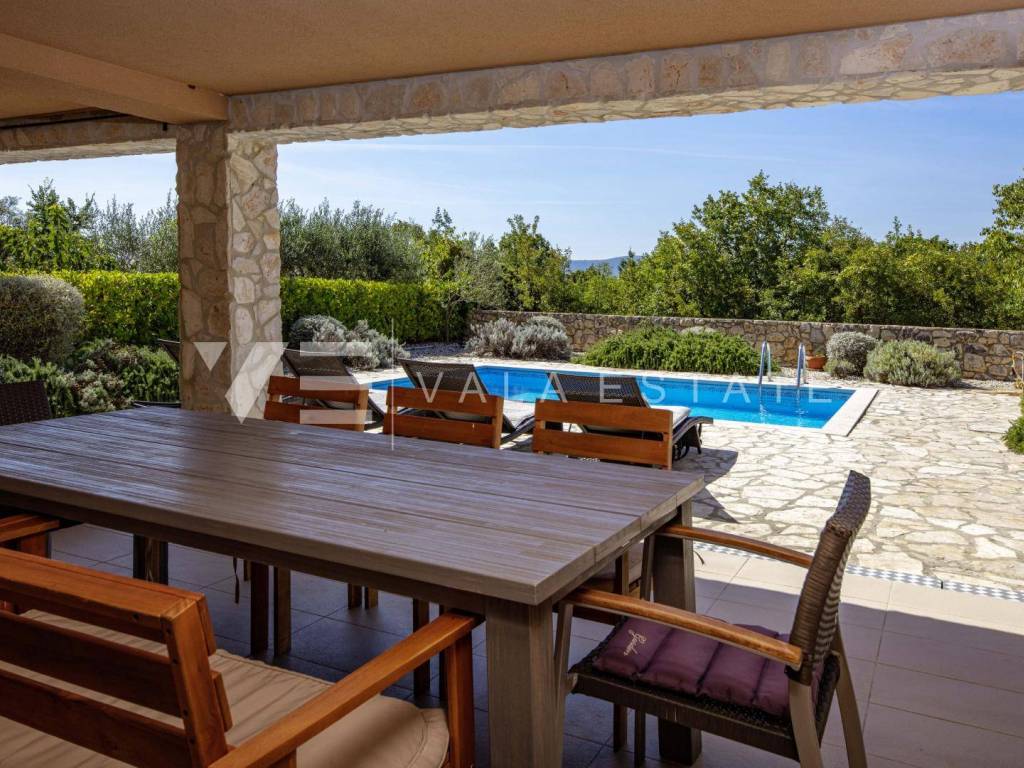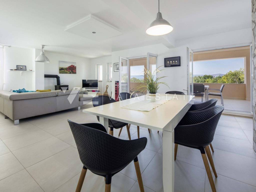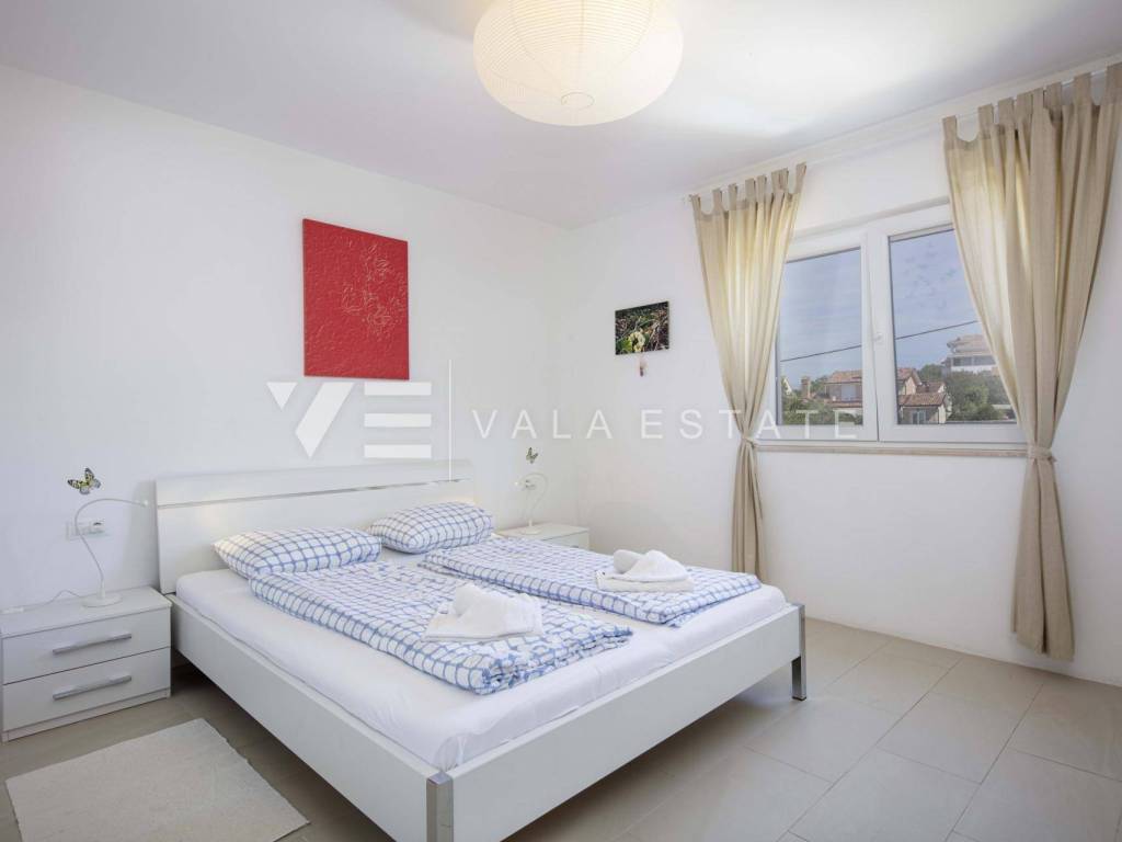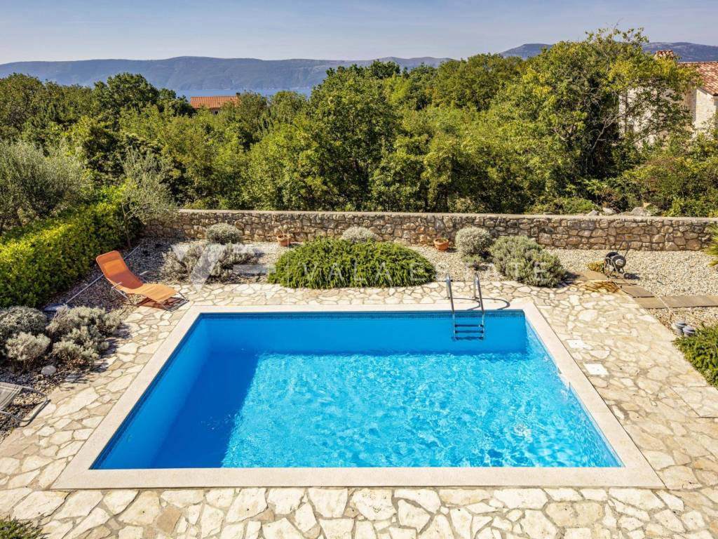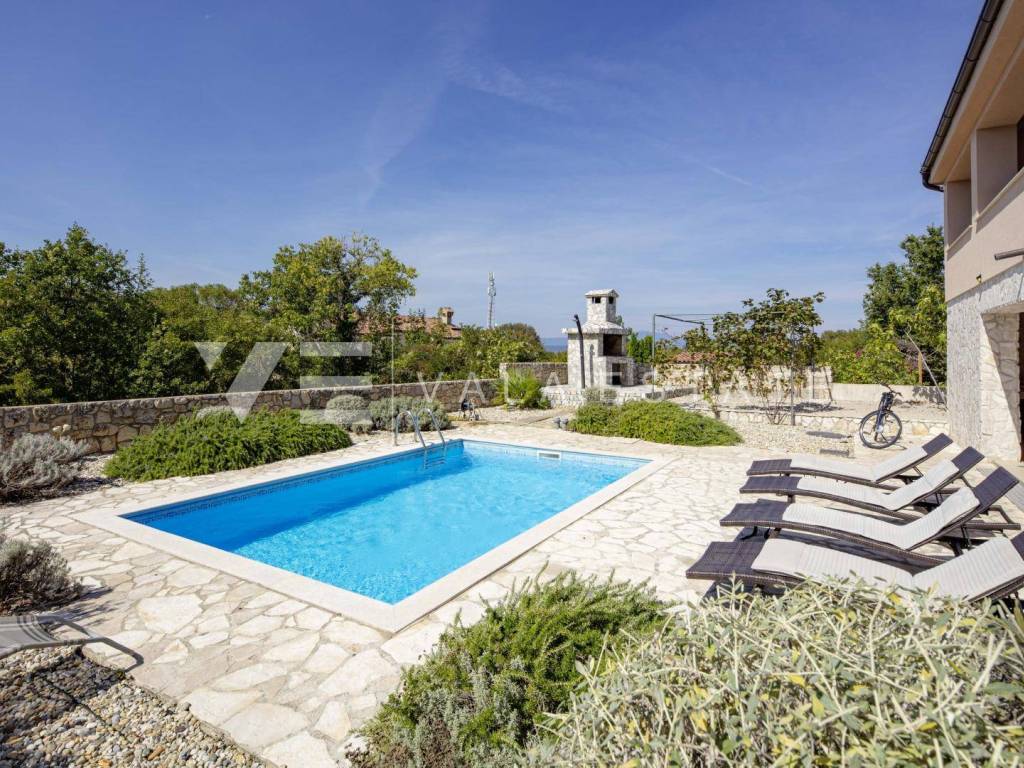 Real Estate Island of Krk, City of Krk, wider area - detached house for sale, in a quiet location. House consists of a ground floor with a garage, winery, playroom, and a toilette, first floor - spacious living room with three bedrooms, two bathrooms and a spacious terrace, and the second floor with two apartments with two bedrooms. House has a beautifully decorated garden of 400 m2 with a swimming pool and 7 parking spaces. Beautiful open view of the sea. Fully furnished. Air-conditioned. Solar heating system. Ideal for renting , all three apartment are categorized with 5* stars. Distance from the sea: 2200 m