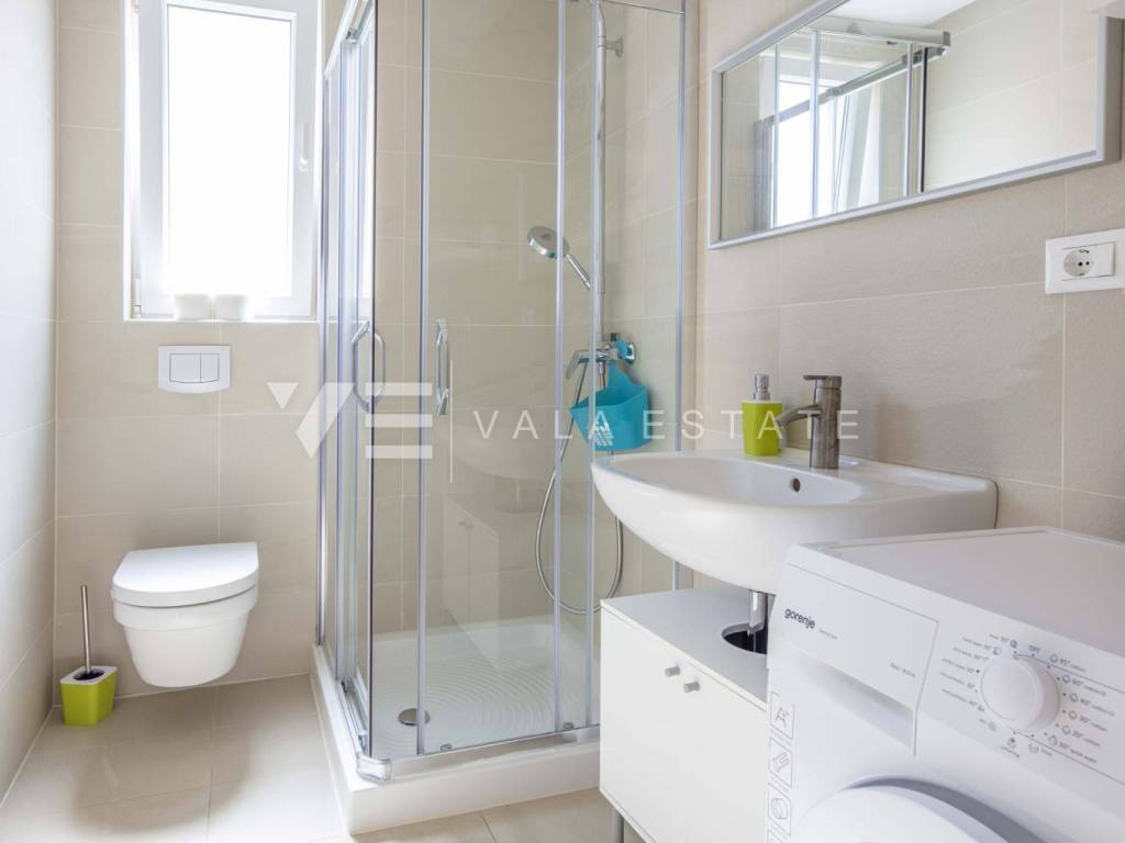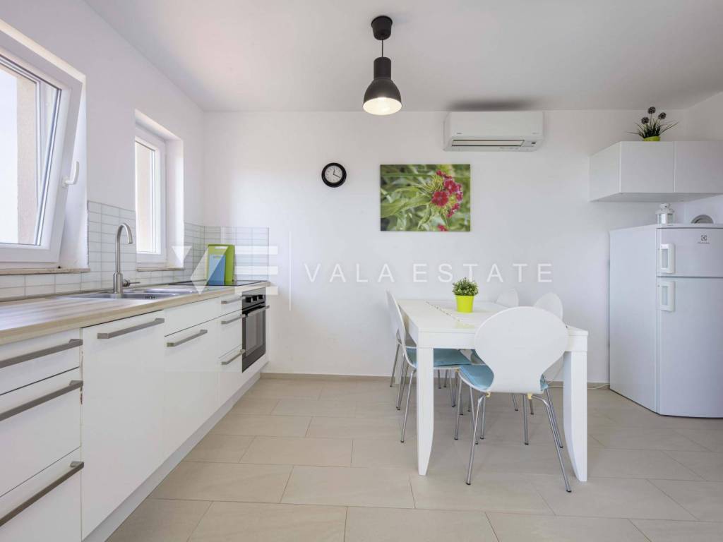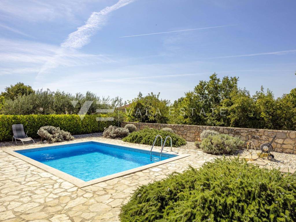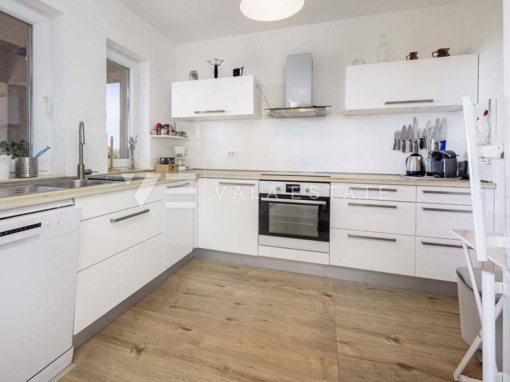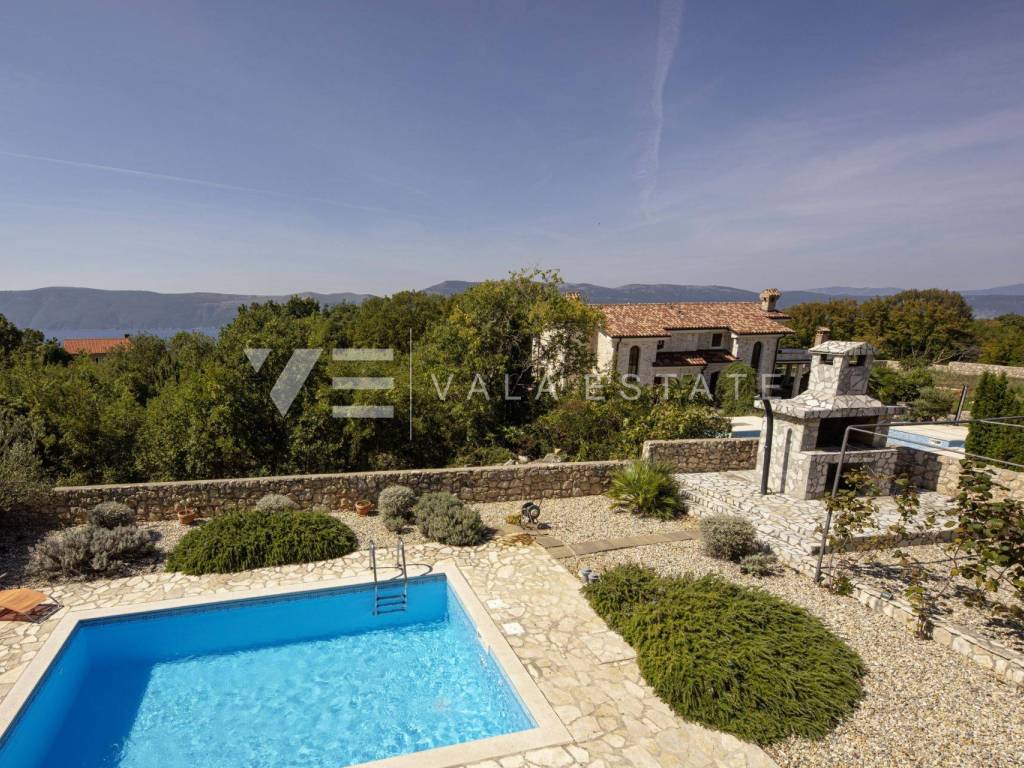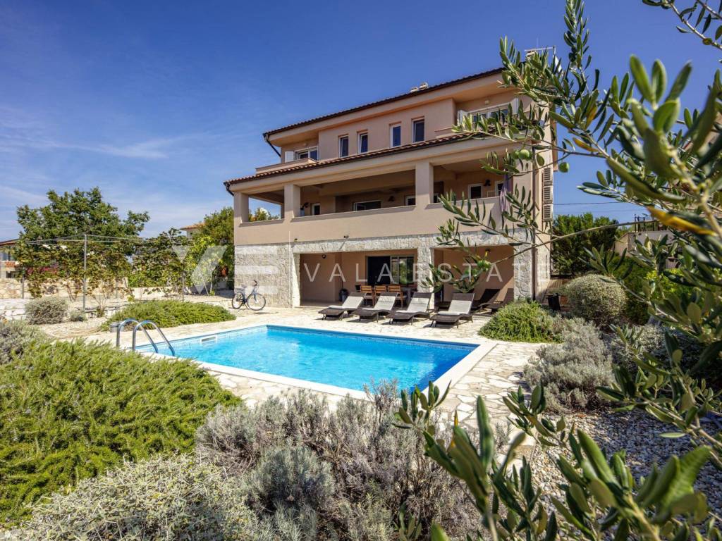Real Estate Island of Krk, City of Krk, wider area - detached house for sale, in a quiet location. House consists of a ground floor with a garage, winery, playroom, and a toilette, first floor - spacious living room with three bedrooms, two bathrooms and a spacious terrace, and the second floor with two apartments with two bedrooms. House has a beautifully decorated garden of 400 m2 with a swimming pool and 7 parking spaces. Beautiful open view of the sea. Fully furnished. Air-conditioned. Solar heating system. Ideal for renting , all three apartment are categorized with 5* stars. Distance from the sea: 2200 m