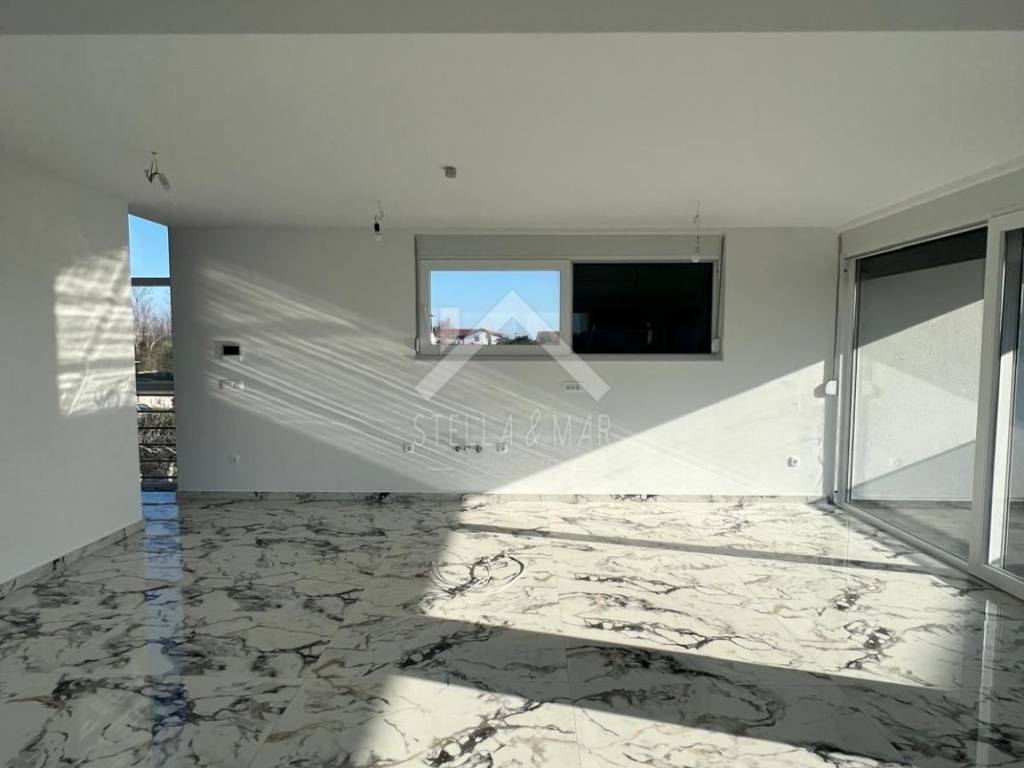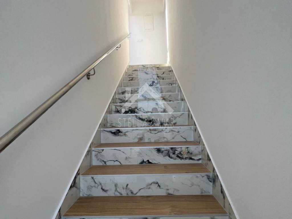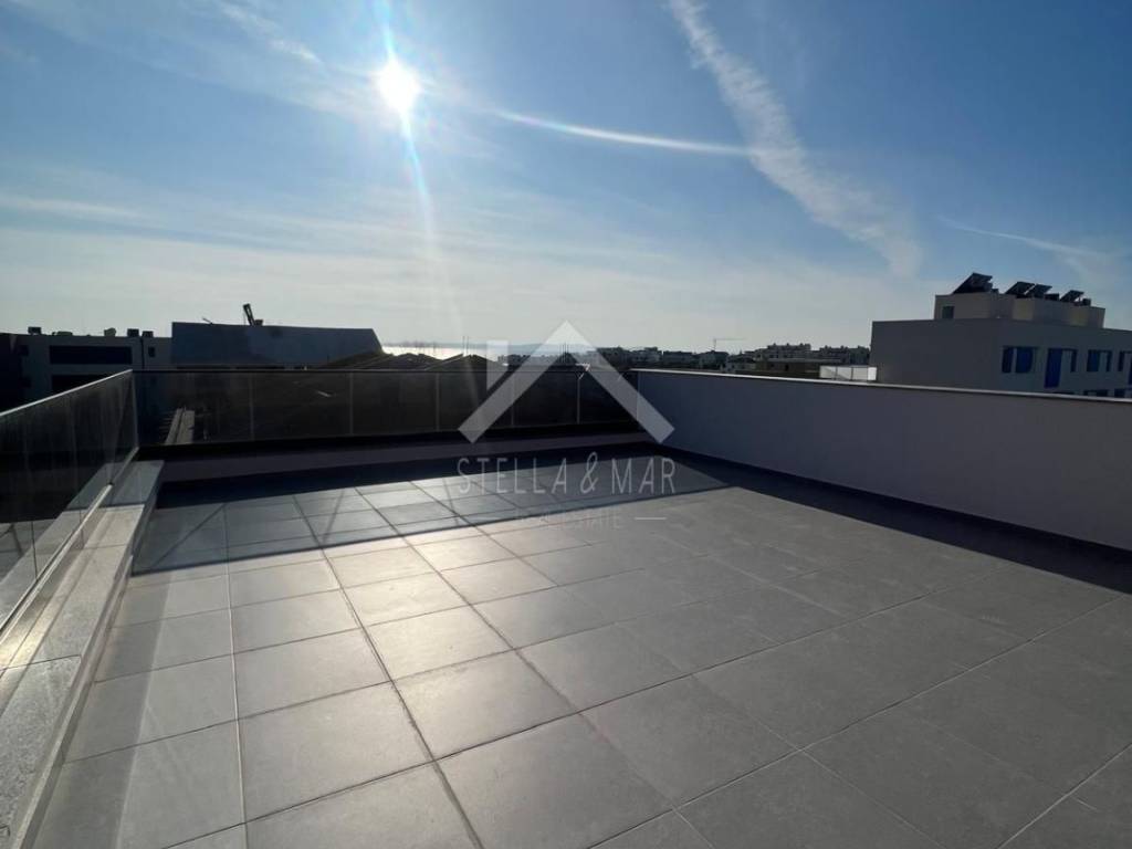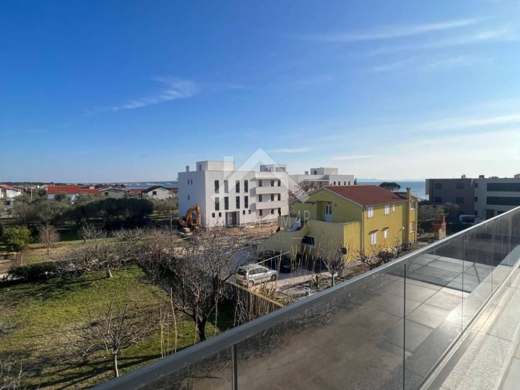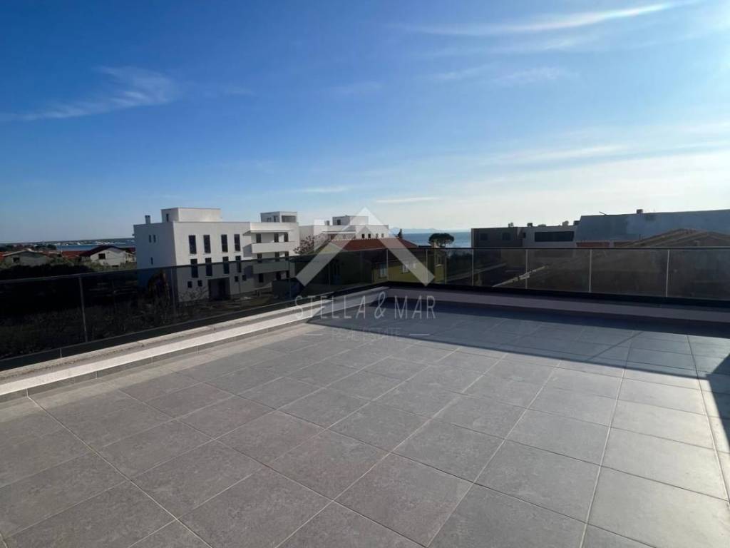 Penthouse with sea view for sale in Privlaka near Zadar. It is located in a smaller, newer residential building. It extends over two floors. The first floor consists of a kitchen with dining room, living room, exit to a comfortable covered terrace, hallway, three bedrooms and two bathrooms. An internal staircase leads to the 2nd floor, where there is an uncovered roof terrace with a view. The whole apartment is rich in light, thanks to the large glass walls and the very orientation of the property. Also, the entire apartment has underfloor heating, air-conditioned rooms, video intercom,... The apartment has two parking spaces. The building is connected to the city water supply.