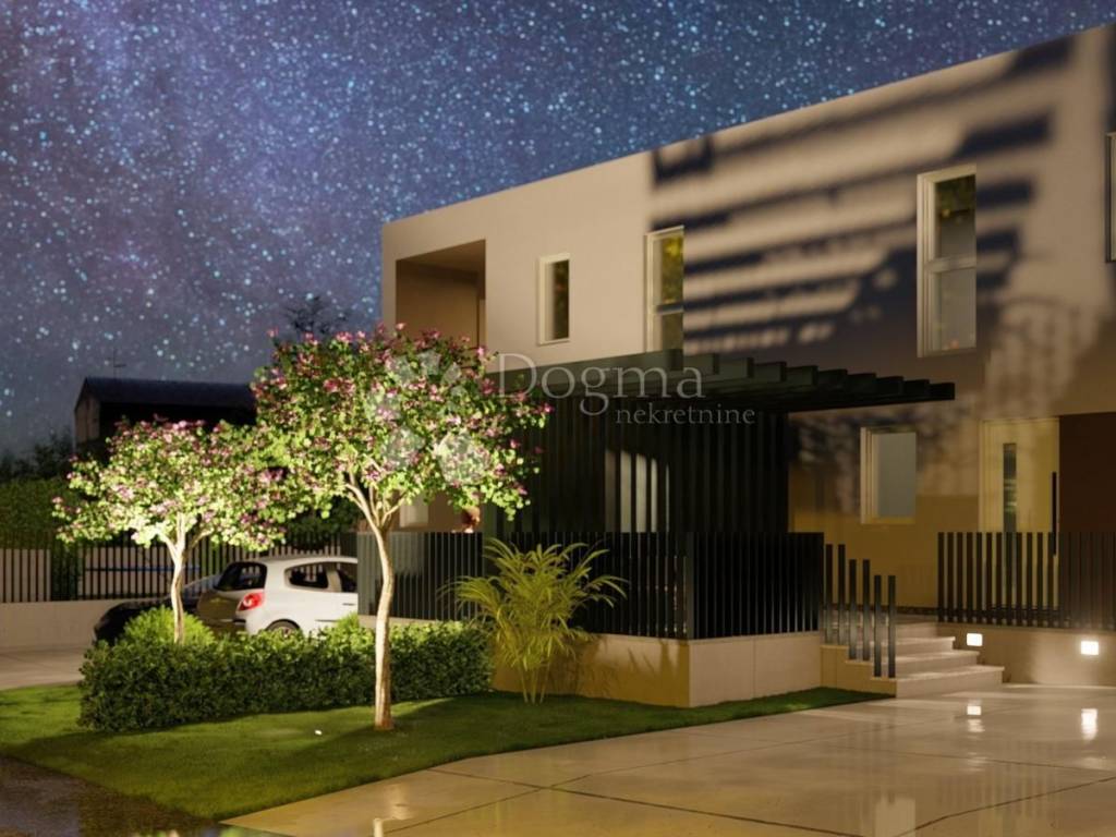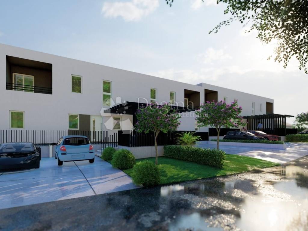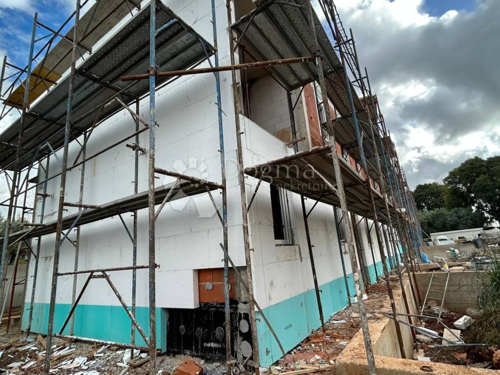 Just five kilometers from the center of Poreč and its beautiful beaches, a project of four modernly designed terraced houses is for sale. Poreč is known as one of the most desirable cities on the Istrian coast - a city with a rich cultural heritage, well-maintained beaches, developed infrastructure and numerous year-round amenities. This location offers the perfect combination of peaceful family life and proximity to all important amenities. The project includes four identical houses (A, B, C and D), which are currently in the high-level unfinished phase, and work is underway on installing the facade. Each house has a carefully designed layout, its own parking space for two cars and a landscaped green environment. House A is located on a plot of 183.6 m, while the total living area is 101.21 m, distributed over the ground floor and first floor. The ground floor has an entrance area, bathroom, kitchen, spacious living room with open-plan dining room, storage room and staircase leading to the first floor. The first floor has three bedrooms, a bathroom, hallway and loggia. Next to the house are two parking spaces and a green garden, which provides additional comfort and privacy. Advantages: Excellent location - only 5 km from the sea and the center of Poreč Modern design and quality construction Private parking and garden Functional layout Ideal for family life or as an investment for tourism This project represents an excellent opportunity to buy a modern house in Istria, near the sea, with a balanced ratio of quality, comfort and location.