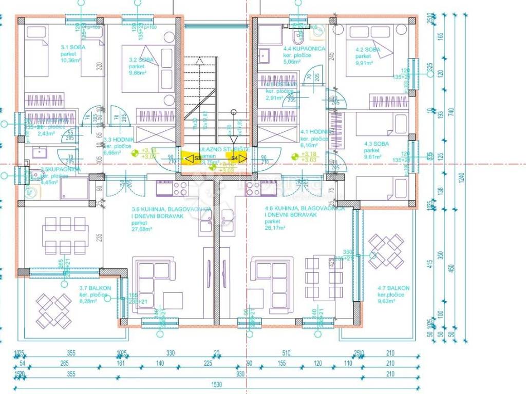 Apartment S4 is located on the 1st floor and consists of a hallway, kitchen, dining room and living room, two bedrooms, bathroom, and storage.