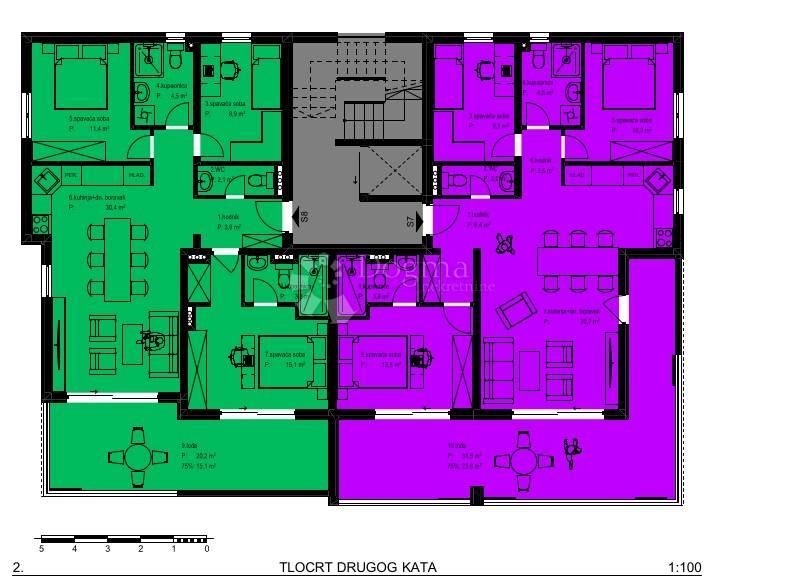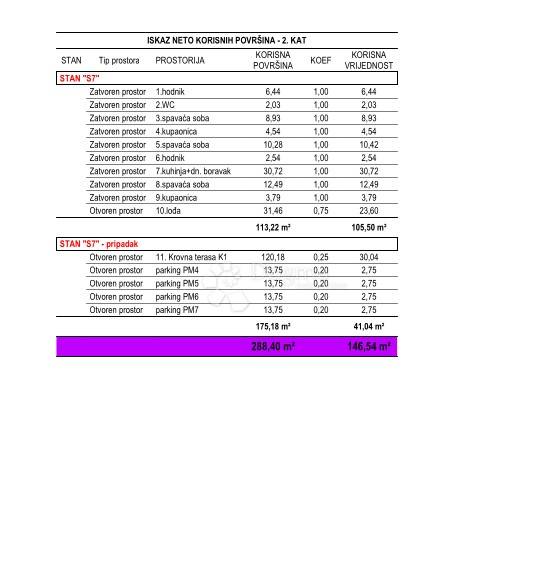 In Ričine, in a quiet part of Zadar close to schools, shops, kindergartens and public transport, there is a modern building with high energy efficiency and top-quality construction. The microlocation is a top position in a well-maintained street with newer construction and neat parking. Apartment S7 on the second floor offers three bedrooms, a spacious living room connected to the kitchen, two bathrooms, a separate toilet and a hallway. The calculated net usable area of the apartment with its accessories is 146.54 m2. The closed residential part consists of a living room with a kitchen of 30.72 m2, bedrooms of 12.49 m2, 10.28 m2 and 8.93 m2, bathrooms of 4.54 m2 and 3.79 m2, a separate toilet of 2.03 m2 and a hallway of 6.44 m2 and 2.54 m2. The apartment has a loggia of 31.46 m2 and a large roof terrace K1 of 120.18 m2. The apartment comes with four parking spaces PM4, PM5, PM6 and PM7, each 13.75 m2.