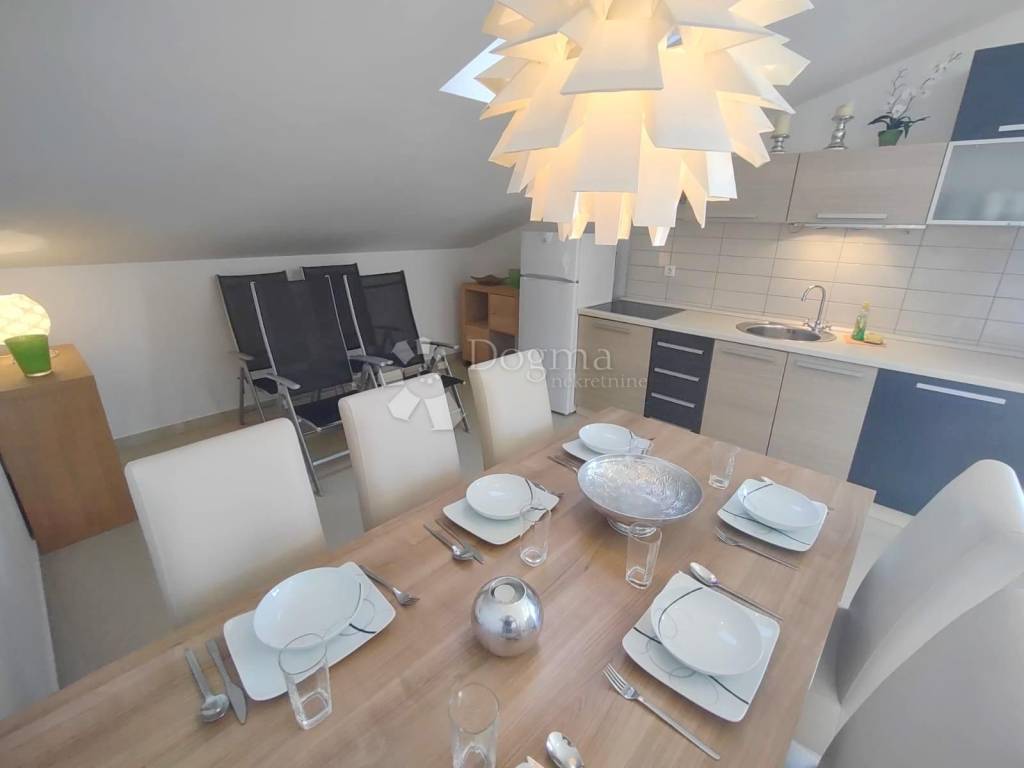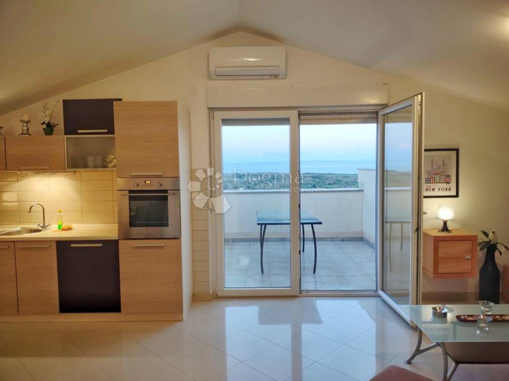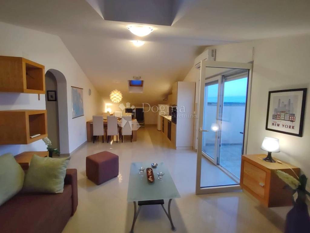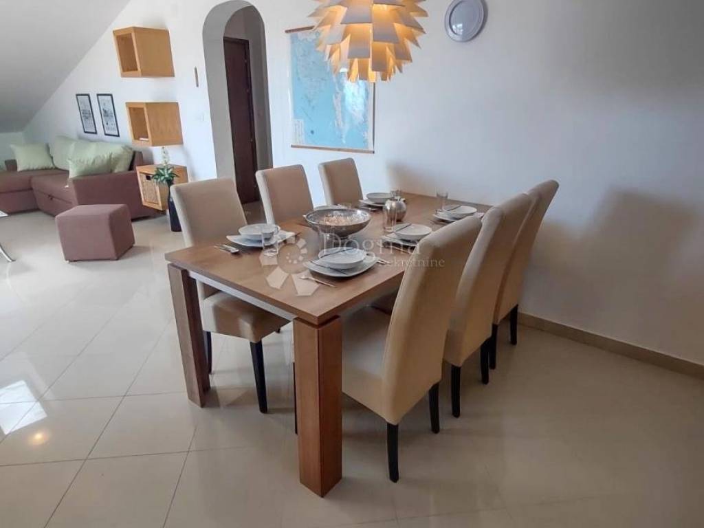 The apartment has a net area of 147.34 m and consists of three spacious bedrooms, a modern bathroom, an entrance area, and a spacious living room connected to the dining area. From the living room, you step out onto a large terrace with a stunning view of the sea and the Kvarner Islands.