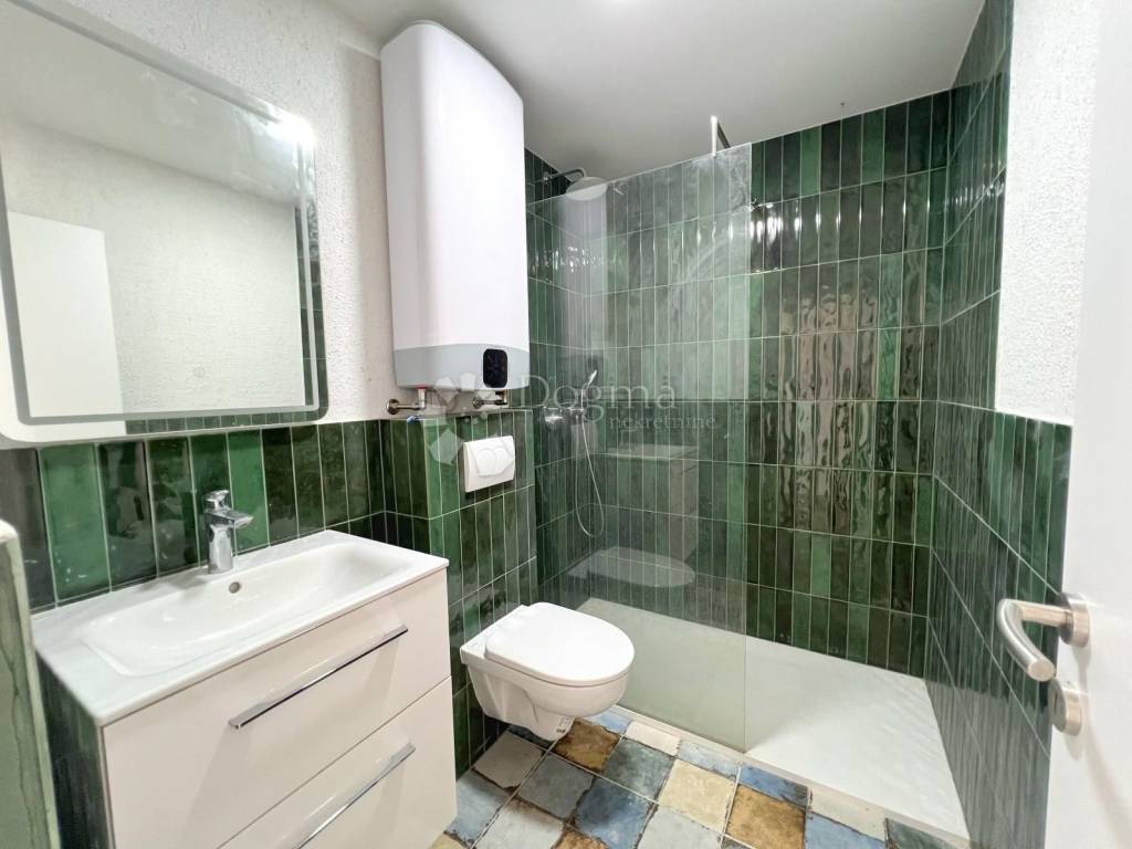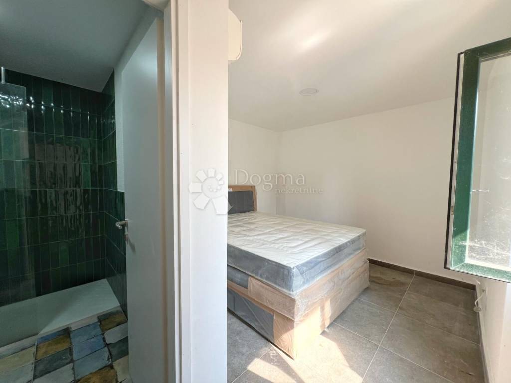 The upper floor comprises two bedrooms with large double beds, each with its own bathroom featuring a walk-in shower. From the hallway, there is access to a traditional Istrian balcony overlooking the landscaped yard and surrounding greenery. The bathrooms are equipped with high-quality ceramics and sanitary ware, creating an elegant and functional connection to the bedrooms.