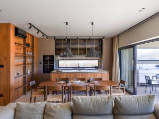 The villa spans two floors, and upon entering the ground floor, you are greeted by a spacious, bright open-space area that includes a luxurious living room, kitchen, and dining area. This space is filled with natural light thanks to large glass walls that open, creating a seamless transition between the interior and exterior, giving the impression of an open-air living experience. The ground floor also includes an elegant bedroom with a private bathroom, a guest WC, and a wellness area with a modern sauna and shower, perfect for relaxation after a long day.