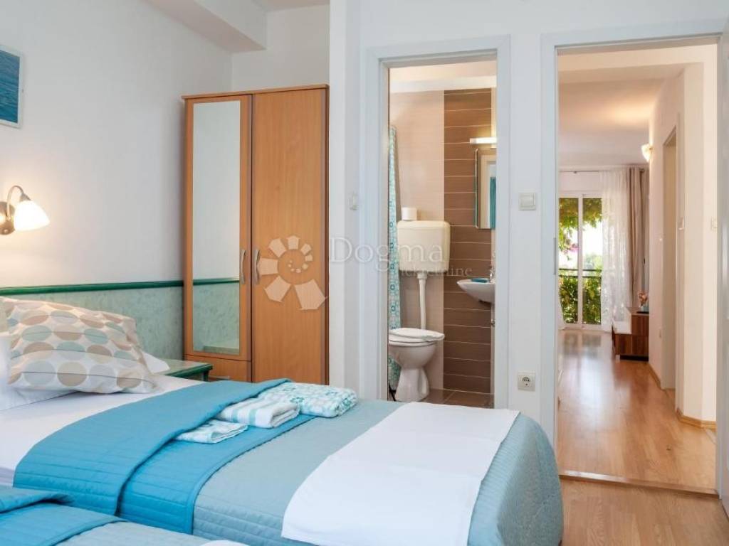 In the small tourist town of Podgora, just 150 meters from the beautiful coast, a spacious apartment house with a long history of successful business operations is for sale. This property, with a total gross area of 497.63 m, consists of a ground floor and three upper floors, offering excellent opportunities for engaging in tourism with a quick return on investment.