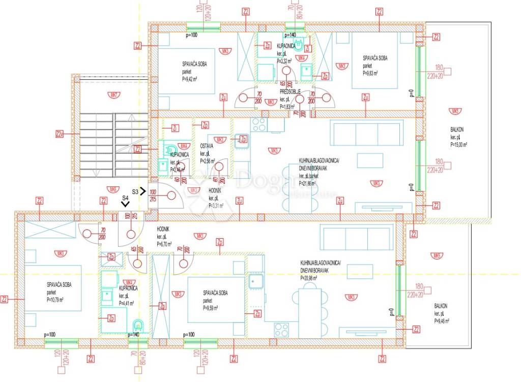 Apartment S3 is located on the second floor of the building, with a total net living area of 83.39 m2. The apartment consists of a hallway, two bedrooms, one of which has access to the balcony, two bathrooms, storage space/pantry, an open space concept kitchen with dining area, and a living room that leads to the balcony.