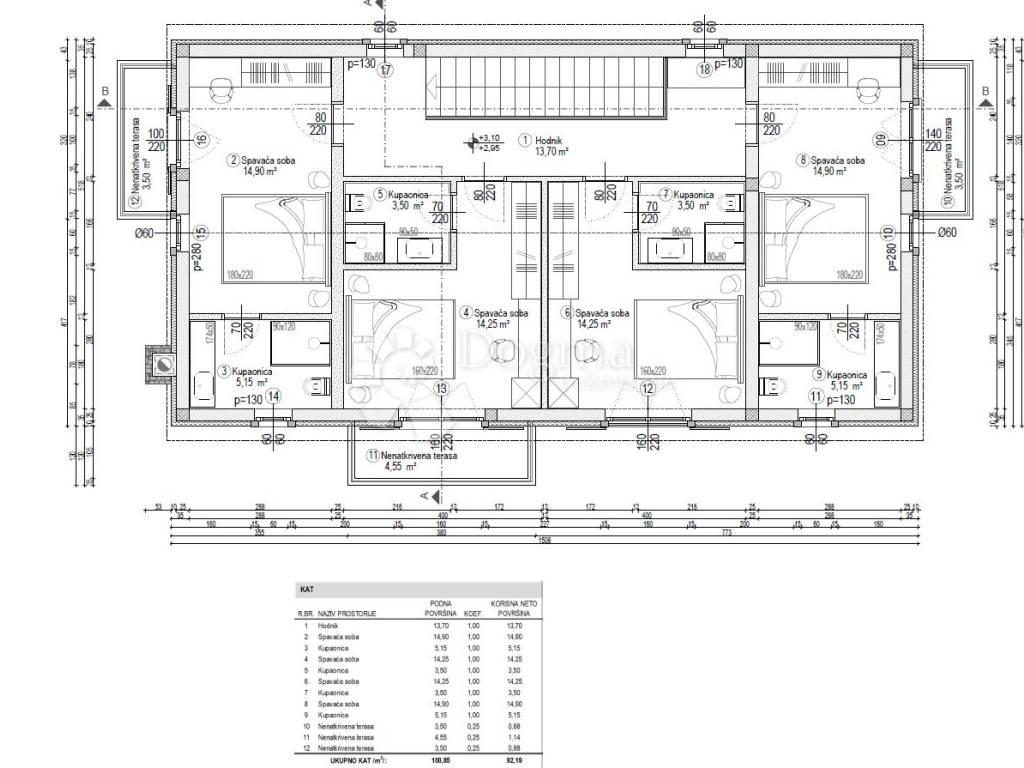 The ground floor also includes a staircase, a technical room, sanitary facilities, the stairs lead you to the first floor where there are 4 bedrooms with their own bathrooms.