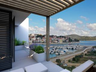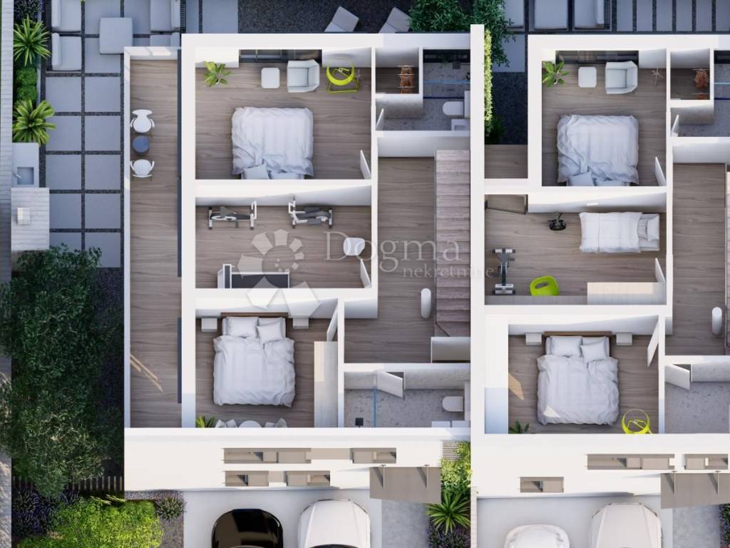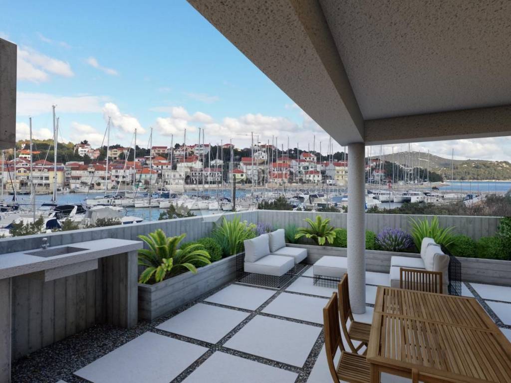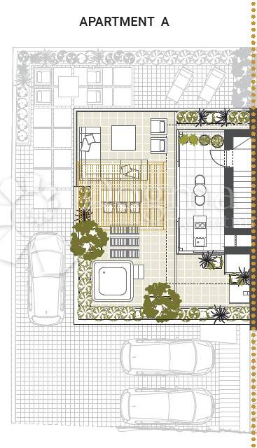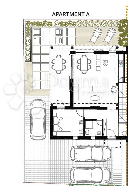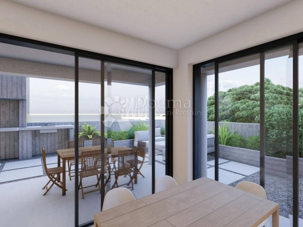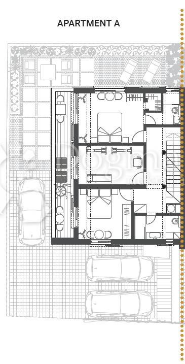 In close proximity to the marina and beach, there is pre-sale new construction consisting of three residential units. Residential unit A spans an actual area of 294.47 m2, with a net area of 181.98 m2, and comprises a ground floor dominated by a spacious open-plan living room, kitchen, and dining area with access to a covered terrace and courtyard. Additionally, the ground floor features a hallway, bathroom, and one bedroom. On the first floor, there are three bedrooms, one designed as a gym, another with a walk-in closet and en suite bathroom, while there's also another bathroom and a covered terrace. The central gathering place offers a roof terrace divided into a planned indoor winter garden, covered and uncovered terrace with a pergola.