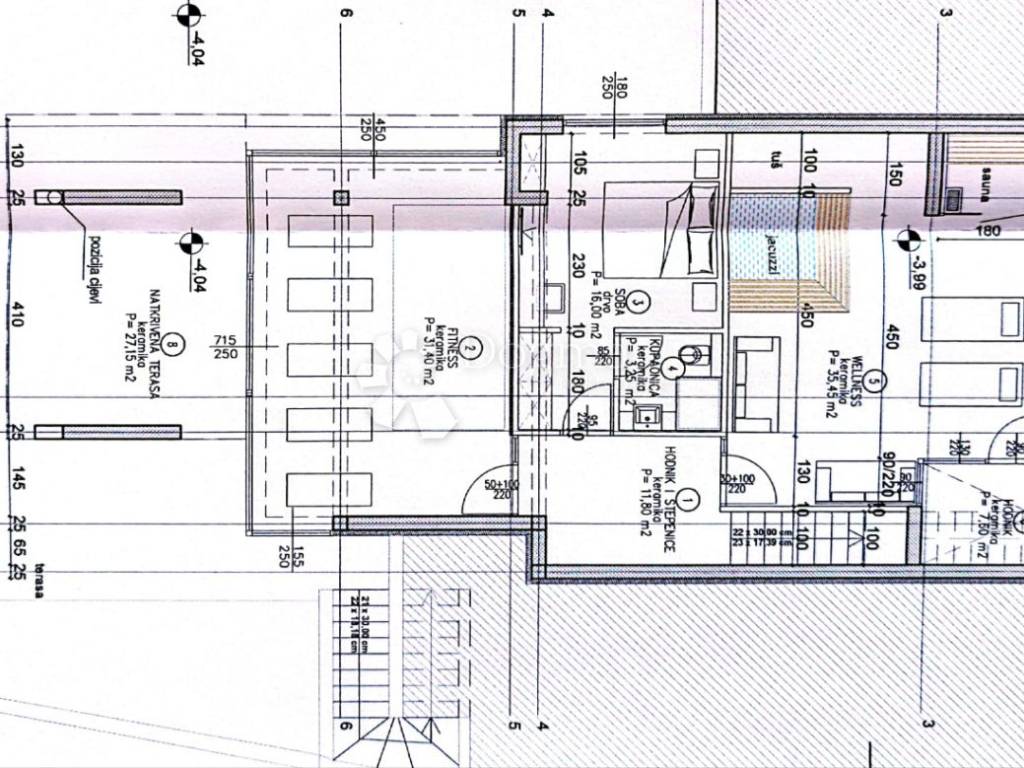 Basement: corridor, fitness area, room, bathroom, wellness area, technical room, terrace.