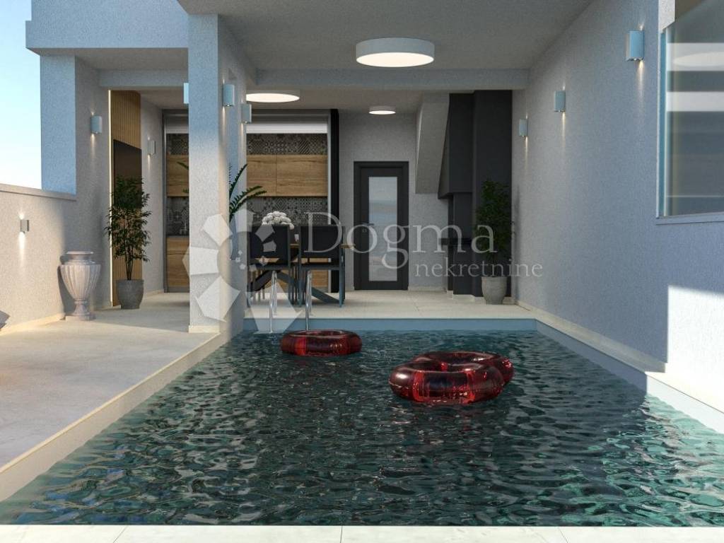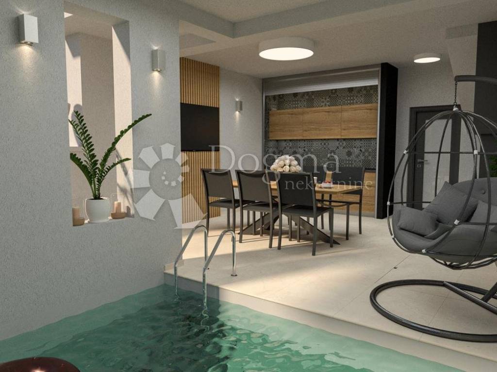 On the bottom floor there is a bathroom, a covered terrace, a summer kitchen with a fireplace, a swimming pool and a place for sunbathing with a beautiful panoramic view of the sea and the islands.