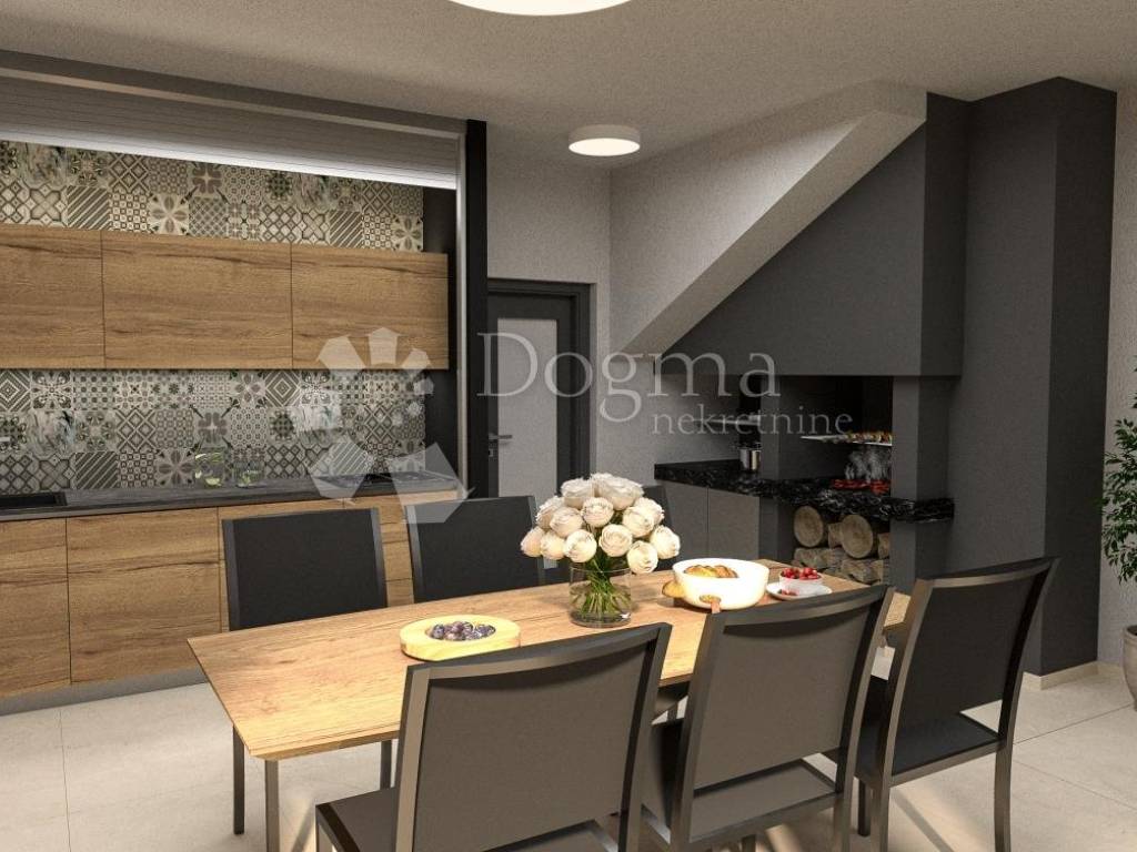 On the upper first floor, there is a bathroom, a kitchen with a dining room, a living room and a terrace.