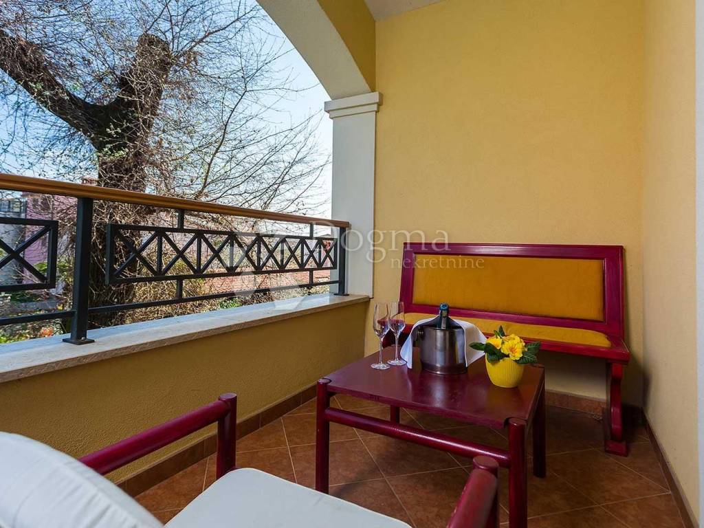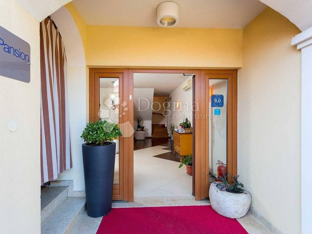 The boarding house consists of eight rooms, of which seven are double rooms, with an area of 25 m2, and one is a three-bed room, with an area of 40 m2. Each of the rooms has a terrace and a view of a beautifully landscaped yard full of greenery, while the triple room also has a view of the swimming pool. One room is also pet friendly and you can stay in it with your pet. This room has a direct exit to the park.
