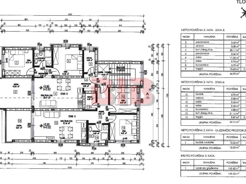 Stan se sastoji od hodnika,dvije spavaće sobe,dnevnog boravka sa kuhinjom i blagovaonicom,kupaonice,ostave i terase.