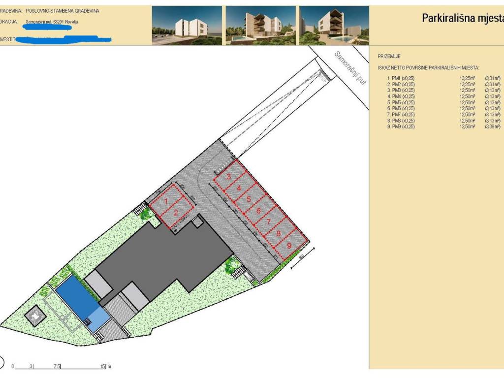 Uz navedeni apartman dolazi jedno vanjsko parkirno mjesto 12,50 m2 (obračunato po koef. x 0,25=3,13 m2).