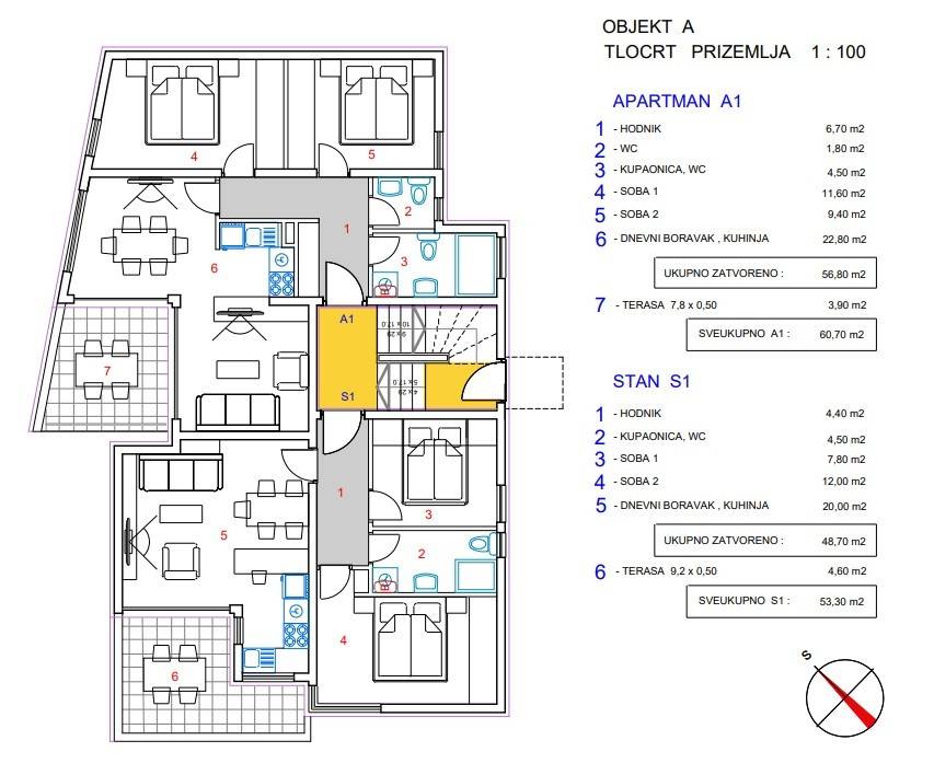 U ponudi je trosobni apartman oznake S1 u prizemlju zgrade.