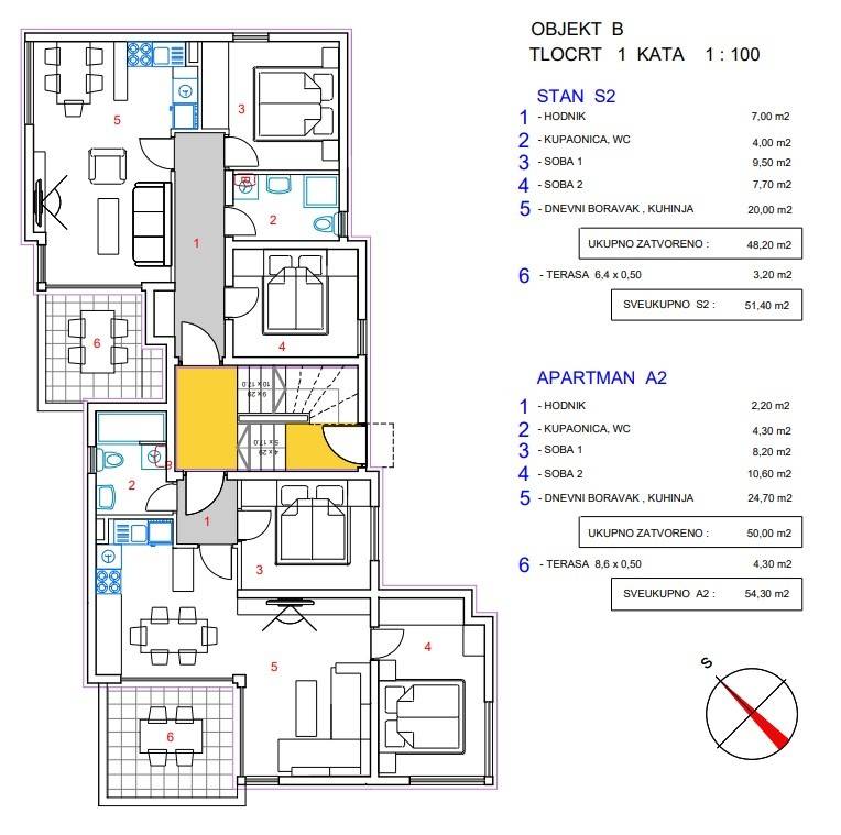 U ponudi je trosobni apartman oznake S2 na 1. katu zgrade.