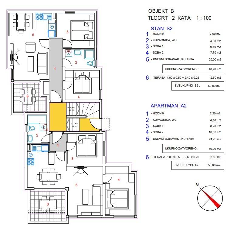 U ponudi je trosobni apartman oznake S2 na 2. katu zgrade.
