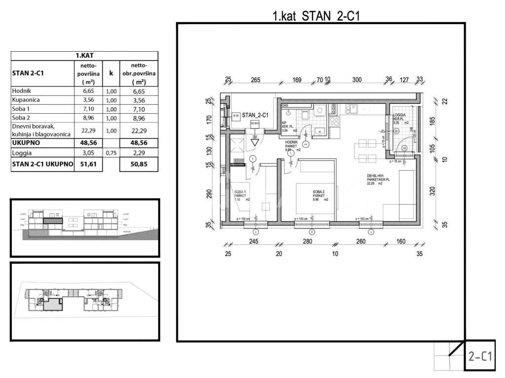 Stan 1-C1 sastoji se od dnevnog boravka s blagovaonicom i kuhinjom, 2 spavaće sobe, kupaonice, hodnika i loggie.