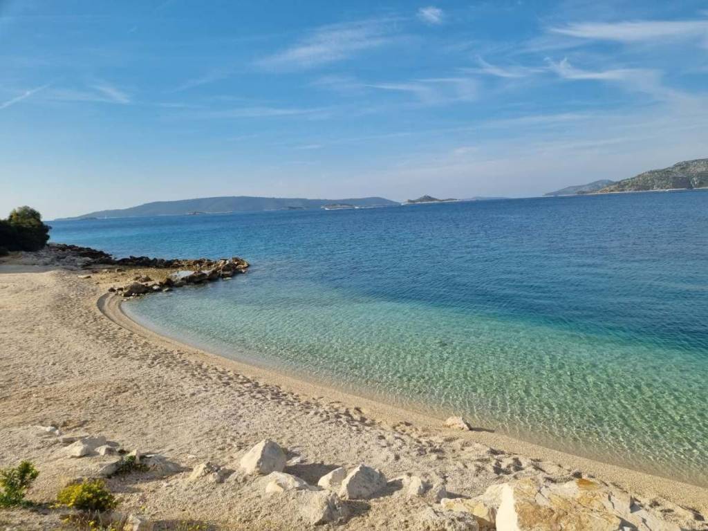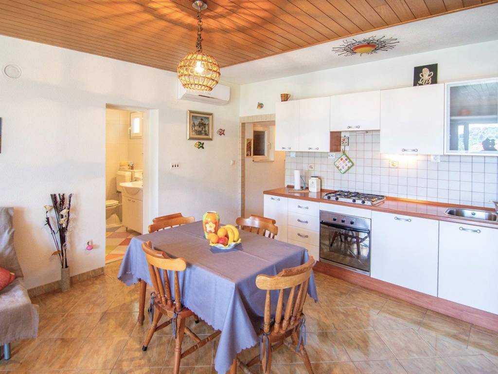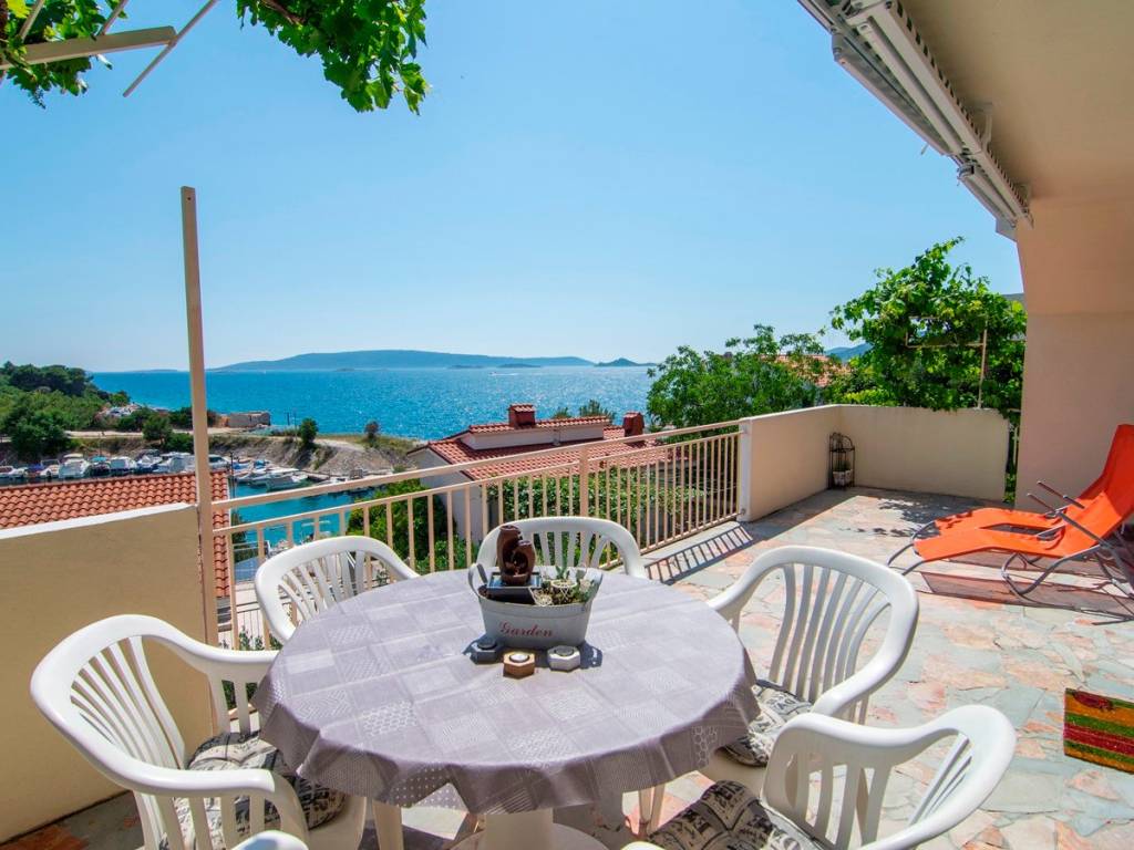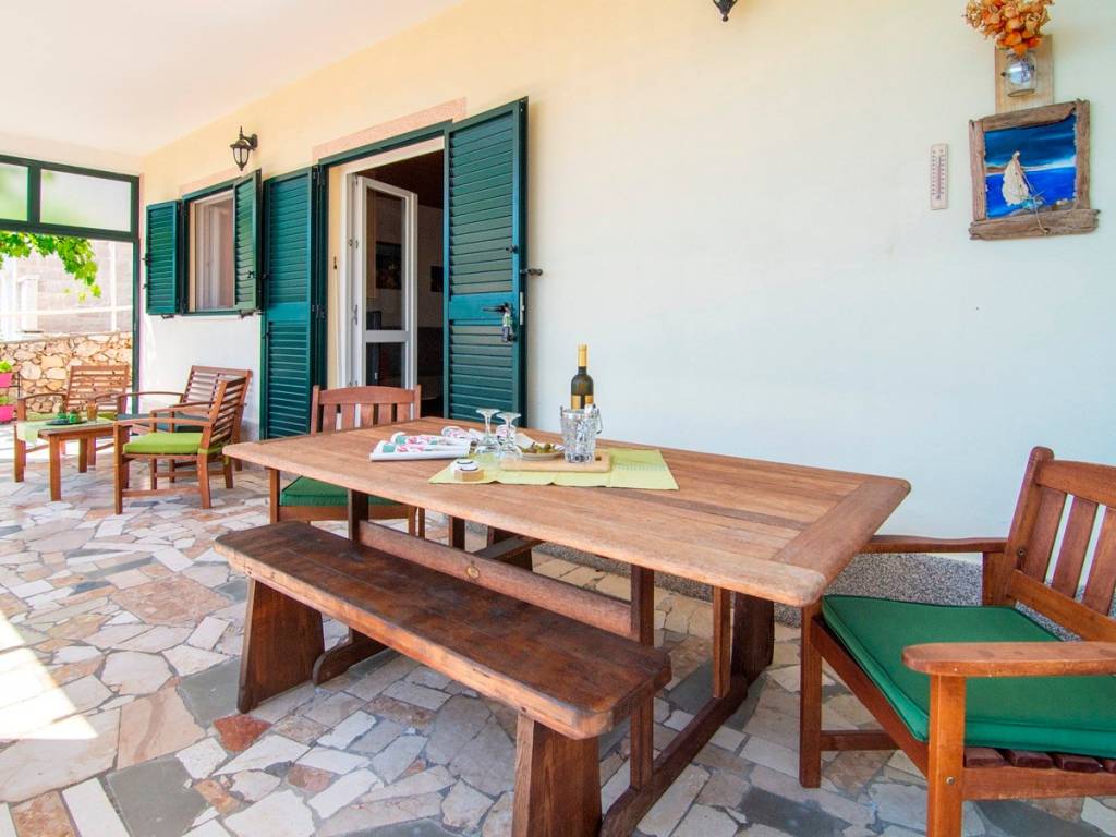A charming house in an excellent location, close to the sea and the beach and with a beautiful view is for sale. The house of approximately 100 m2 of internal space is located on a plot of 449 m2.It has two floors: ground floor and first floor. On the ground floor there is an apartment with two bedrooms, a bathroom, a living room, a kitchen and a dining room. From the living room there is an exit to a covered terrace ideal for socializing and dining outdoors. An external staircase leads to the first floor where there is a spacious terrace with a beautiful sea view. From the terrace there is access to the apartment which also contains two bedrooms, a bathroom, a living room, a kitchen and a dining room. The house is sold furnished and equipped. It is maintained and ready to move in, but requires refreshing the space.Next to the house, in a small stone outbuilding there is a furnished studio apartment of 16 m2. There are also two more additional buildings on the land, a 9 m2 house that serves as a fireplace and a 22 m2 building that currently serves as a storage room, but leaves space for future buyers to decorate it according to their own wishes. The plot also includes parking for two cars and a garden planted with Mediterranean plants.The orientation of the house to the south provides it with plenty of light and airiness during the day. The quiet location and proximity to the sea make this property ideal for those looking for a holiday home or those with the ambition of renting it out for tourist purposes.The distance from the sea and the nearest beach is only 100 m, from the town of Trogir 10 km, and from Split airport 14 km.