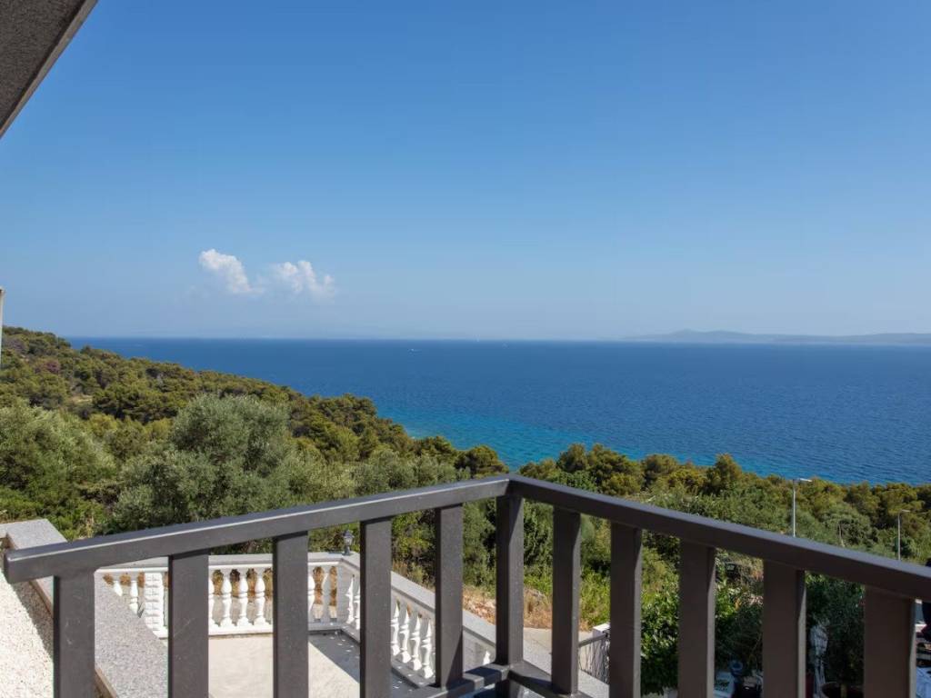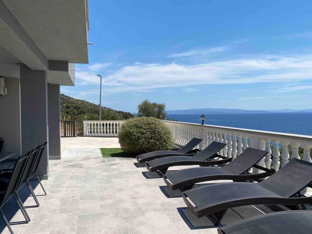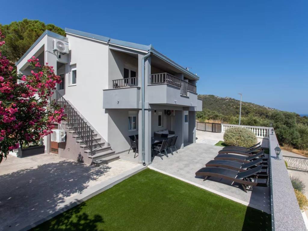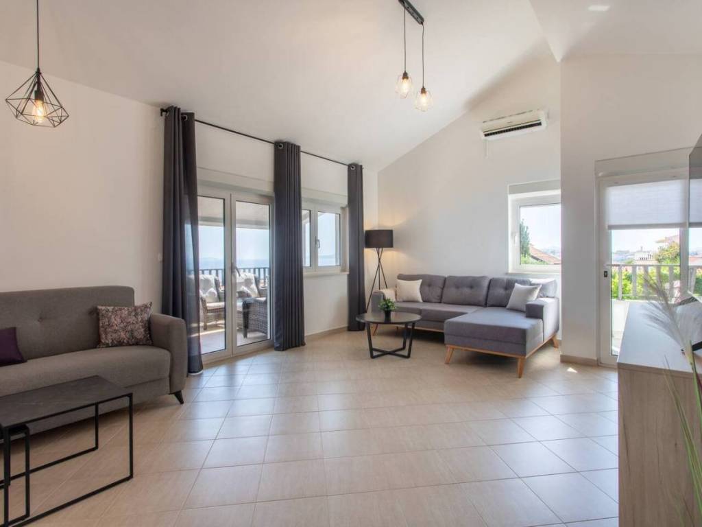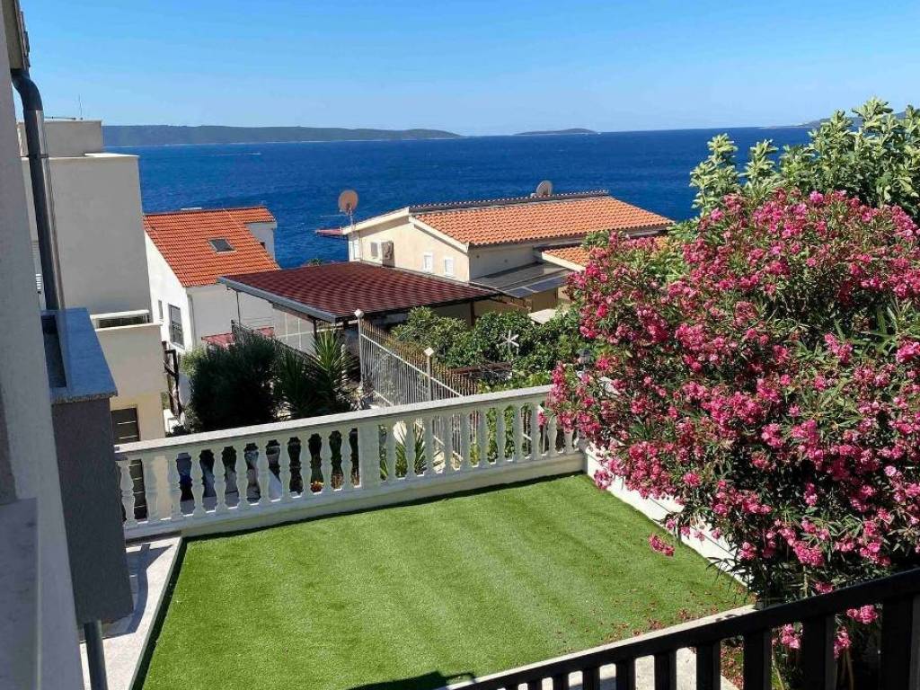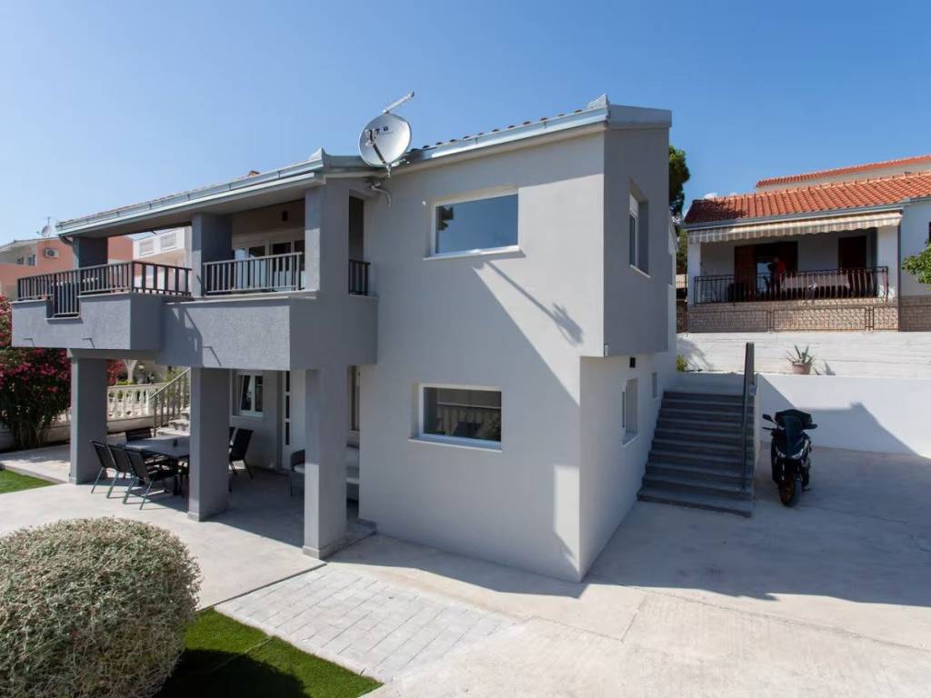 This charming house is located in a quiet part of Okrug Gornji, only 200 m from the sea and the beach. It has a gross living area of 138,61 m2, and sits on a plot of 384 m2. The property consists of two floors: the ground floor and first floor.On the ground floor there is an apartment with two bedrooms, a bathroom, a kitchen and a dining room with access to a covered terrace. An external staircase leads to the first floor, which features an apartment with two bedrooms, a bathroom, a toilet and a living room that opens onto a terrace offering a stunning sea view.The house is well-maintained and in excellent condition, and is being sold fully furnished and equipped, ready to move in. The fenced and beautifully landscaped yard provides parking for several cars.  The southern orientation ensures plenty of light, warmth and airiness throughout the day. This property is ideal as a holiday home or for rental for tourist purposes. It is 5 km from Trogir, 10 km from Split Airport, and 30 km from the city center of Split.