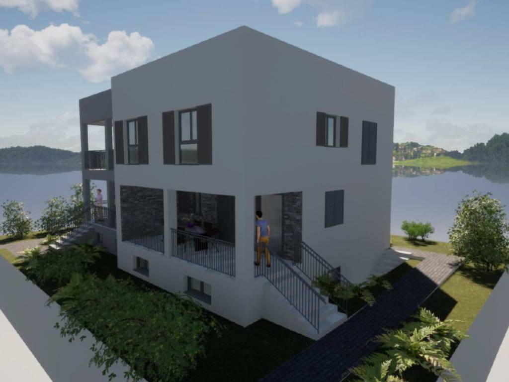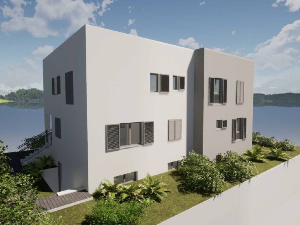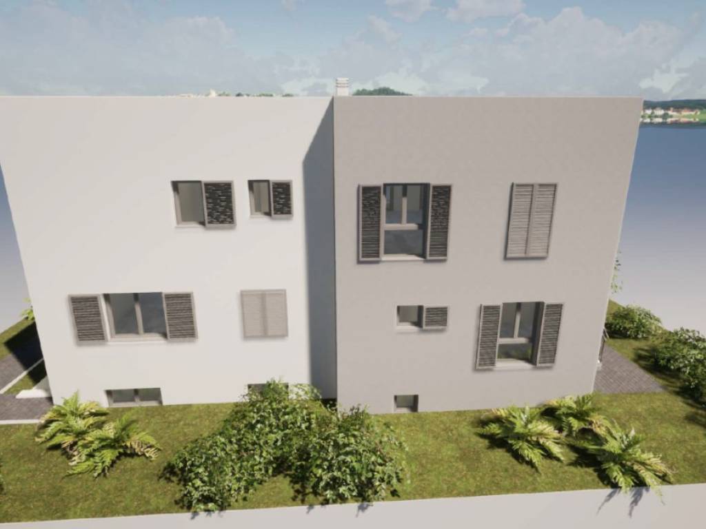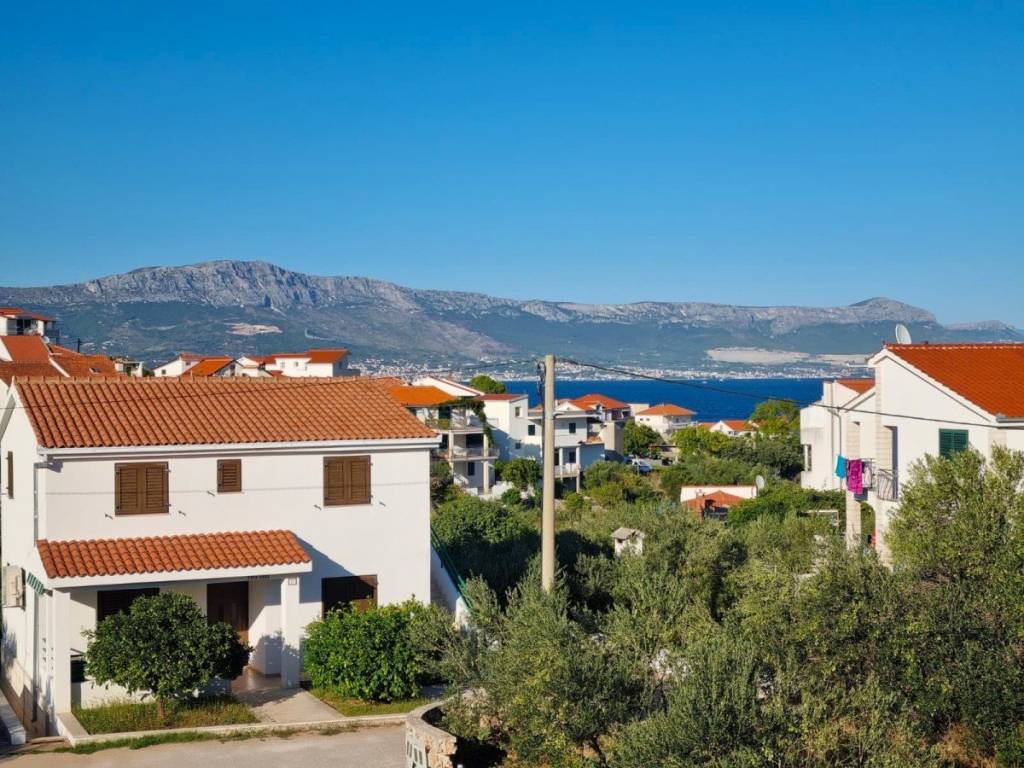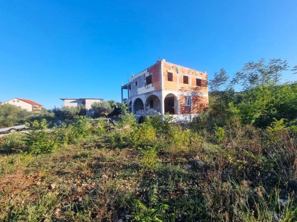 For sale is an unfinished house in roh-bau edition, which consists of three floors: basement, ground floor and first floor. Total net area 342 m2, located on a spacious plot of 824 m2. Ideal for family life, but also excellent as an investment for rental purposes.There is already a conceptual proposal for the completion of the house. It is designed as a building with two residential units.- The basement would contain a fitness room, bathroom, wardrobe and storage room.- The ground floor would consist of a one-bedroom apartment and a large storage room.- On the first floor there would be a spacious apartment with three bedrooms, bathroom, toilet, storage room, living room, dining room, kitchen and a covered terrace.The property is located in a quiet part of the village, only 350 m from the sea and with a partial sea view. It is 8 km from the town of Trogir, and 11 km from Split airport.