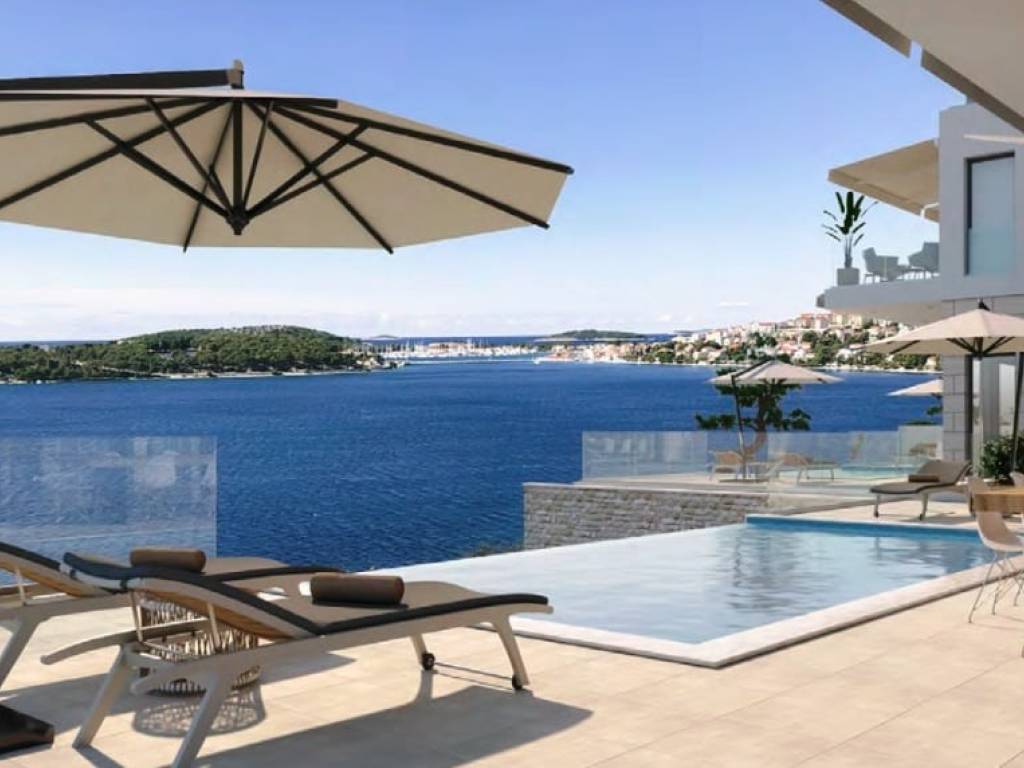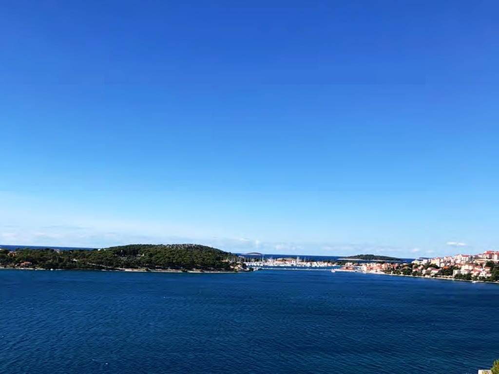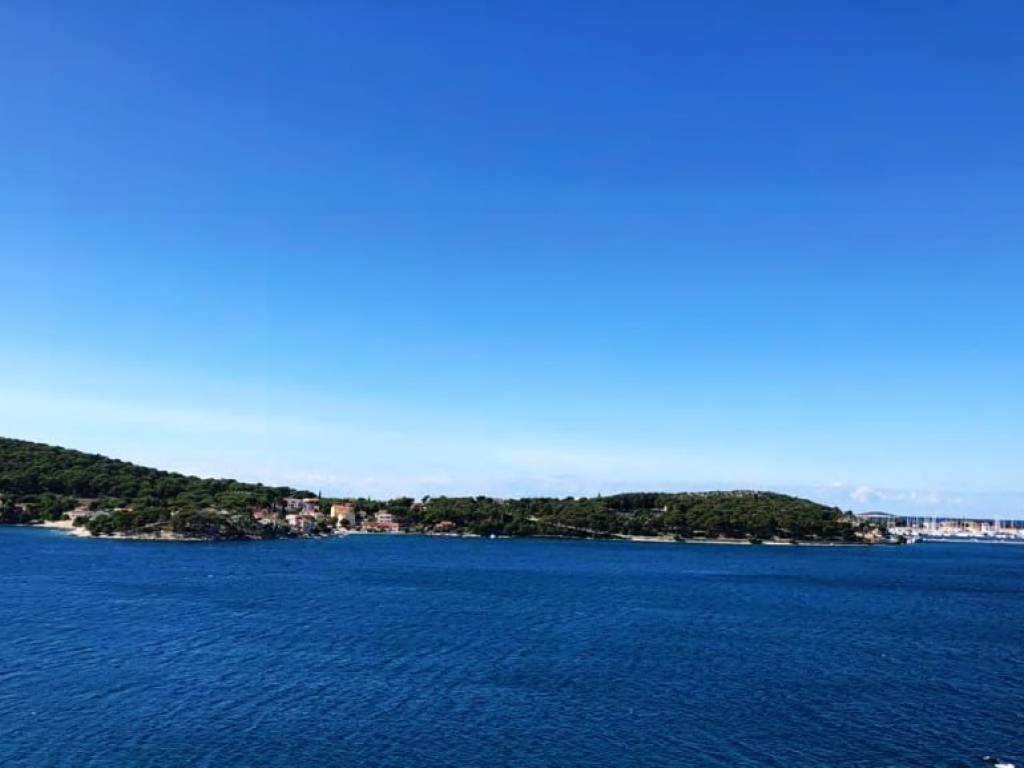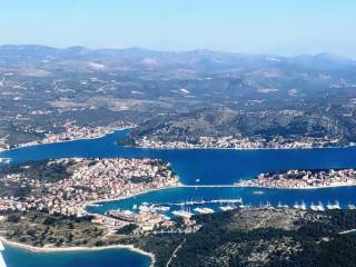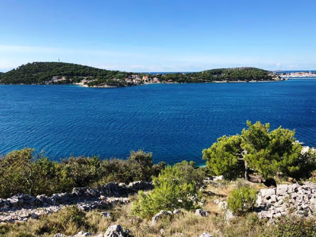 This 1,834 m2 building plot is located in the second row to the sea, in a quiet location, on the edge of the local development area. There is already an approved project for the construction of two villas, each with an approximately 27 m2 infinity pool. Both houses are designed almost identically. Both villas each have approx. 255 m2 of living space, spread over three floors with an additional, partly covered 180 m2 of balconies and terraces. Planned are three large bedrooms with a dressing room and en-suite bathroom, a study room, a fitness room, a living room, a kitchen, a dining area, several storage rooms, a laundry room and a guest toilet. There is also a 34 m2 double garage and two outdoor parking spaces. Water tanks with a capacity of 75 m3 ensure that the house is supplied with water.The property is located opposite the well-known harbor “Marina Frapa Rogoznica”. It has an unobstructed panoramic sea view, even from the ground floor or the terrace, due to the steep hillside location and the fact that the house in the first row has already been newly built.A private concrete staircase leads down to the sea, where there are few tourists even in season. There is an access road, but it needs to be built as part of the construction work. The municipality has already granted permission for this.The property faces west.Distances:Sea: 70 m - Beach Bar: 700 m - Supermarket: 5 km - Trogir: 25 km -Split airport: 32 km.