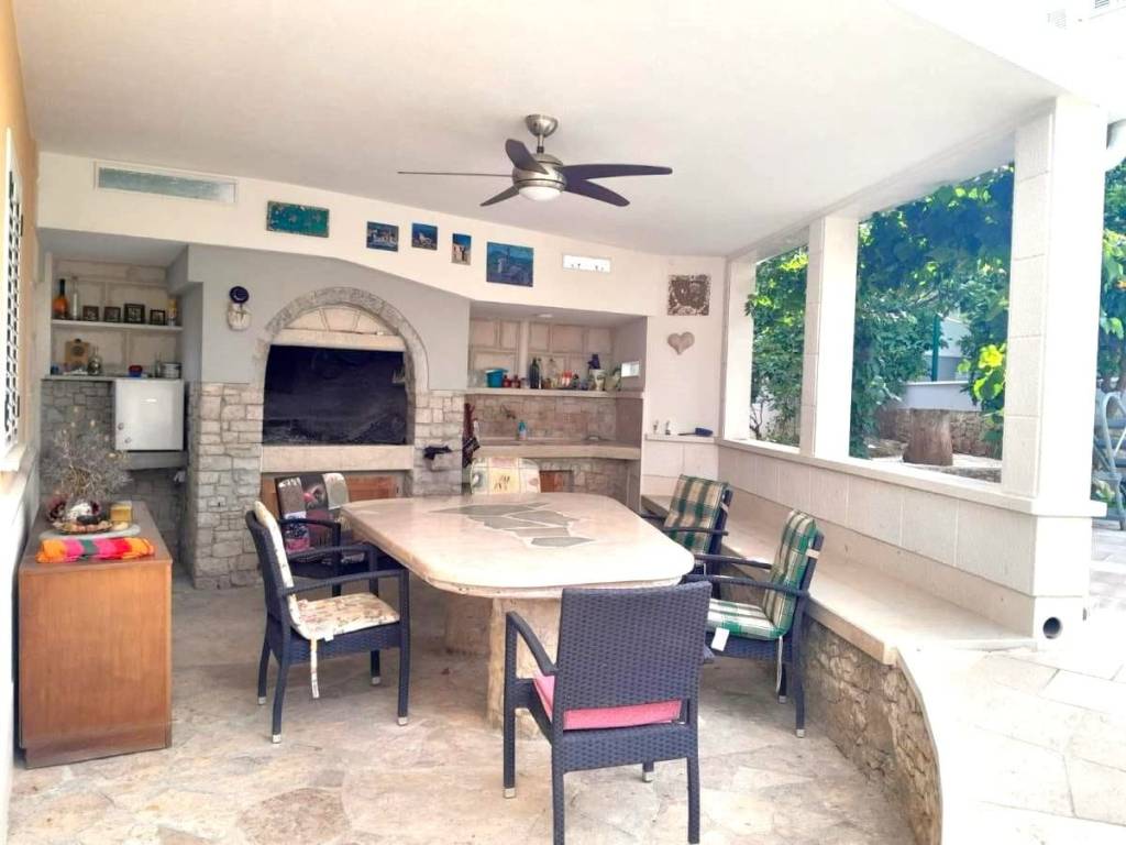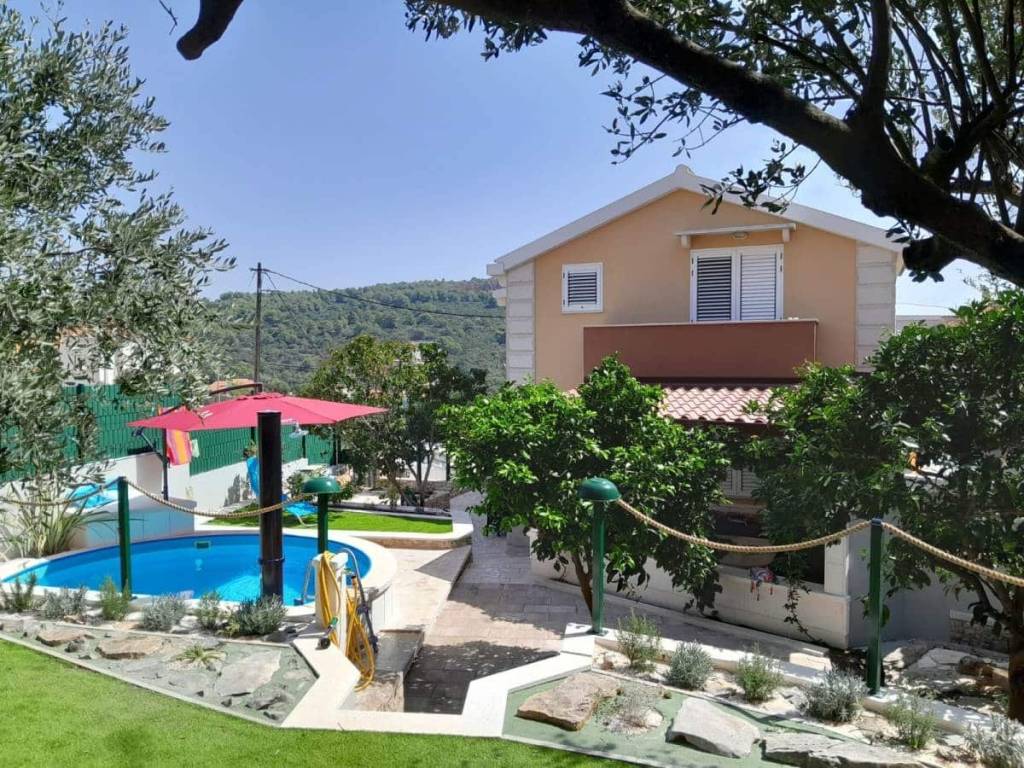 This detached house is located on the south side of the island of Čiovo. The house has 106 m2 of living space on two floors and is located on a 400 m2 plot, 200 m from the sea.The house has two residential units that are connected by an external staircase. The ground floor apartment has 53 m2, a bedroom, a living room with kitchen, a bathroom and a covered terrace of 24 m2 with a grill and sink.The apartment on the 1st floor also has 53 m2, two bedrooms, a kitchen with living room, as well as a bathroom and two approx. 5 m2 balconies.There is a 12.5m2 pool in a Mediterranean garden. There are storage spaces of approx. 10 m2 in the basement and in another small building.The house has three parking spaces.About the renovation: In 2021, in addition to the interior, the facade, windows with shutters, power and water pipes were completely rebuilt. The house (8cm) and the roof (5cm) are insulated with Styrofoam. It has several air conditioning units and additional underfloor heating in the bathrooms and living rooms. The sewer connection is already in place. The driveway will soon be asphalted and ends at the house. The subsequent footpath takes you to the center of Okrug Gornji. The house is selling unfurnished.It is 9 km to Split Airport, 5 km to Trogir and 200 m bealine to the sea.