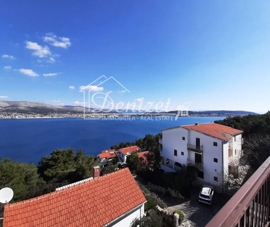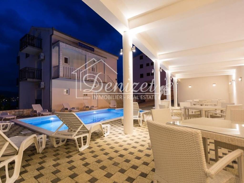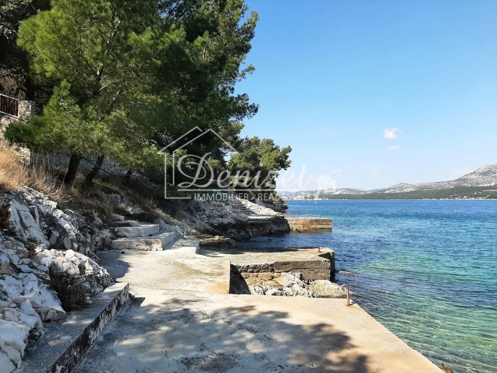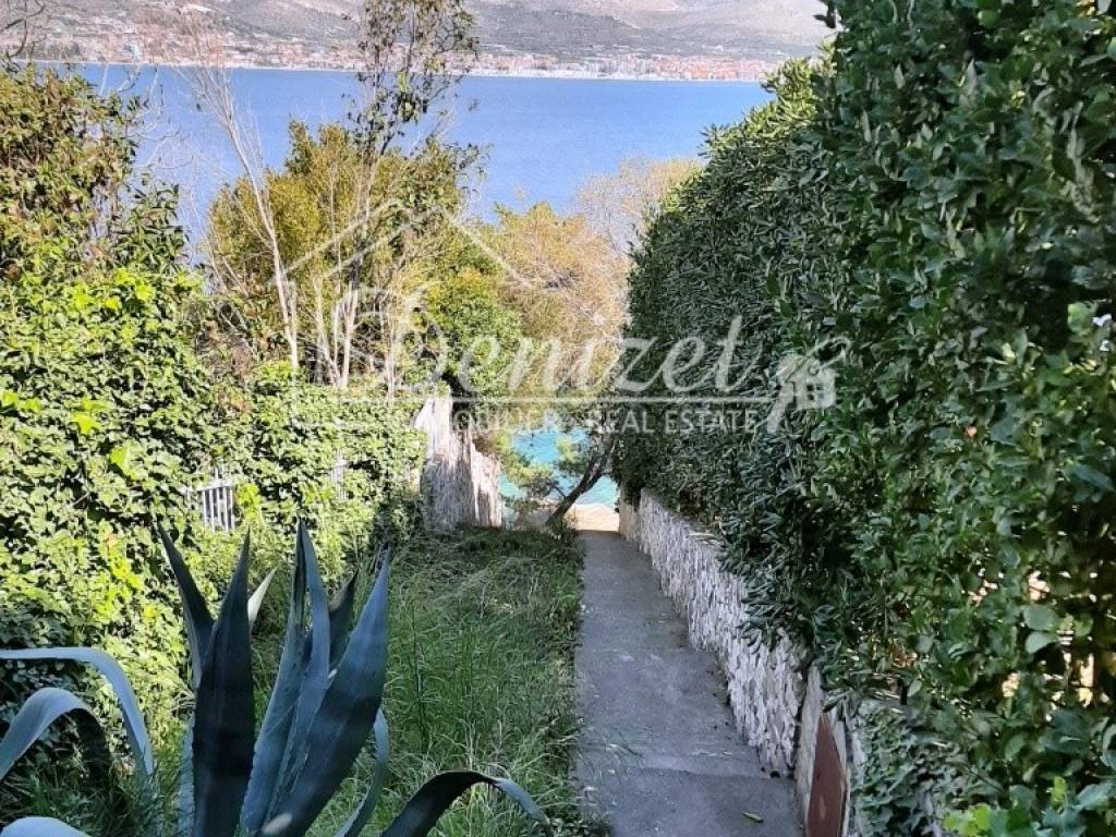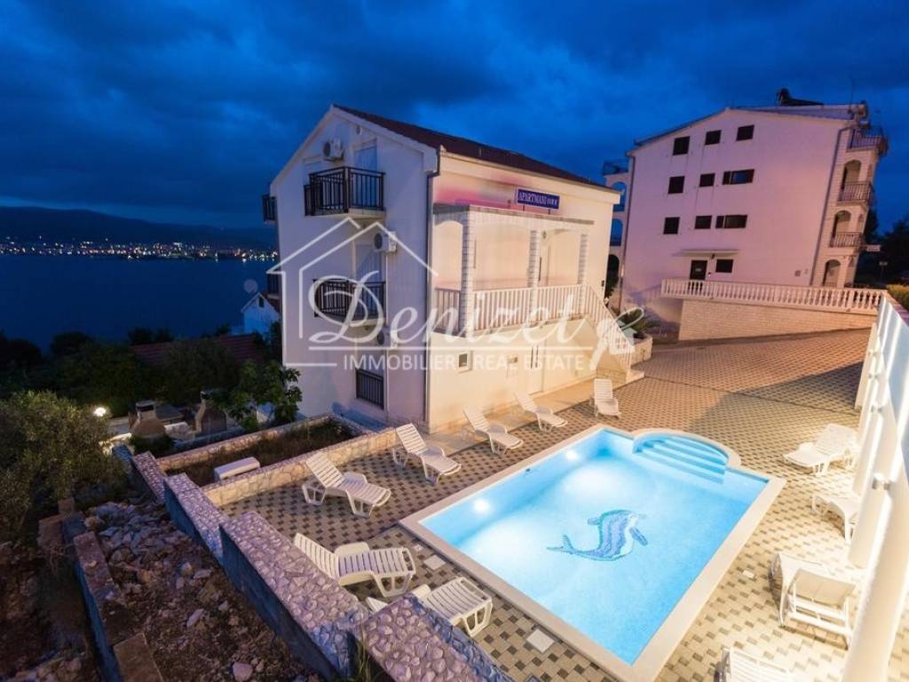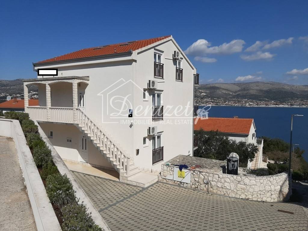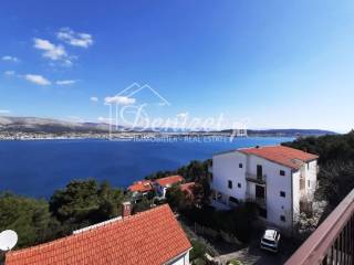The house has a total built-up area (including the actual area of the balcony, staircase and front entrance) 294 m2 + storage building area 8.60 m2 + an open-plan garage with a construction area of 38.80 m2 (height 3.30m). House is located on a plot with a total area of 678 m2. Levels: ground floor, two floors and a high attic (height of house 9.90 m), a total of seven separate, furnished apartments. The apartments are fully equipped and functional, and are used for seasonal rental. On the ground floor there is an apartment with one bedroom, kitchen/dining room and bathroom. There are two two-bedroom apartments on the first and second floor (each: two bedrooms, living room/kitchen, bathroom, balcony). On the top floor in the high attic there are two one-bedroom apartments (each: bedroom, bathroom, kitchen/living room and balcony). On the south side of the house there is a beautifully decorated heated pool of 32 m2 with a sun deck, while in front of the house there is a nice spacious terrace with deck chairs. In one part of the plot (west part) there are two BBQ and large tables for social gatherings. Stone slabs have been placed around the house, the stairs are covered with stone of Brac. The carpentry on the house is PVC, and the carpentry inside the apartment (doors) is wooden. The house has a thermal facade. Heating and cooling is via reversible air conditioners installed in each apartment. The floors of the rooms in the apartments are made of parquet, and the kitchens, dining rooms and bathrooms are covered with ceramic tiles. Construction of the house began in 1990 (only the ground floor), and the rest of the house was reconstructed in 2004. The facility has 7 parking spaces. The house is sold fully furnished and equipped. The distance from the sea is 4 minutes' walk, where there are private, concrete beaches, and ten minutes' walk from the house there is a well-kept pebble beach, with a cafe and a restaurant nearby. The center of Okrug Gornji is only 5 km away. There is public transportation near the house, the bus stop is 100 m from the house. In the summer season, there is an island boat line that goes to the UNESCO city of Trogir and the nearby settlement of Seget Donji. This house is suitable for carrying out tourism activities, butalso like a family villa for living, given its location, the house offers the possibility of an ideal holiday in a quiet part of the island, yet within easy reach of all necessary commercial activities. Beautiful view of the sea. Distance from international airport Split 12 km.