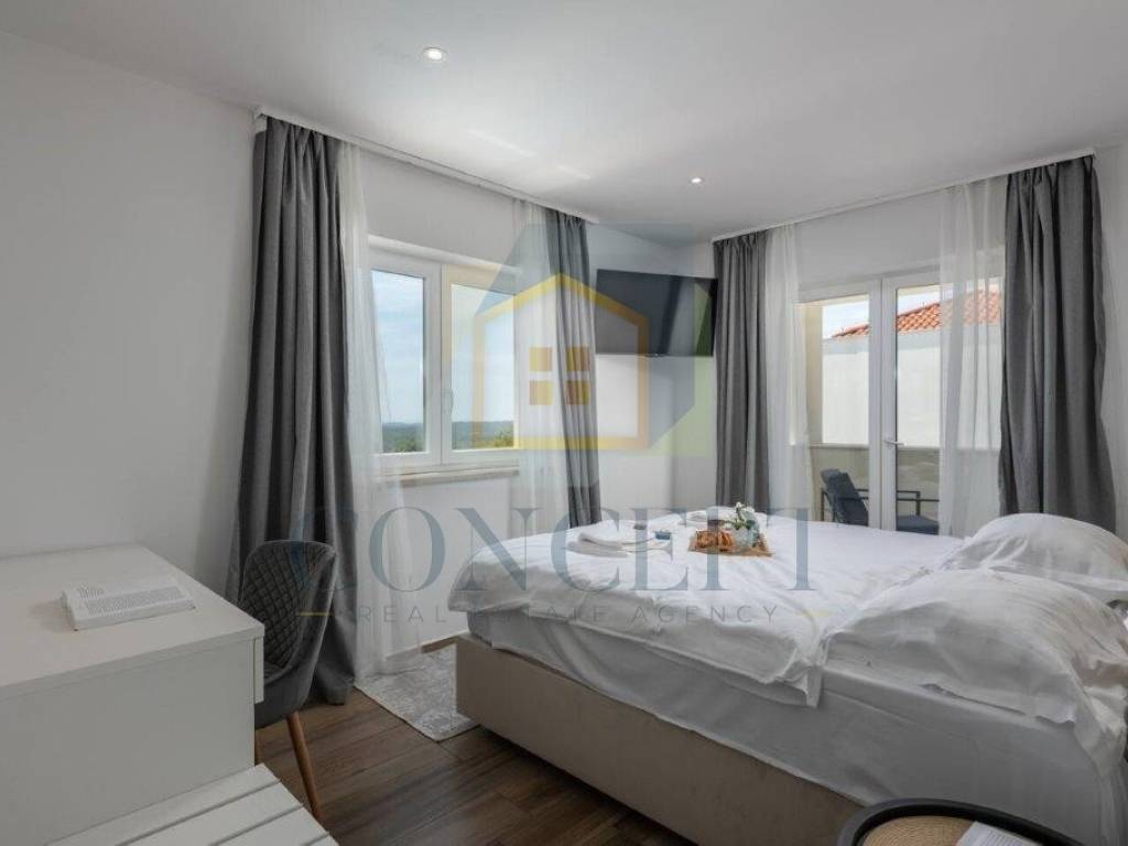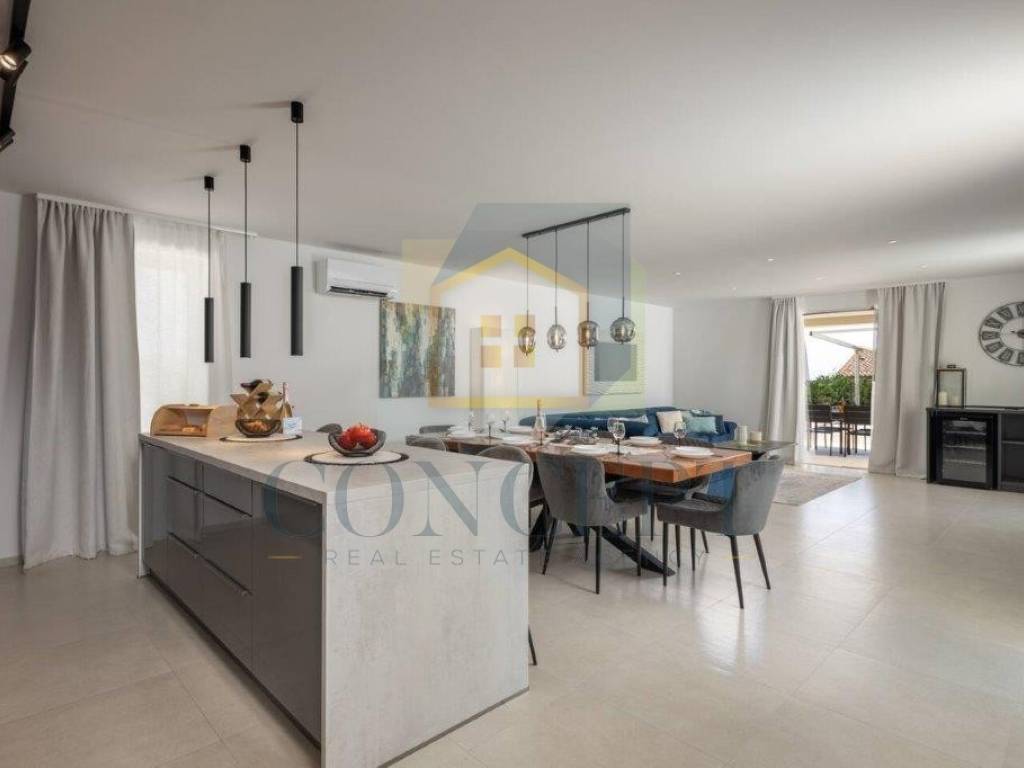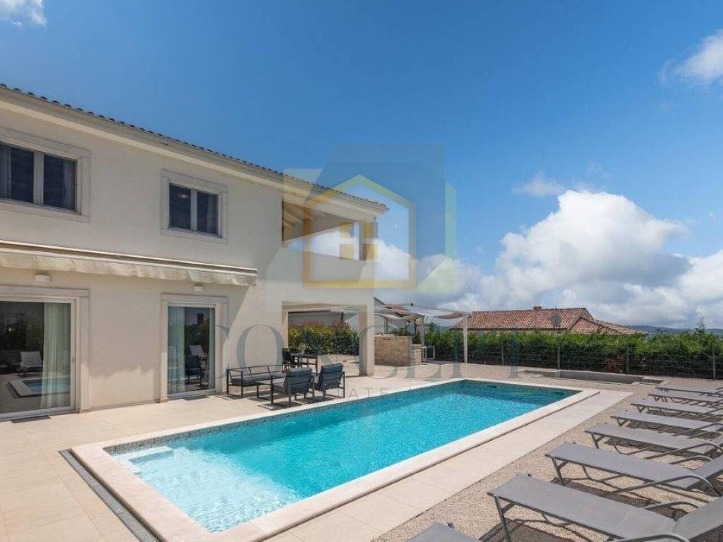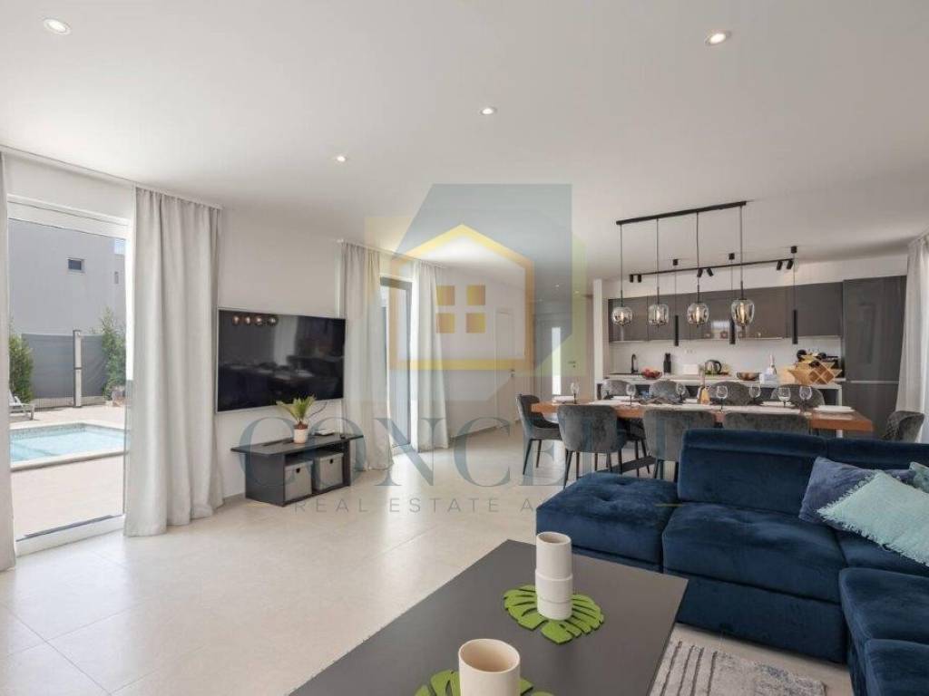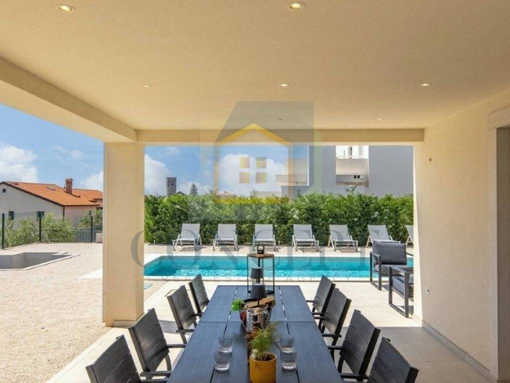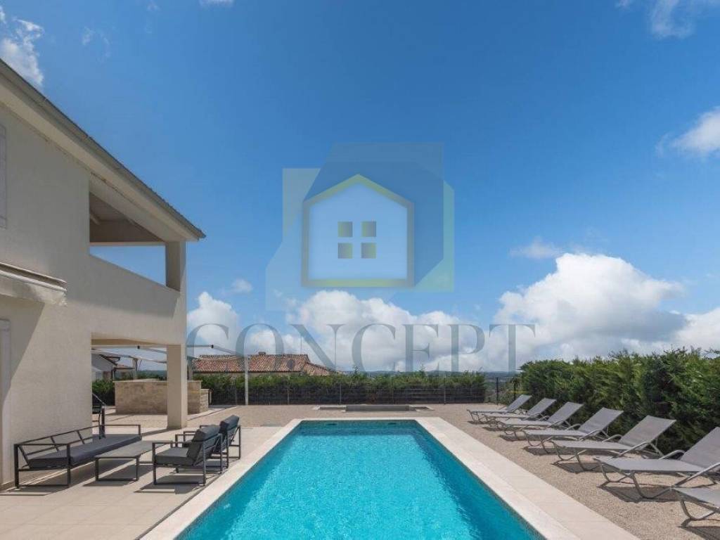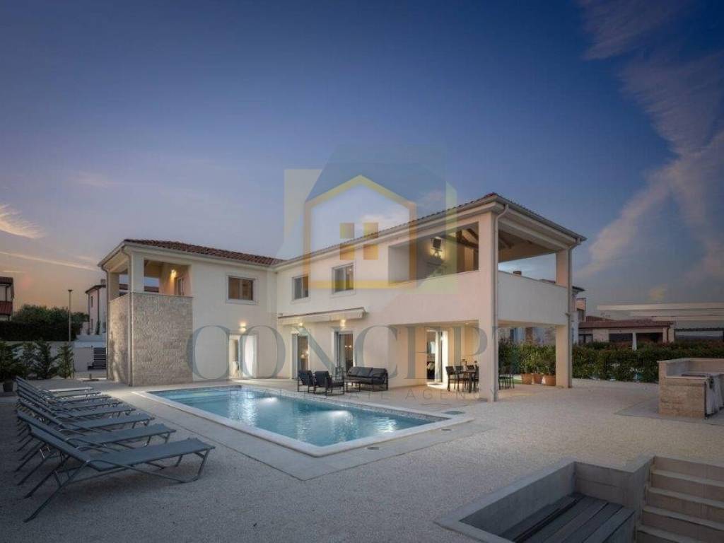 For sale is a beautiful detached villa with a swimming pool located in Sveti Lovreč, situated in a quiet and newly built neighborhood, just 300 meters from the town center, school, kindergarten, and shops. The house was built in 2021 according to modern construction standards, with a total living area of 292 m distributed over the ground floor and first floor.
