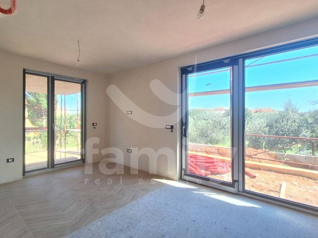 In a quiet part of Banjole, there is the aforementioned modern and high-quality new construction of a small residential building by a proven investor with a total of 8 residential units. The aforementioned apartment of 64.26 m2 is located on the ground floor and consists of an entrance hall equipped with a burglar-proof entrance door, one bright and comfortable bedroom with access to a terrace and garden, a spacious living room connected to an open space concept kitchen and access to a terrace and garden of 9,63 m2, as well as a bathroom equipped with a Geberit built-in cistern, a walk-in shower, installed installations for a washing machine and an Ariston boiler. The floors throughout the apartment are covered with high-quality ceramics, and the bedroom has Sherborne wood-imitation ceramics. The heating and cooling system is regulated by two Mitsubishi air conditioning units, one in the bedroom and one in the living room, and electric underfloor heating has also been implemented throughout the building with separate Wi-Fi thermostats in each room. PVC joinery with triple-glazed anthracite glass and aluminum roller shutters with electric lifts have been installed, and an anthracite-colored aluminum garden fence will also be installed. The building is equipped with an 8 cm thick thermal facade on the ground floor, with 2 cm thick Travertino classico stone also installed, which certainly contributes to excellent thermal and sound insulation. The apartment has one uncovered parking space as well as one shared toilet located in the hallway of the building, which will be co-owned by all co-tenants, and the work is scheduled to be completed by the end of 2025.