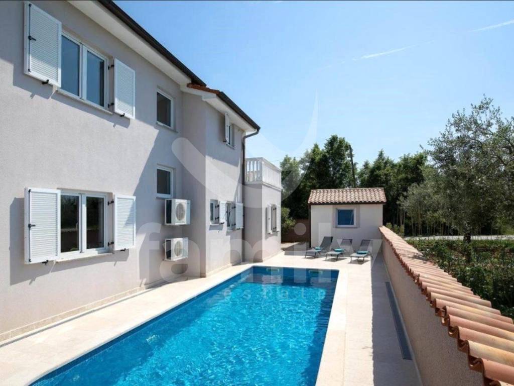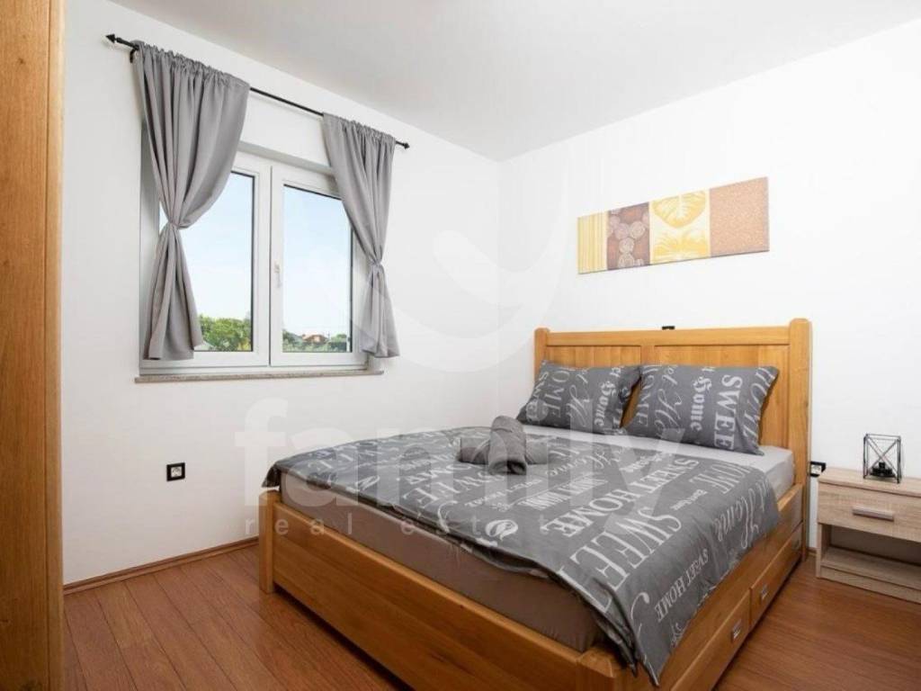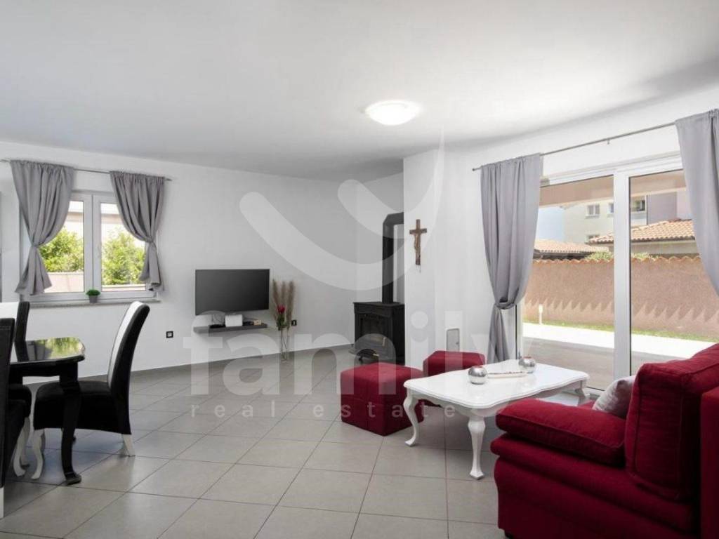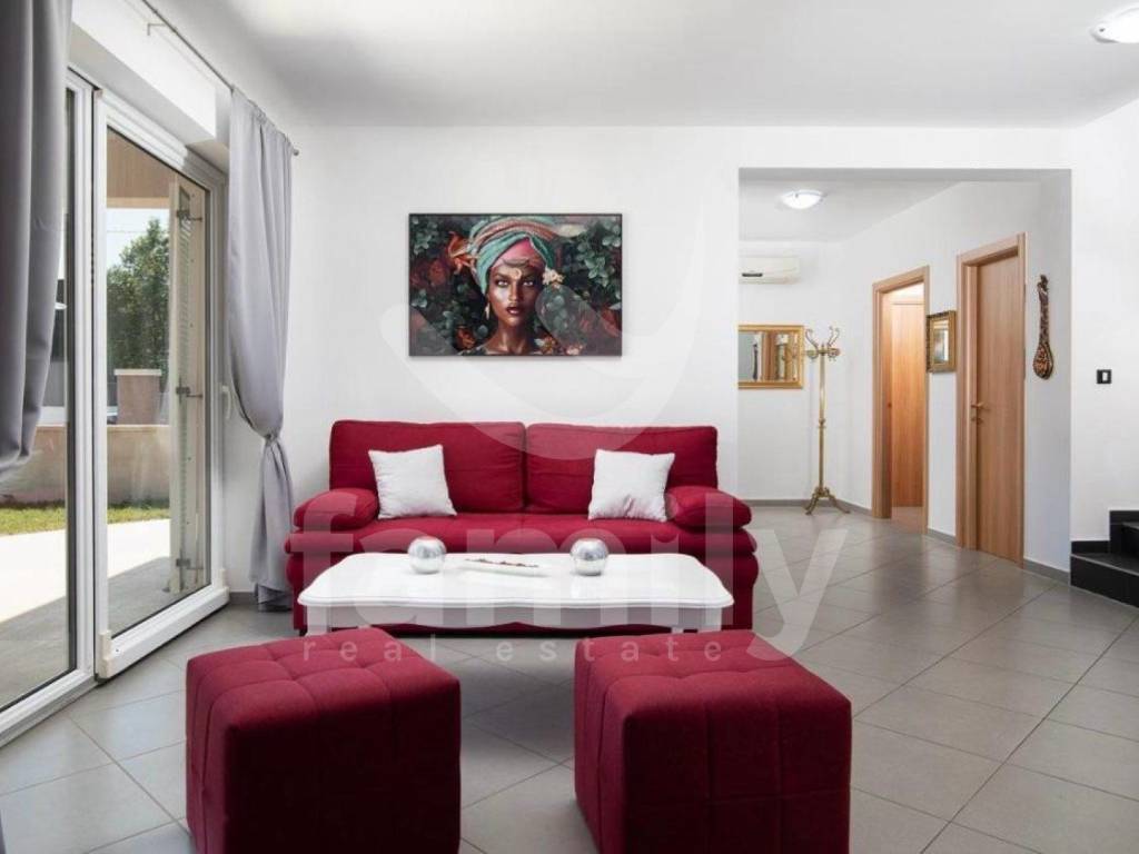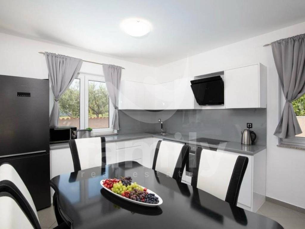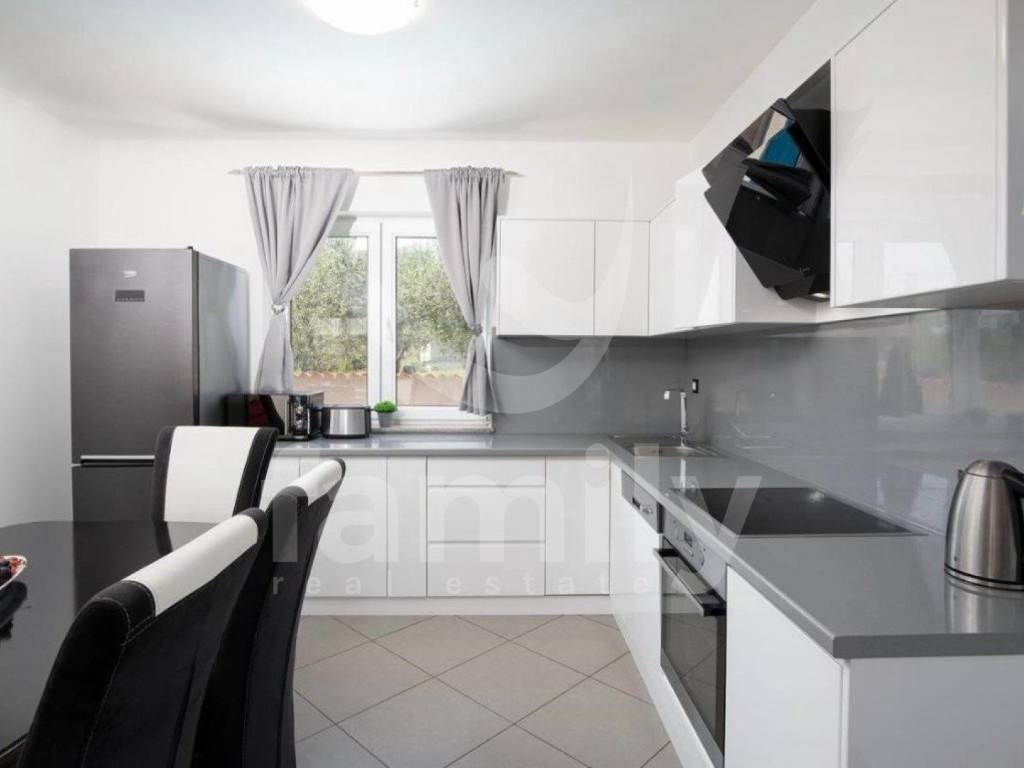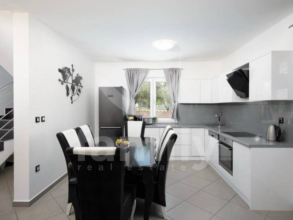 It is in a settlement called Loborika within the Municipality of Marčana that the aforementioned high-quality two-story house with a total area of 130 m2 is located, and it consists of a bright living room with access to a covered terrace equipped with a barbecue and a dining table, a quality kitchen with a dining area, and a guest toilet. An internal staircase leads to the second floor, where there are two fully equipped bedrooms with access to a balcony, as well as two bathrooms. The house was built in 2008 and was completely renovated in 2018. It has access from an asphalt road with three secured outdoor parking spaces and a garage. PVC and wooden joinery is installed throughout the building, the heating and cooling system is regulated by air conditioning and a wood-burning stove located in the living room, while the floors are covered with quality parquet and ceramics.