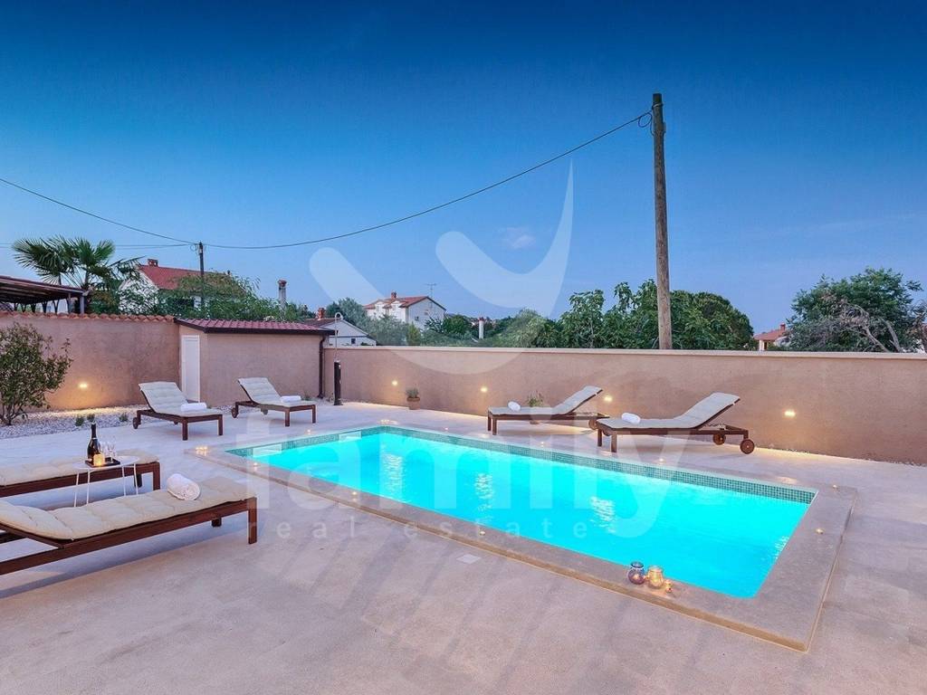 This beautiful villa with an area of 180 m2 on a plot of land of 500 m2 is located in Štinjan, not far from the beaches and the city of Pula. The beautiful villa is spread over two floors. On the ground floor of the villa  there is an entrance hall that divides the property into two sides, on one side there is a beautifully decorated and separate tavern with a fireplace and a space for socializing, while the second part of the ground floor is an open concept living room with a dining room and kitchen, a room that is used as a laundry room, a bedroom with a bathroom and a guest toilet. On the first floor there are three more bedrooms, one with its own bathroom, while the other two rooms share a common one. In addition to the bedrooms, on the first floor there is a beautiful terrace overlooking the pool and the surroundings. The property is equipped with PVC joinery and air conditioning in every room. The front of the property includes two parking spaces and a green area, while on the back there is a 25 m2 swimming pool, a sunbathing area, a storage room and a beautiful terrace.