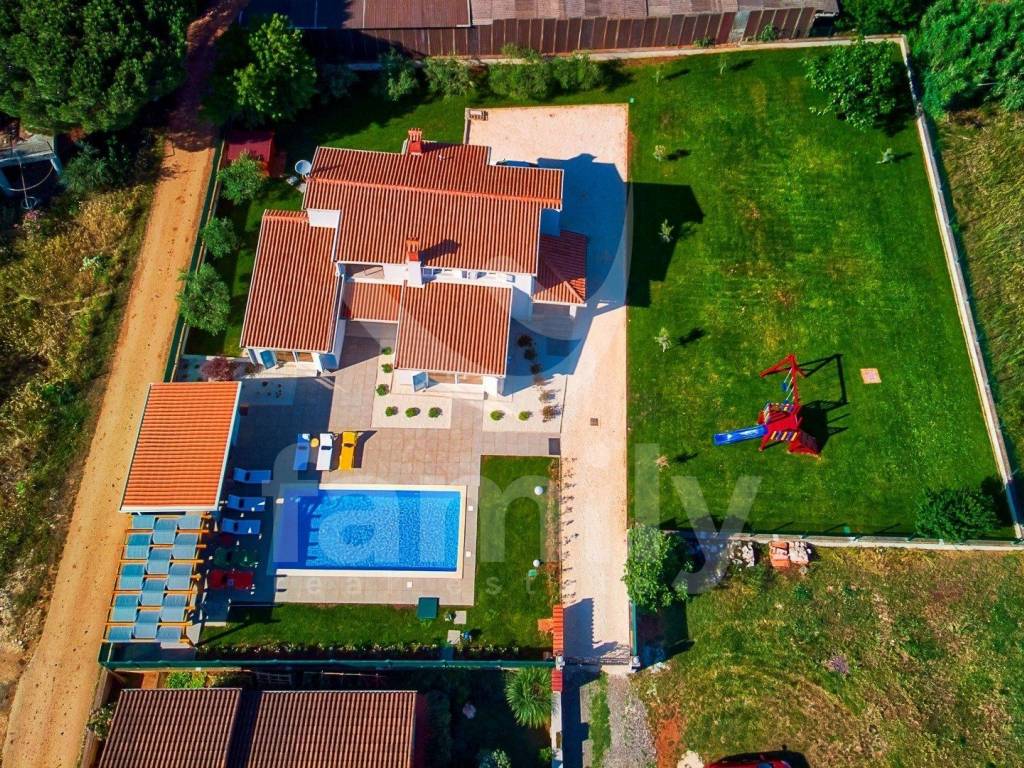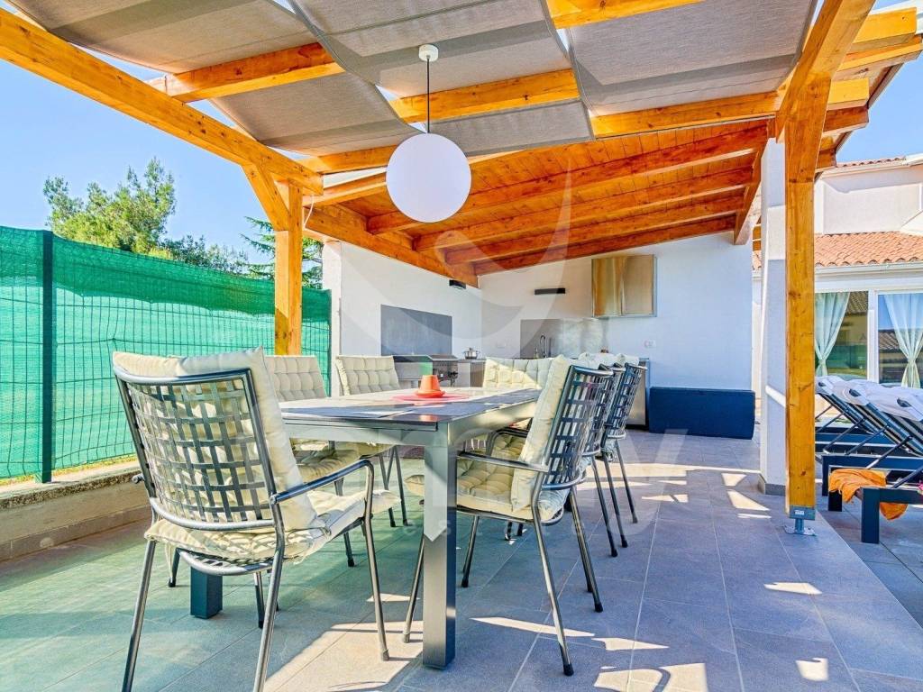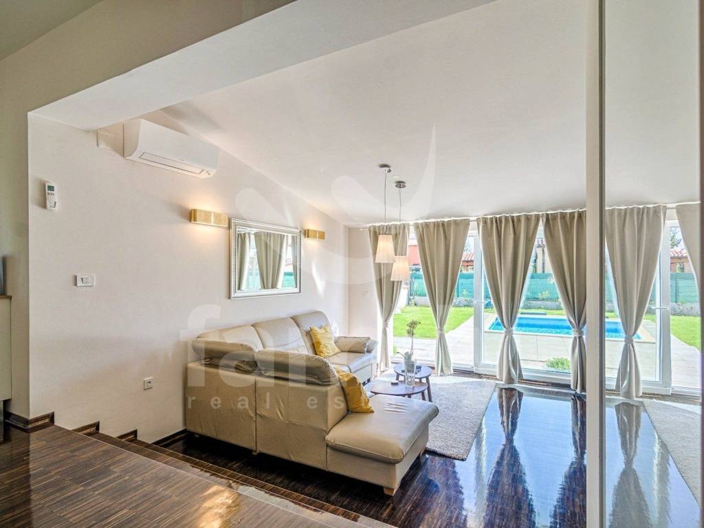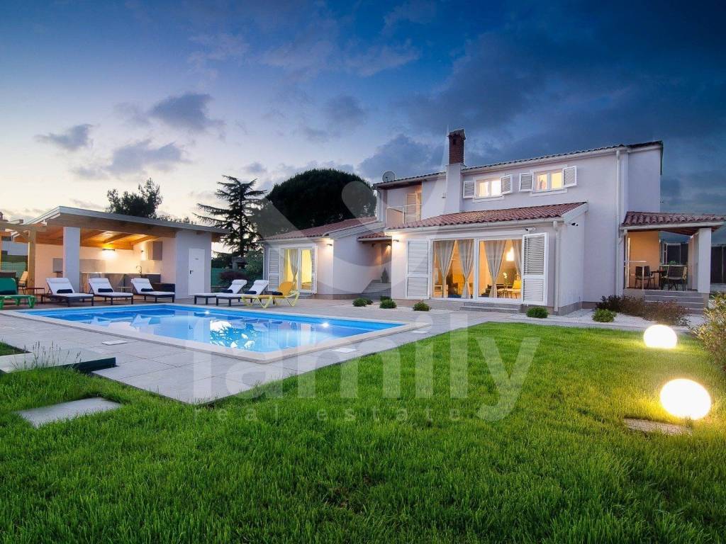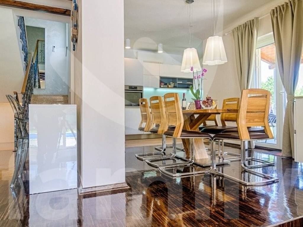 This beautiful villa of 226 m2 with a garden of 1366 m2 is located in a quiet village within the municipality of Fažana. It extends over three floors, and in the basement there is a space that can be converted according to the wishes of the future owner, a sauna and a social area, while on the ground floor there is a real oasis of peace in the form of an open concept living room with dining room and kitchen from which you can exit to a spacious sundeck and a beautifully landscaped garden, two bedrooms each with their own bathroom and a guest toilet. On the first floor there is a laundry room and two spacious bedrooms also each with their own bathroom, and one of them has access to a covered terrace overlooking the pool. The house is equipped with high-quality PVC joinery, while each room is provided with an air conditioning unit, and the rooms within it are furnished and mostly custom-made. There is a secured chimney in the property and the possibility of installing a heating stove. The courtyard of this unique villa offers a summer covered kitchen, a sundeck, an outdoor toilet, a heated swimming pool of 36 m2, a covered terrace. The entire garden is automatically irrigated with natural water from a well.
