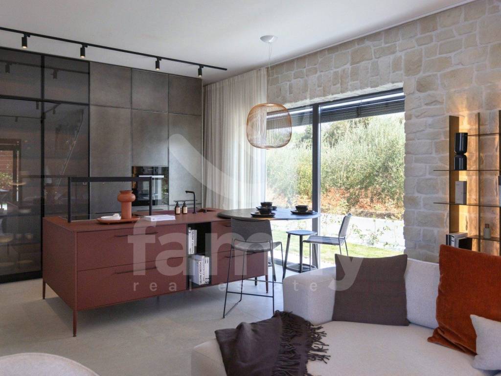 Not far from Poreč in a quiet village is located this spacious, luxurious and authentic villa of 165 m2 on a plot of 585 m2. This prestigious property extends over two floors, on the ground floor there is a spacious open concept living room with dining room and a modern and designer kitchen in which there are built-in quality Miele household appliances, a toilet, a bedroom with a bathroom, a technical room, while on the first floor there are two more bedrooms, each with its own bathroom and one of them has an exit to a terrace with a view of the sea. The property is extremely well equipped and every detail has been taken care of. The heating and cooling system is regulated by air conditioning in each room, and it also has underfloor heating via heat pumps. The floors throughout the house are covered with high-quality Italian ceramics, while the joinery is three-layer - aluminum with PVC shutters and mosquito nets, and on the ground floor there are also roller shutters with electric lifts. The yard is meticulously maintained and there is a spacious and beautiful covered terrace that can be accessed from the living room, a sundeck, a summer kitchen, a heated pool of 40 m2. The villa is owned by the company and the price shown is without VAT.