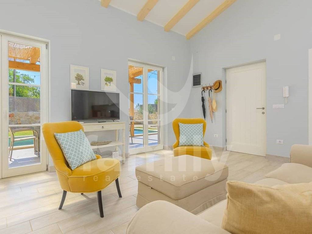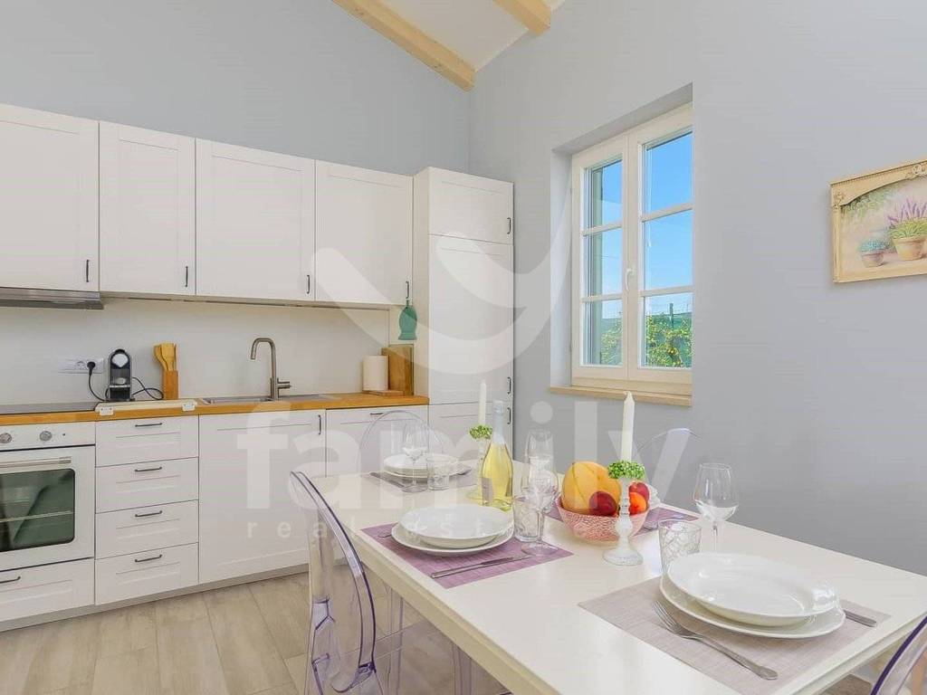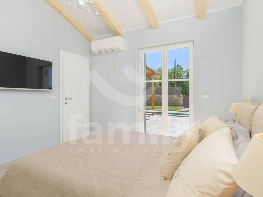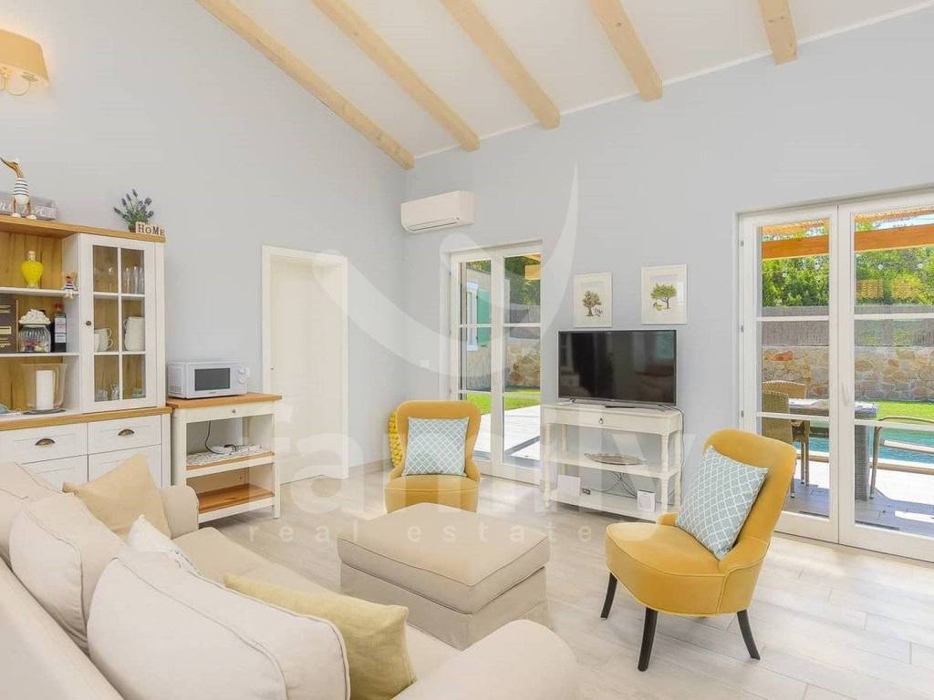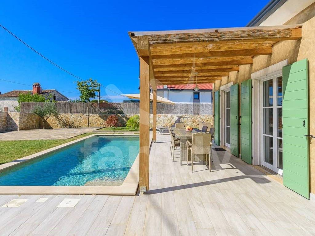 Not far from Rovinj, only a ten-minute drive away, in a quiet and luxurious village, there is this spacious, authentic villa with a total area of 110 m2 and a garden of 400 m2. The main part of the villa consists of a spacious living room that is beautifully lit and has access to a covered terrace and garden, a dining room and kitchen, two bedrooms with en-suite bathrooms and next to it there is another building of approximately 20 m2 with a bedroom and bathroom. High-quality PVC joinery has been installed, and the heating and cooling system is regulated with air conditioning units in each room and room. During the furnishing of the property, attention was paid to every detail, and beams were installed in the rooms, and the furniture is in a modern - rustic style for additional charm of enjoying the Istrian touch. The yard has been meticulously maintained and there is a heated swimming pool of 24 m2 as well as a covered sunny terrace, a sunbathing area, a barbecue and an outdoor sink, all enclosed by a stone dry stone wall.