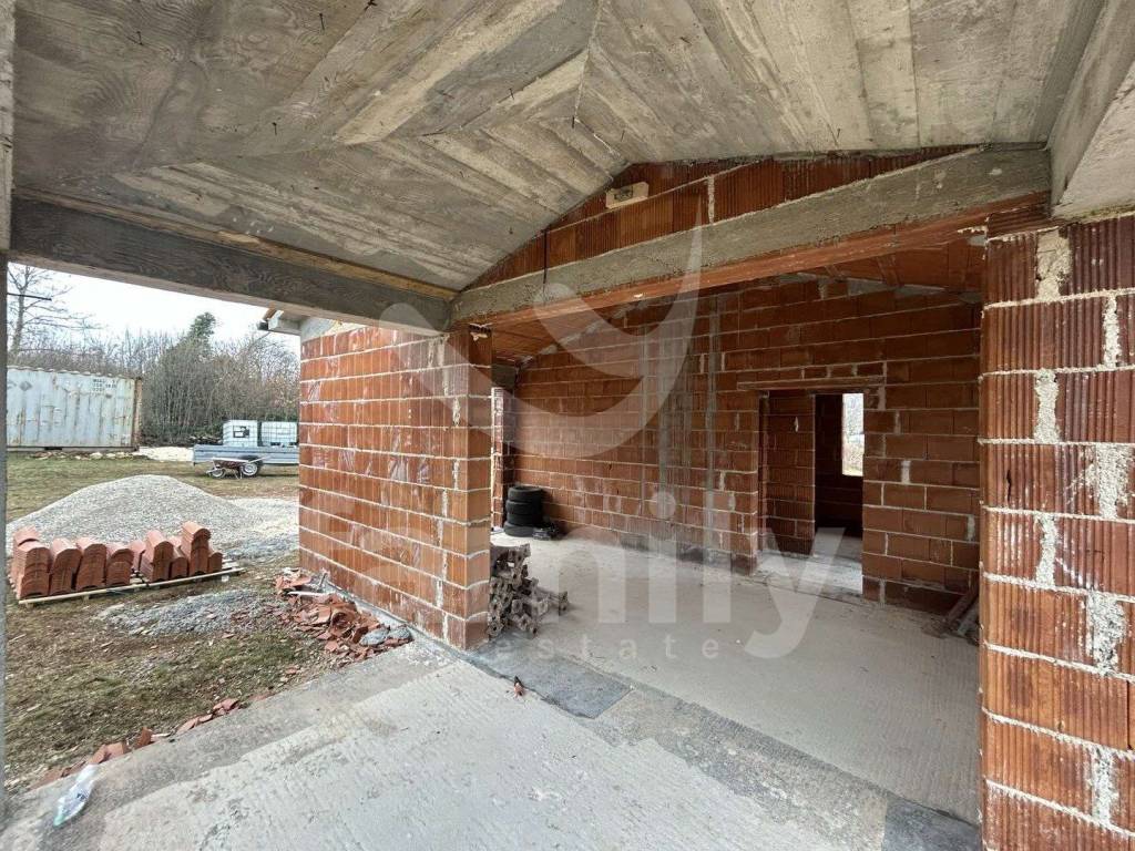 Right in the municipality of Svetvinčenat, not far from the town of Vodnjan, in a small settlement in a quiet location, this detached single-storey house in a new building with a gross area of 55.38 m2 with a garden of 630 m2 is for sale in the ROH-BAU phase. The house consists of an entrance hall, bedroom, living room with kitchen and dining room, bathroom and covered terrace. Construction began in 2024, and the project includes a swimming pool in the yard of the house. Utility contributions and electricity connection have been paid.