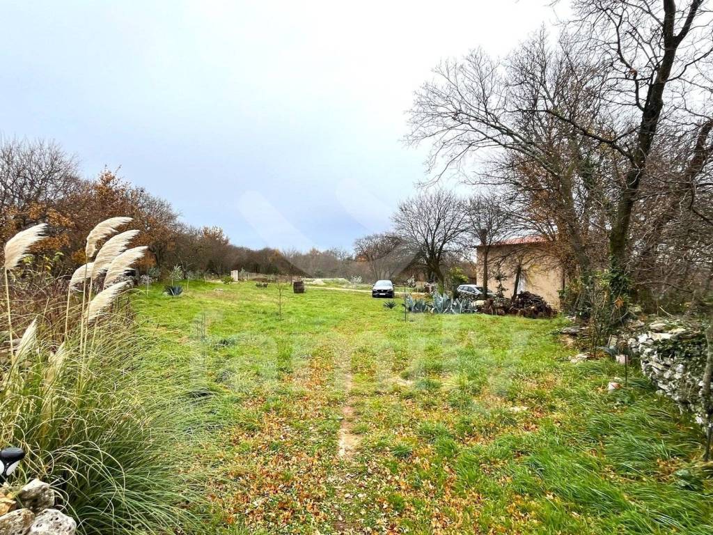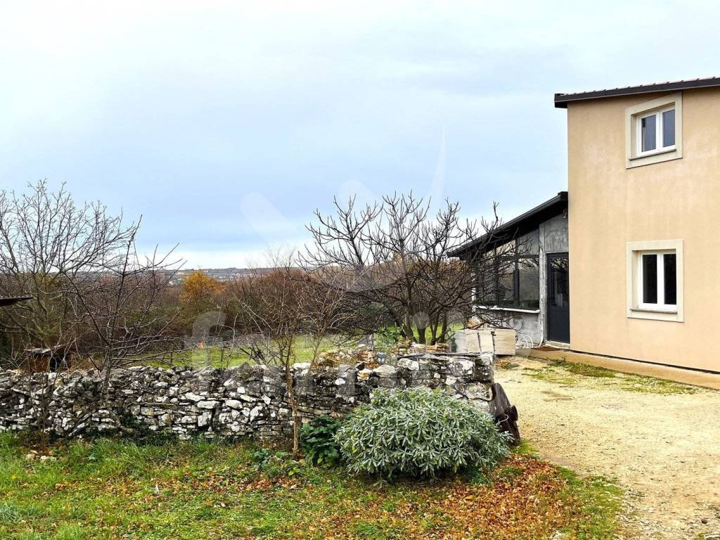 In a small settlement located on a hill within the municipality of Marčana, in a quiet location where we are separated from busy roads, there is this wonderful property that covers more than 3770 m2. The distance from the sea is only 5 km. The house has a total area of 150 m2 and extends over the ground floor and first floor. On the ground floor we have a living room with a kitchen and dining room, a bathroom and a closed terrace. There are two bedrooms and a bathroom on the first floor. The house is equipped with white PVC carpentry, while the covered terrace is closed with ALU carpentry. A wood-burning stove is used for heating, and an air conditioner is used for cooling. The house is sold furnished. The land is for construction purposes.