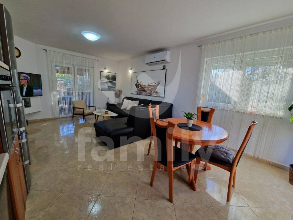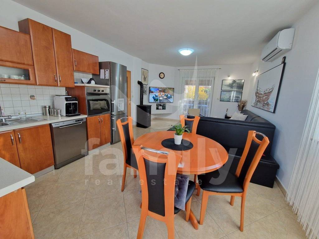 The second house is a single-storey house with an area of 90 m2 and consists of three bedrooms, a spacious and bright living room with a kitchen and a dining area, a bathroom, a corridor that shares all these rooms, and a spacious terrace. Parquet is installed in two rooms, while tiles are found in other parts of the house. It is sold furnished with all kitchen elements, household appliances, washing machine and dryer, dishwasher, refrigerator, etc. PVC joinery has been installed in the house, while heating and cooling are regulated by a wood stove and with three air conditioning units and are prepared installations for central heating, which makes it easier for the future owner to implement the same. This house has the possibility of raising a floor since the utilities for the floor have been paid. The house has a thermal facade, which makes it more energy efficient.