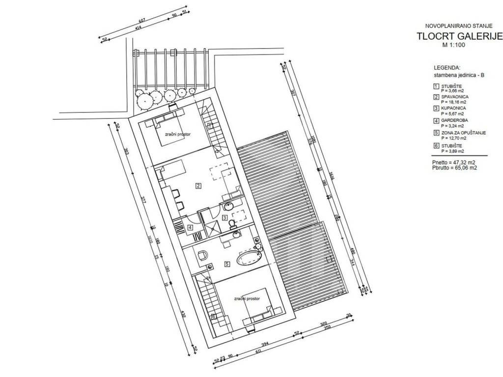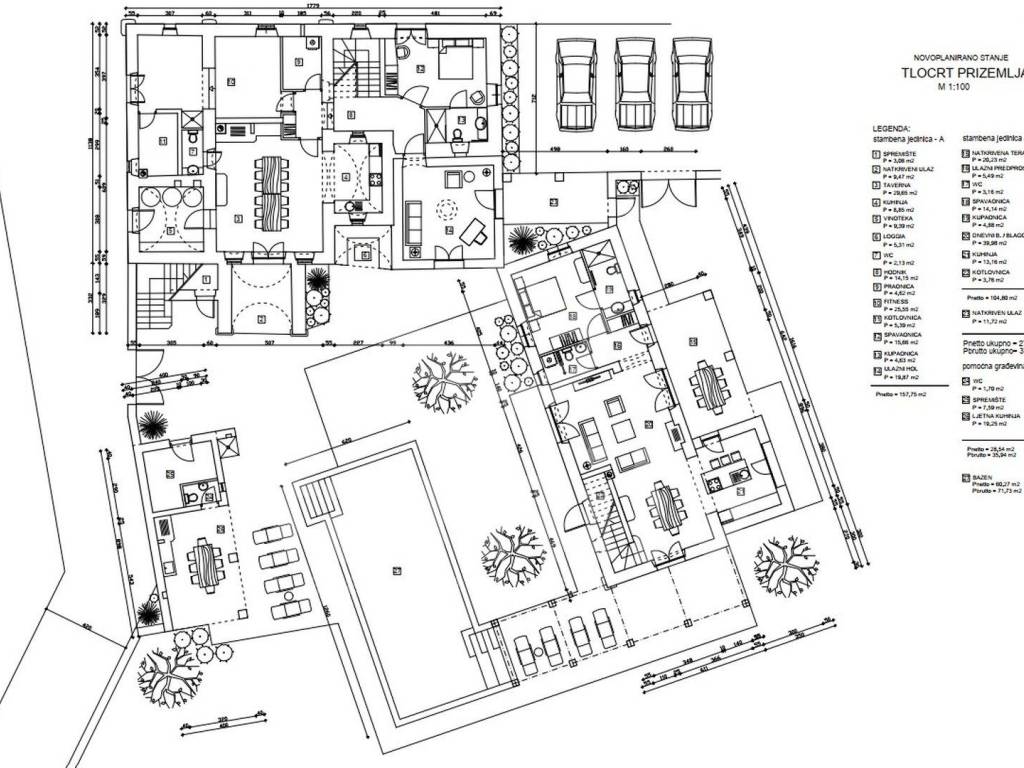The current project includes: The ground floor of the building where there is a covered entrance, two kitchens, a tavern, a storage room, a wine cellar, two toilets, two bathrooms, a laundry room, a fitness room, a boiler room, a living room with a dining room, two bedrooms with an auxiliary building that would be a summer kitchen with a storage room and toilet. The first floor would consist of a hall, a living room with a dining room, a kitchen, a space with a fireplace, a covered terrace, a terrace with a patio, six bedrooms, one toilet, four bathrooms. In the attic of the property, there would be a gallery that would consist of a staircase, a bedroom, a bathroom, a dressing room, and a relaxation area.